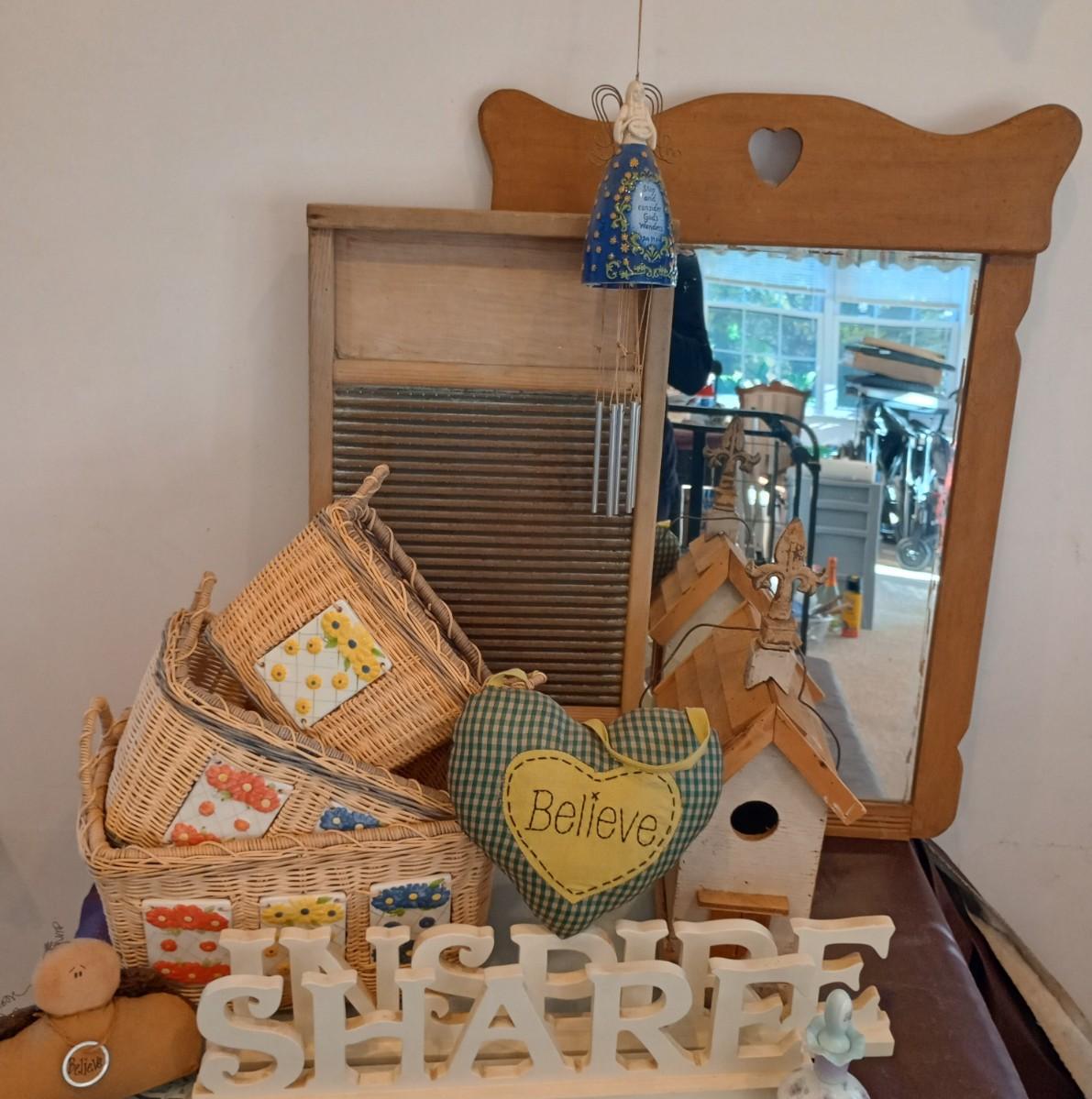 LOT 21P: Wooden Washboard, Mirror w/ Heart Cutout, Baskets, BirdHouse, and Lots More