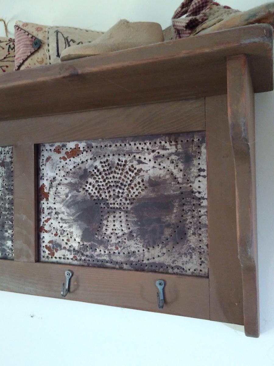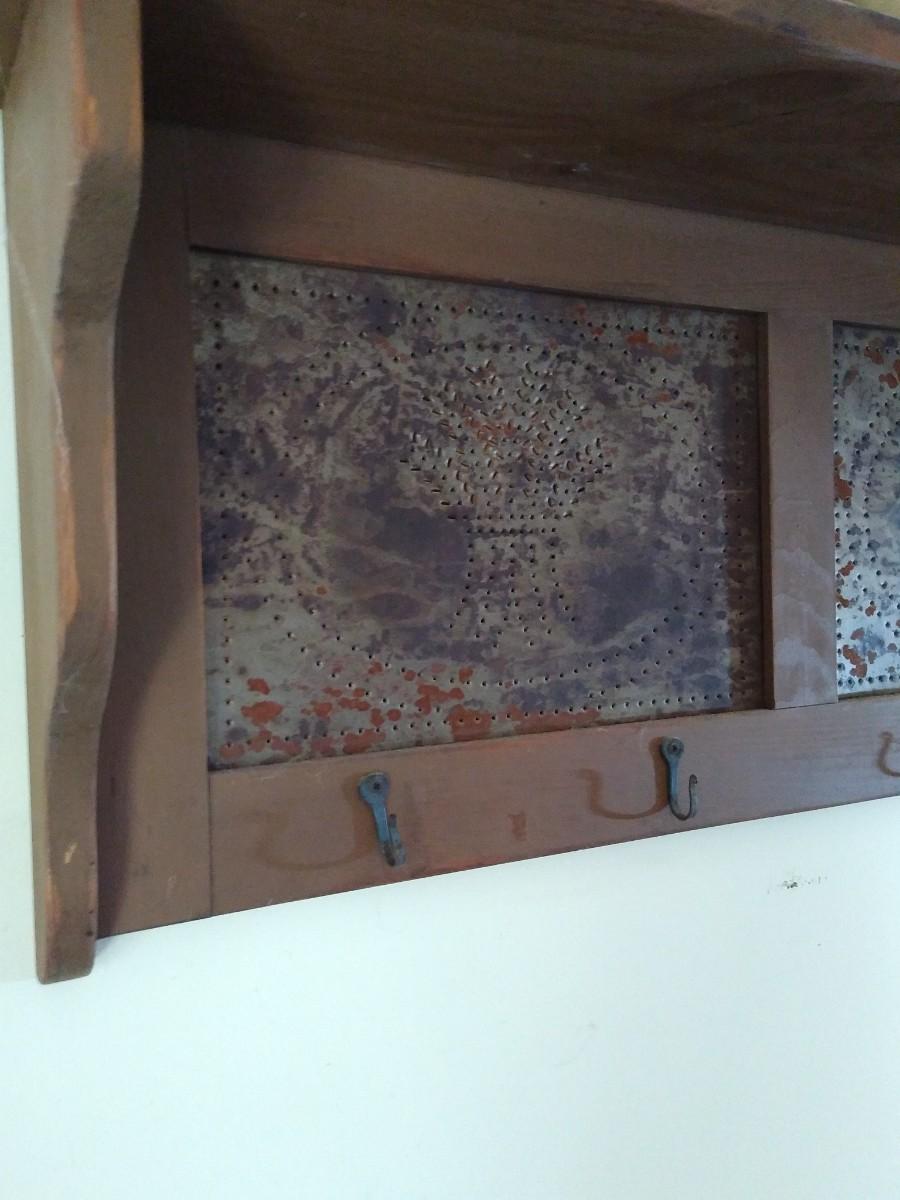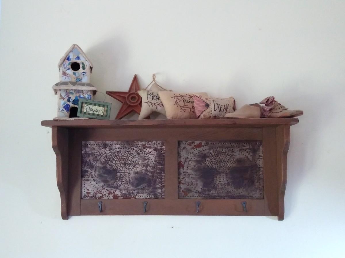 LOT 84L: Primitive Collection- Wooden Shelf with Punched Tin Design, Mosaic Bird House & More