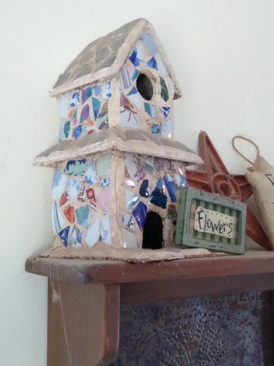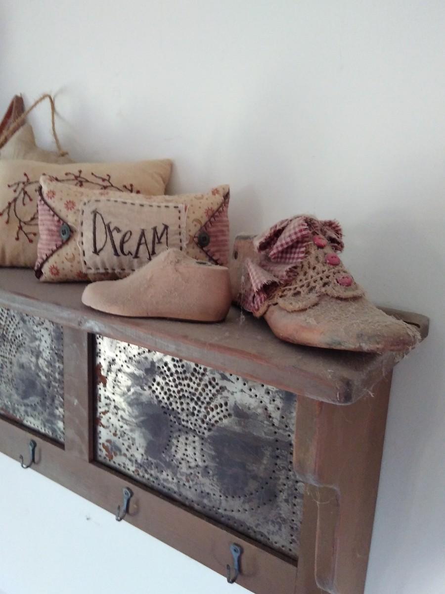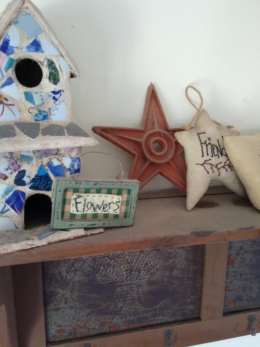 LOT 84L: Primitive Collection- Wooden Shelf with Punched Tin Design, Mosaic Bird House & More