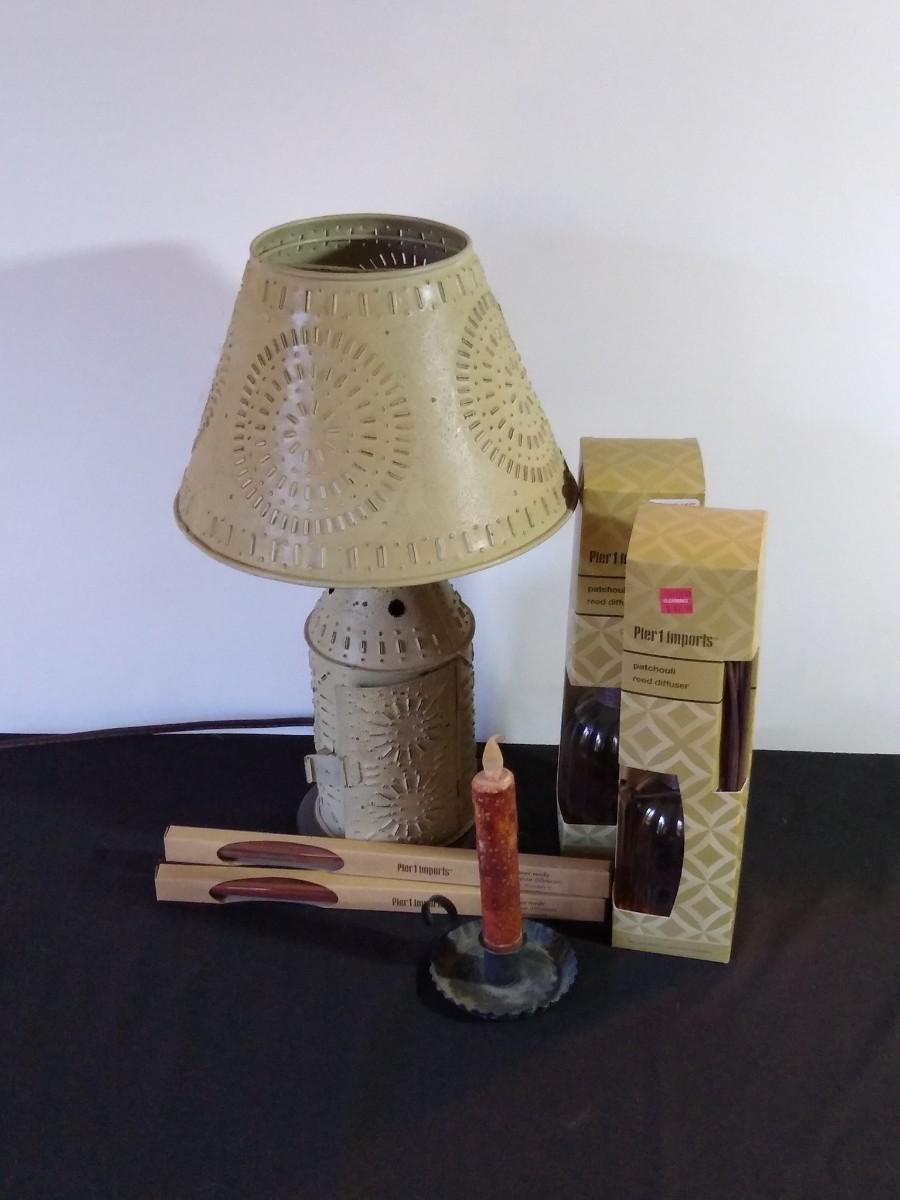 LOT 85L: Primitive Style Punched Tin Lamp with Reed Diffuser Sets & More