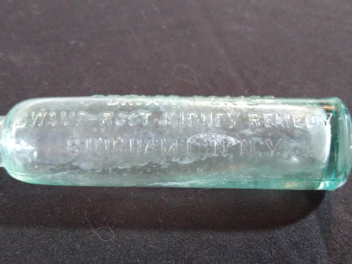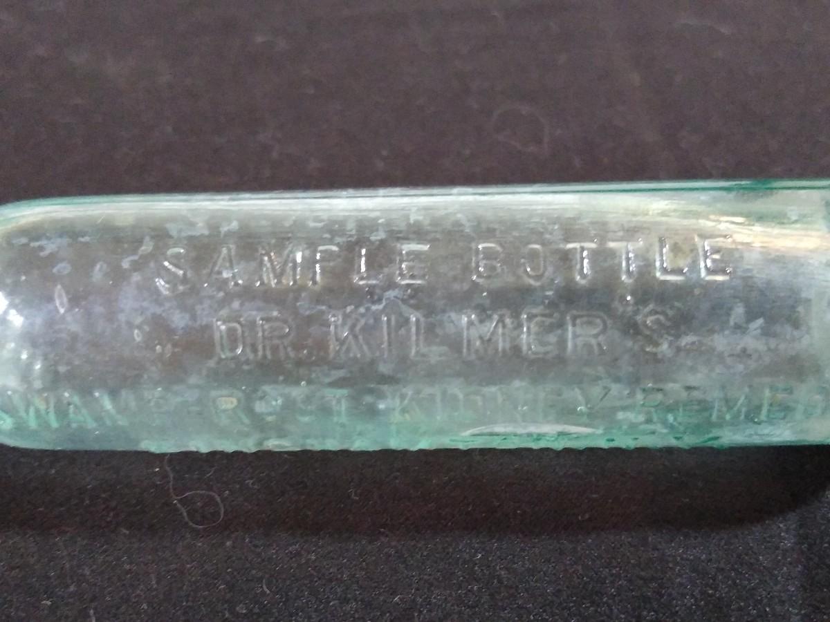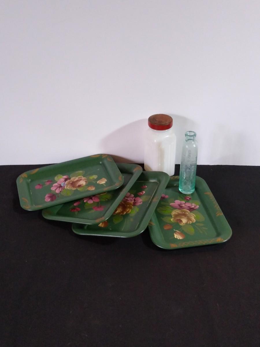 LOT 87L: Dr. Kilmer's Swamp Root Kidney Remedy Glass Bottle, Milk Glass Spice Jar & Hand-Painted Trays