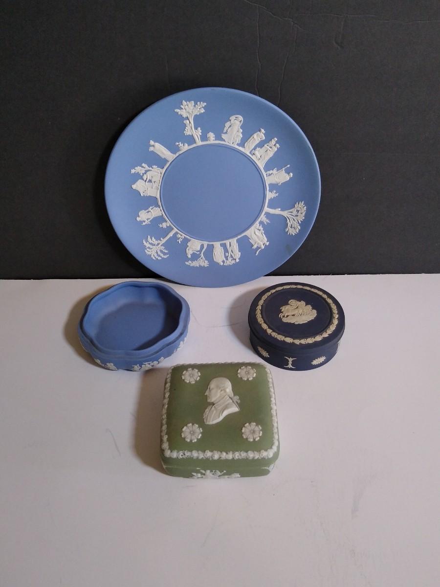 LOT 138D: Vintage Wedgewood Jasperware Blue and Green Trinket Boxes & Dish