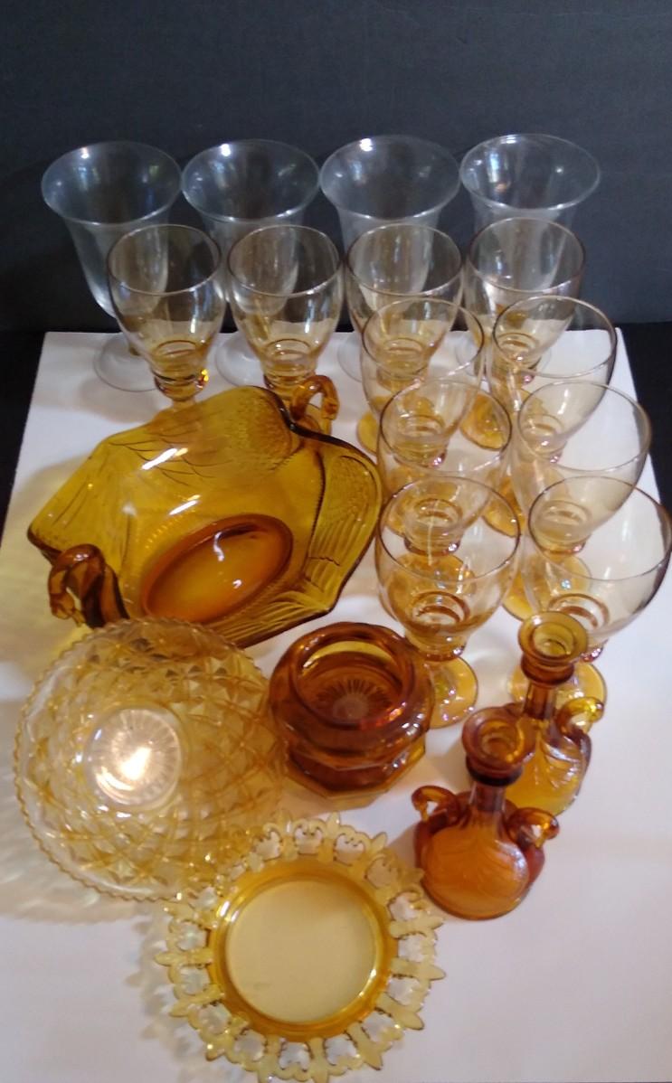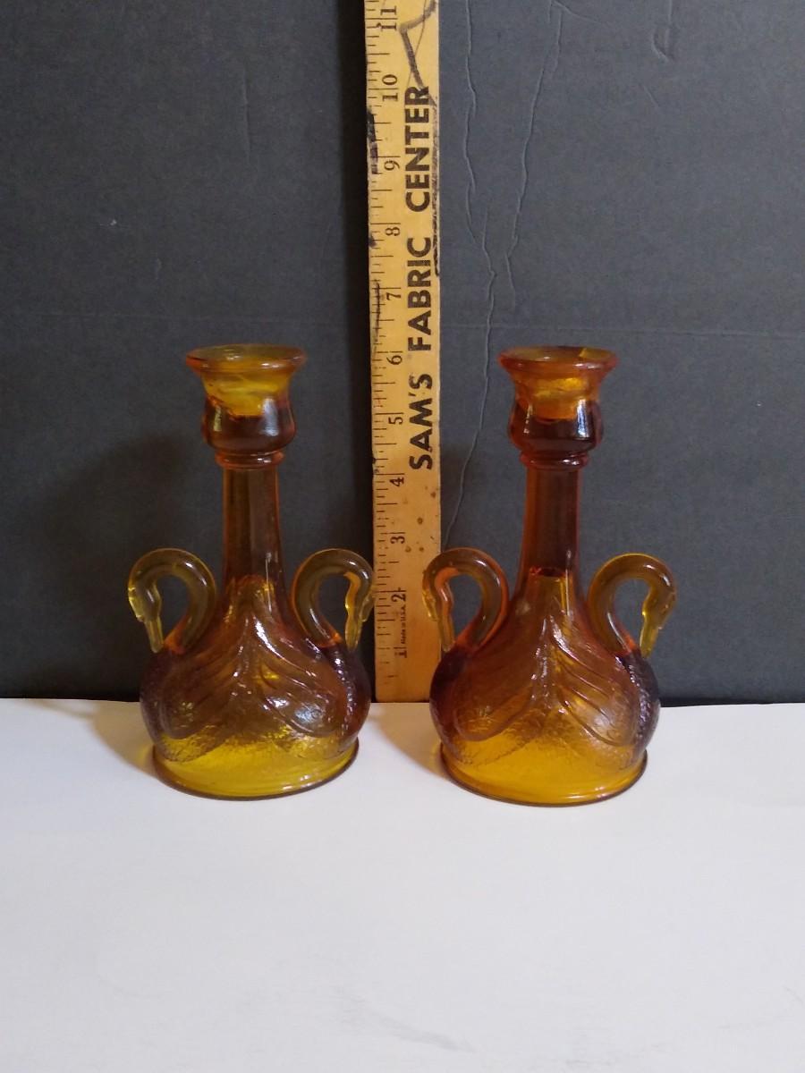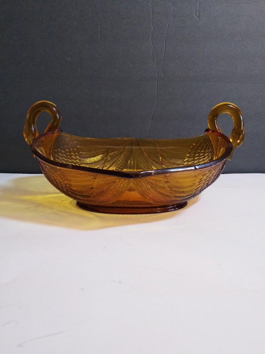 LOT 143D: Amber Glass Collection- Fenton Double-Handled Swan Bowl & Candlestick Holders, Powder Bowls & More