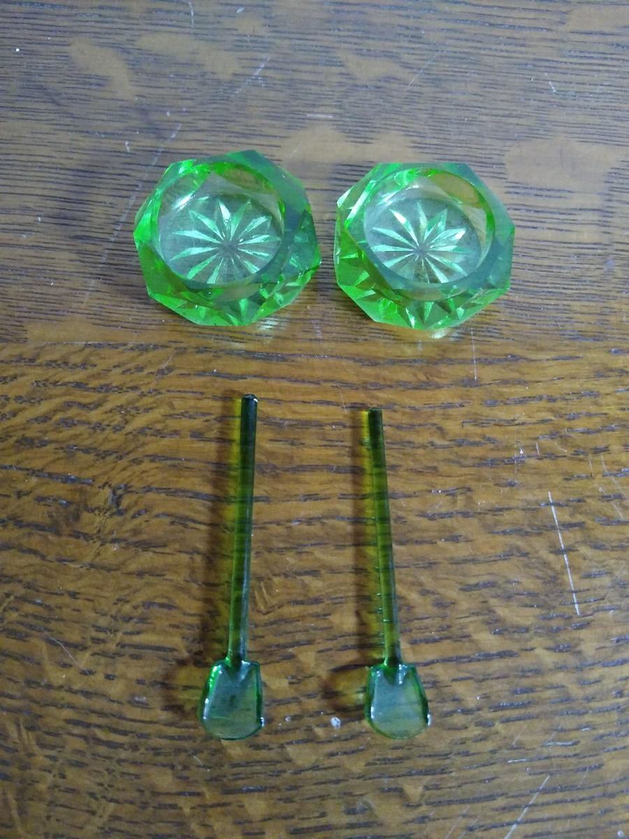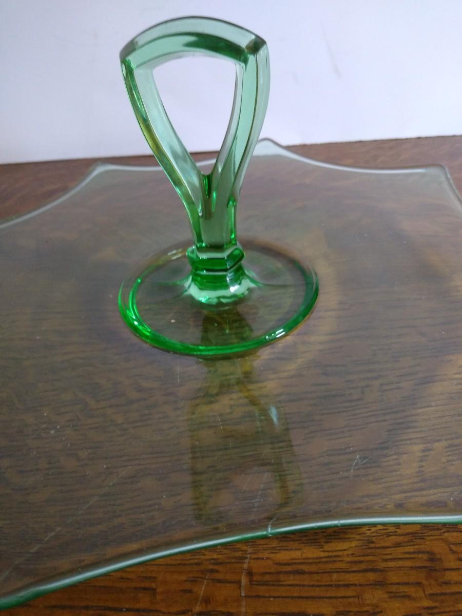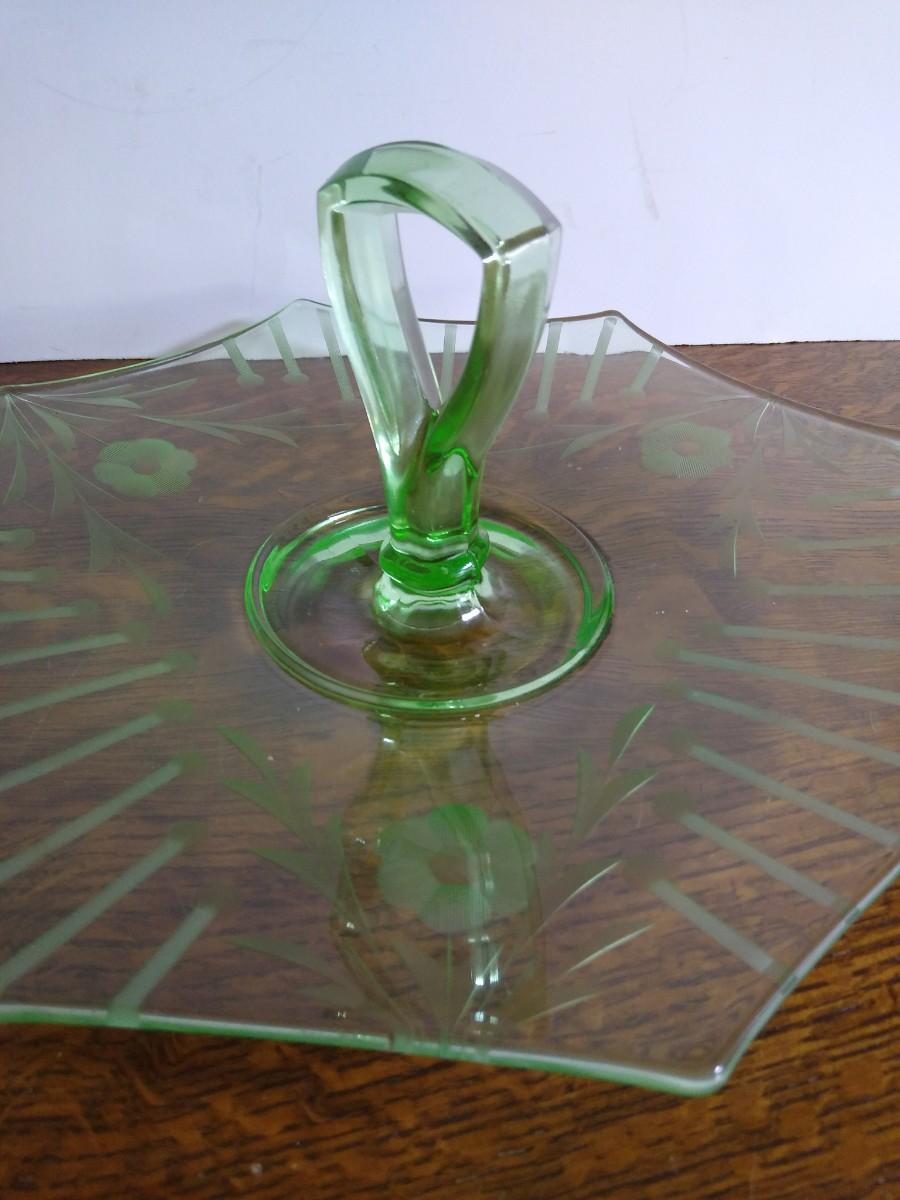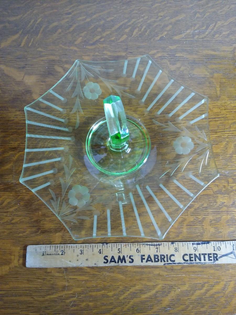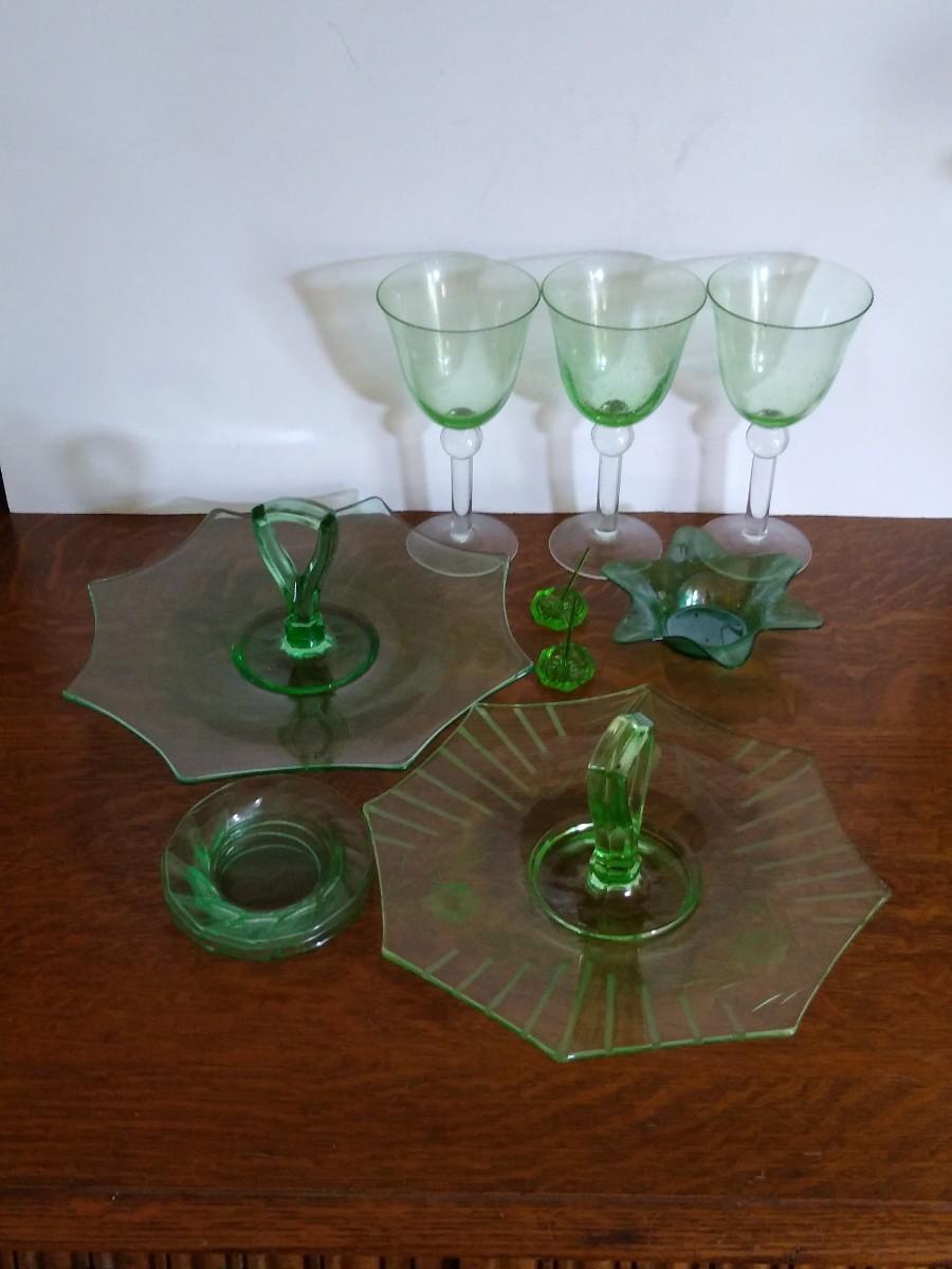 LOT 145D: Green Glass Collection: Depression Glass Serving Platters, Cut Glass Salt Cellars with Measuring Spoons & More