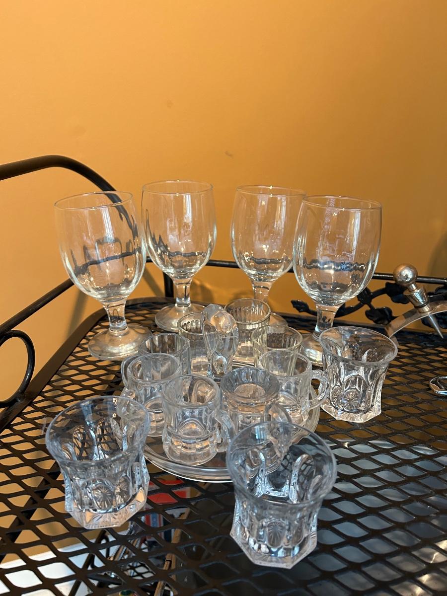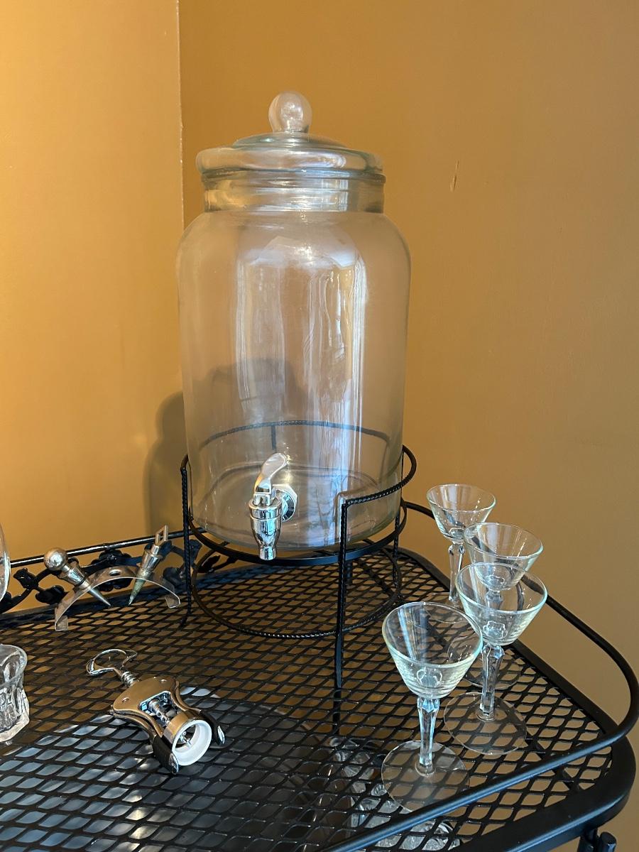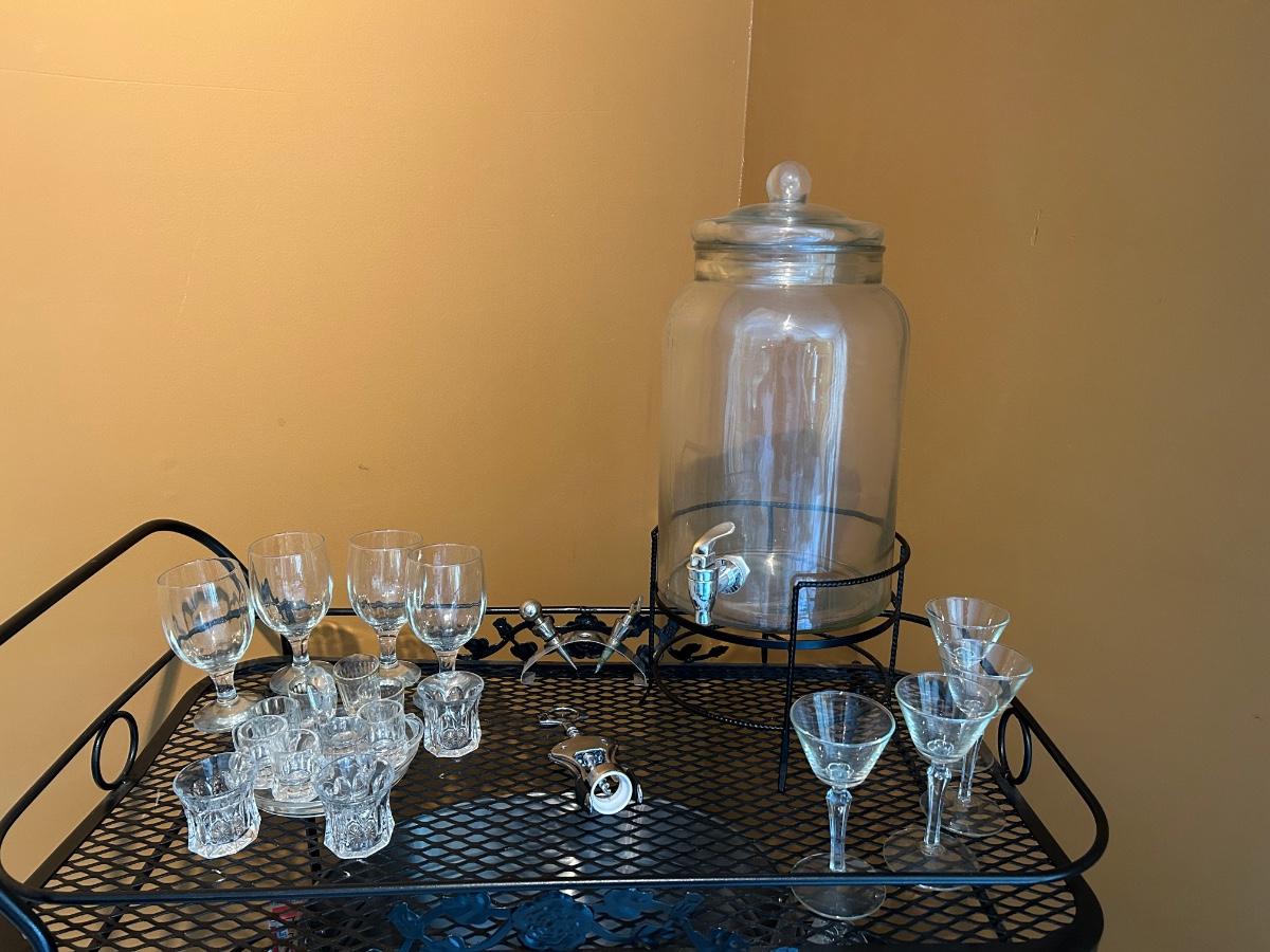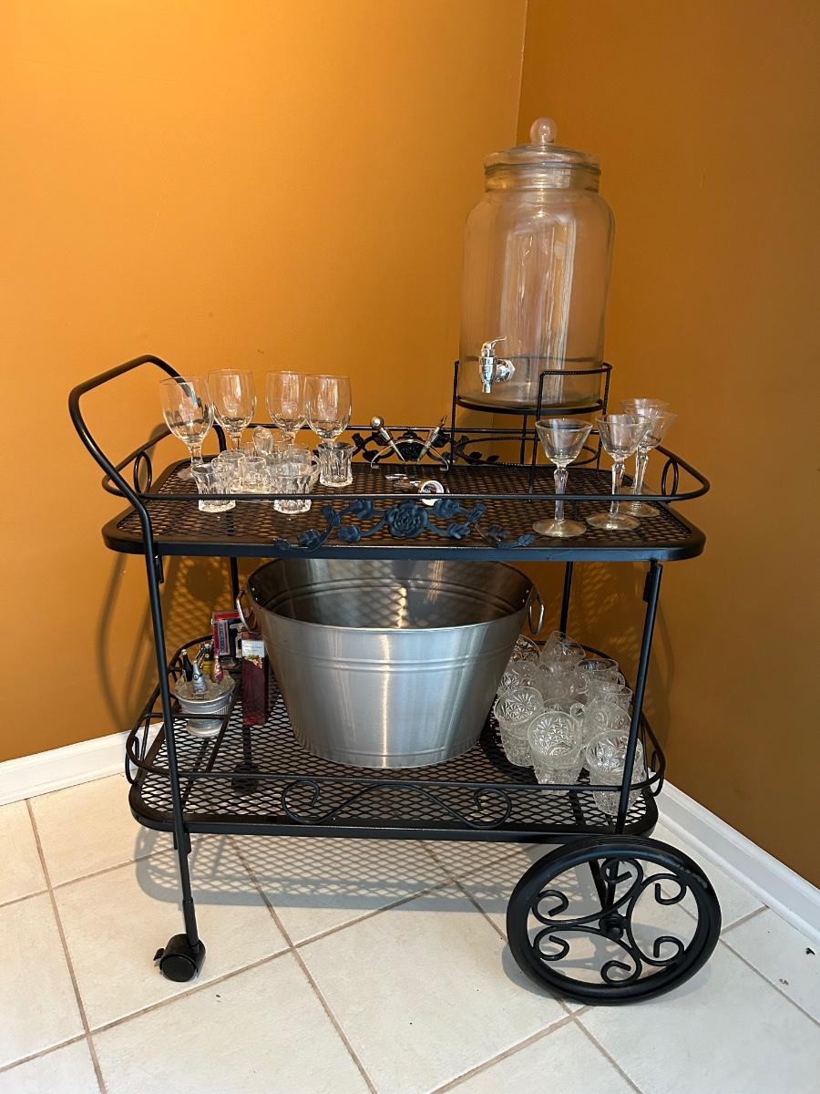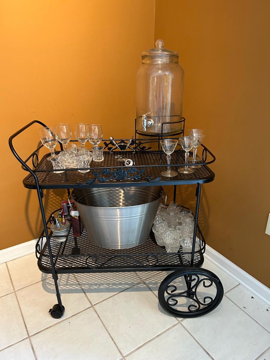 Serving cart is full of serving accessories, glasses, serving pitcher and glass punch bowl. Unsure of age of metal cart but has mid century modern design.