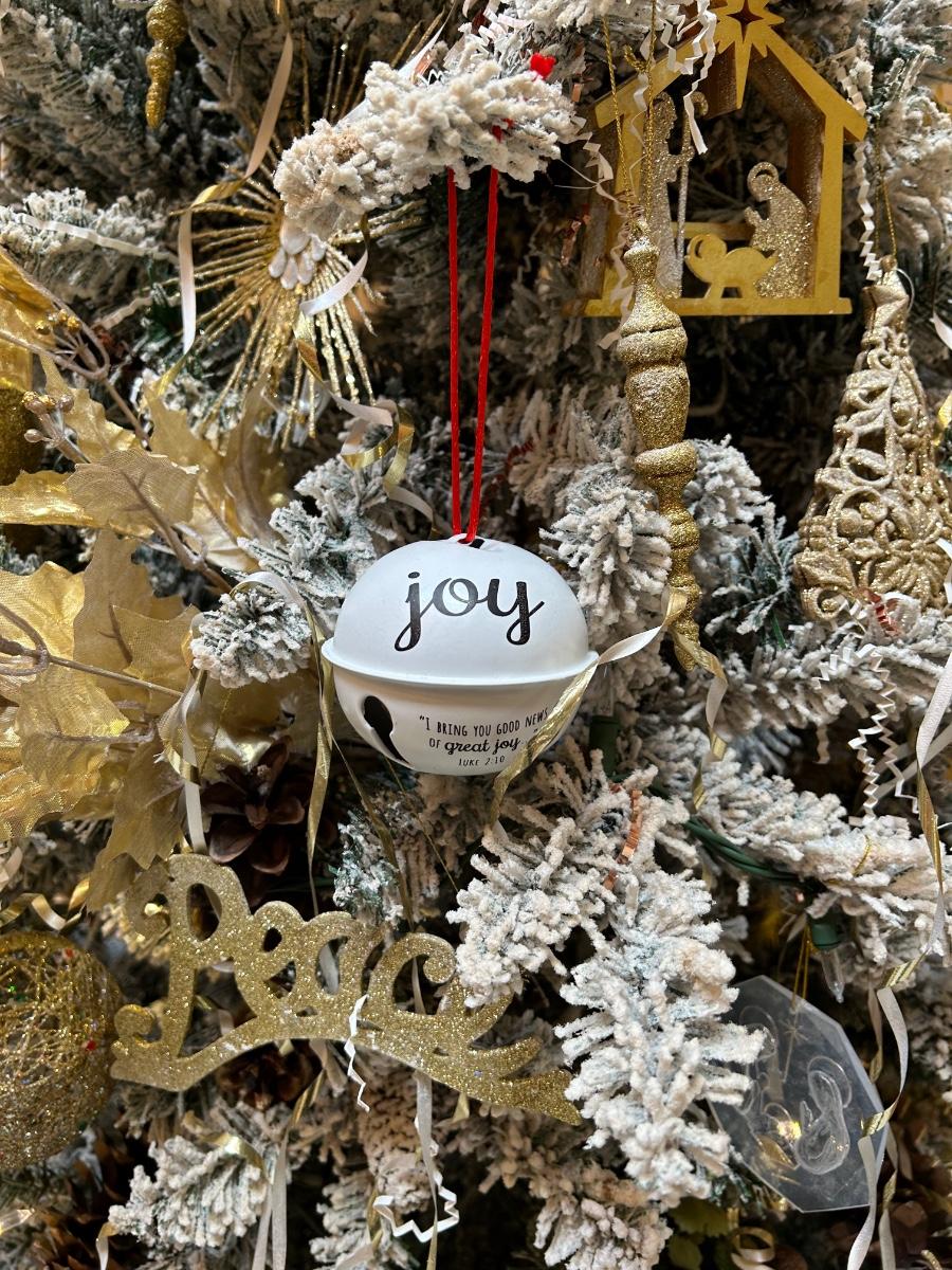 8’ Tree is fully lit and decorated with gold and neutral decorations.