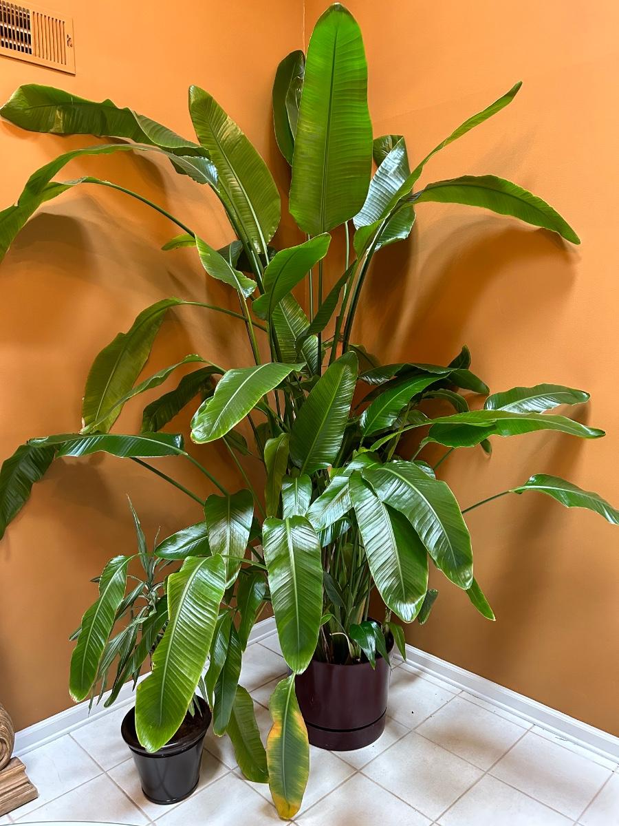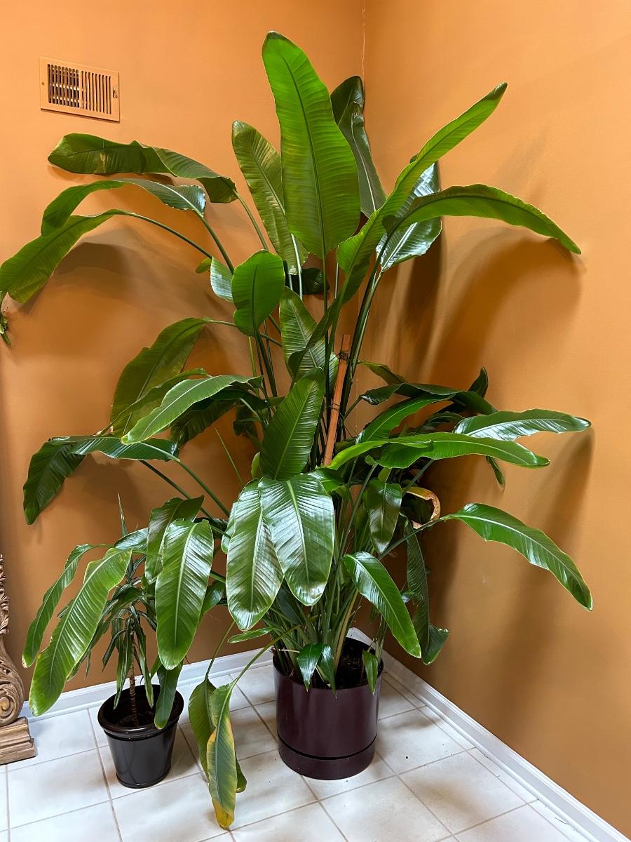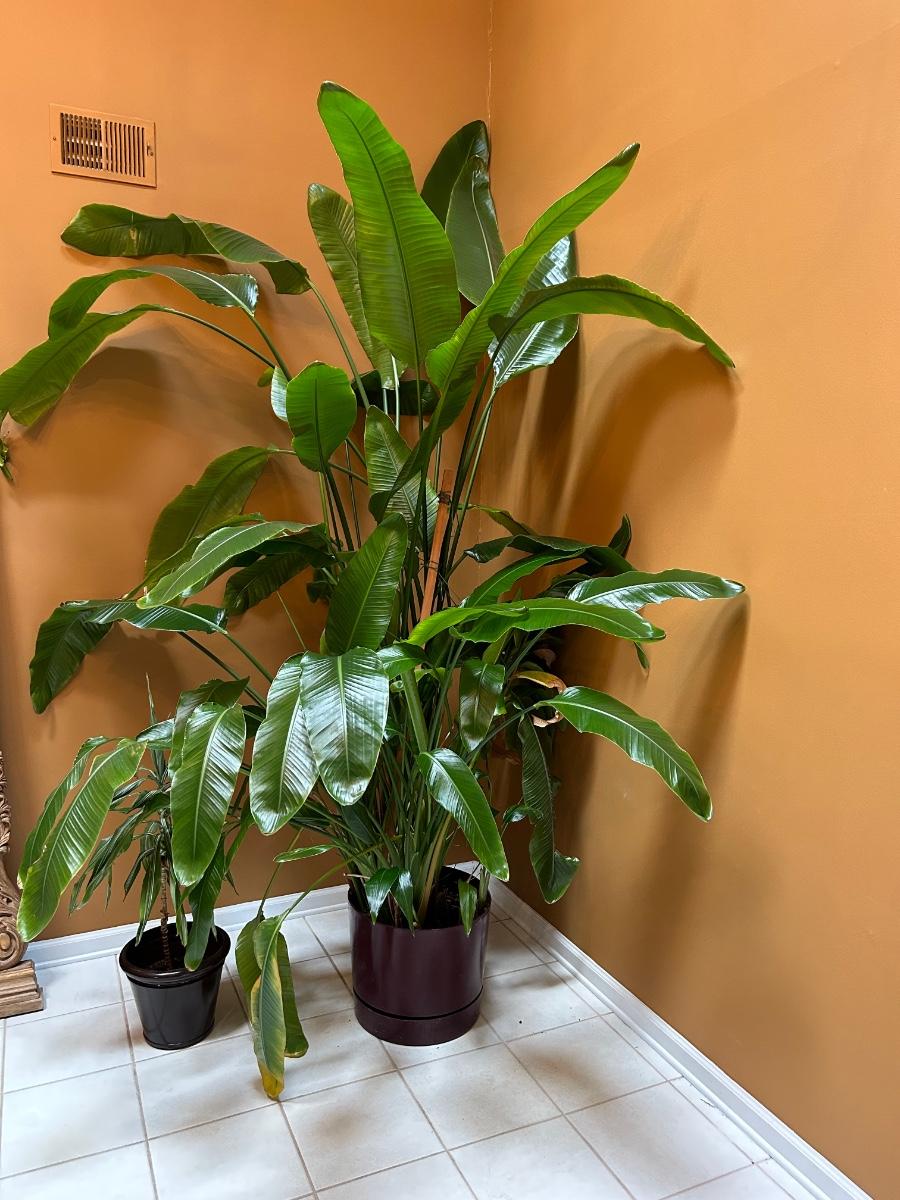 Plant is over 8’ tall. This is a live plant. Lot also includes smaller potted live tropical plant.