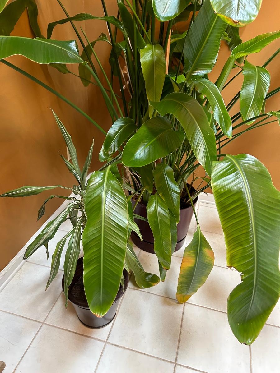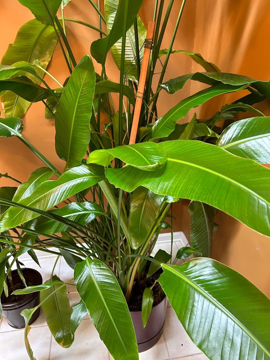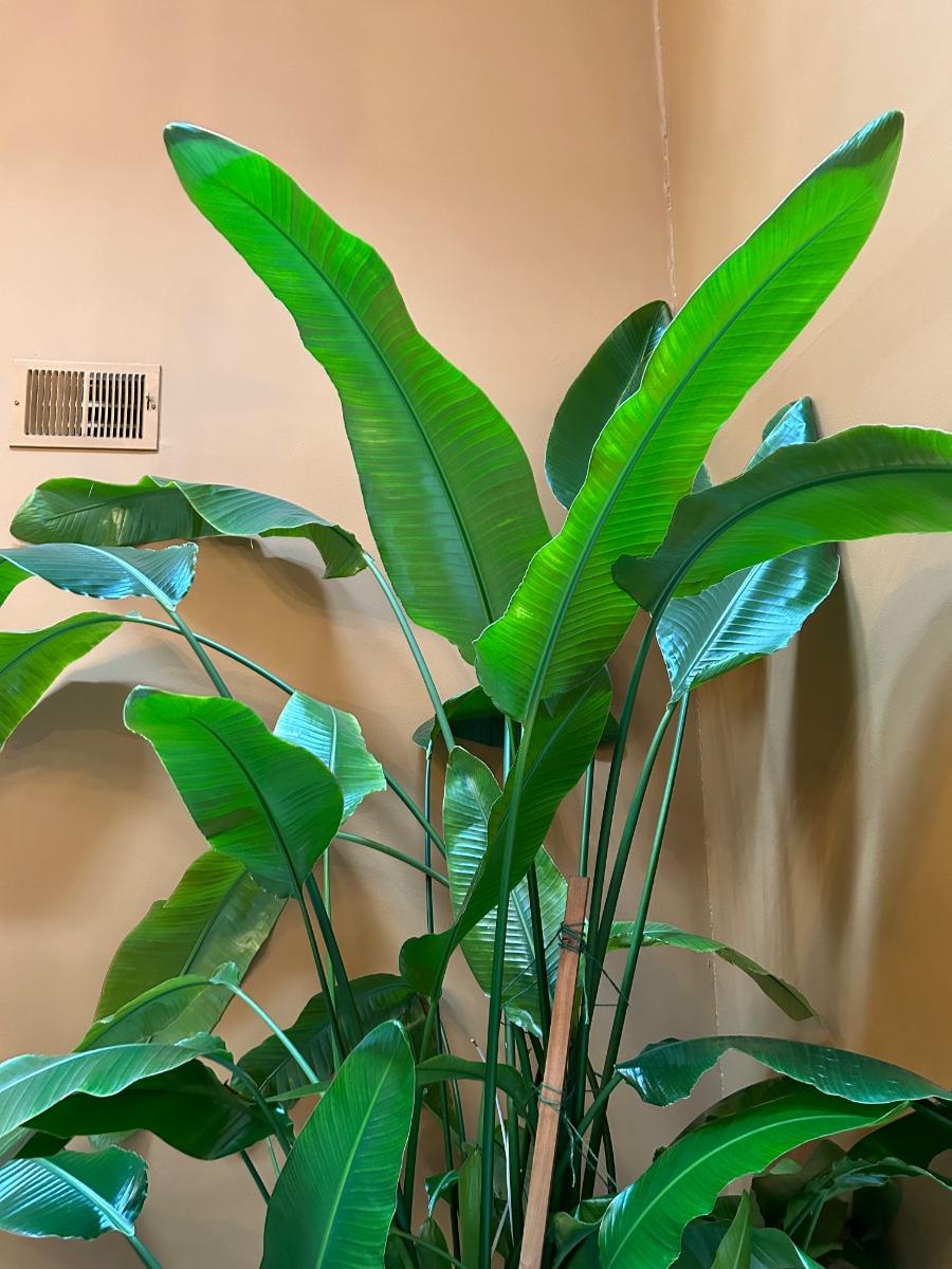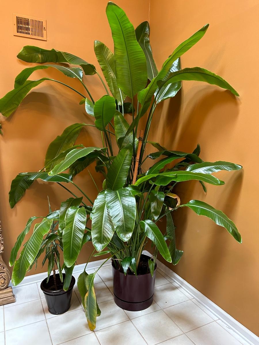Plant is over 8’ tall. This is a live plant. Lot also includes smaller potted live tropical plant.