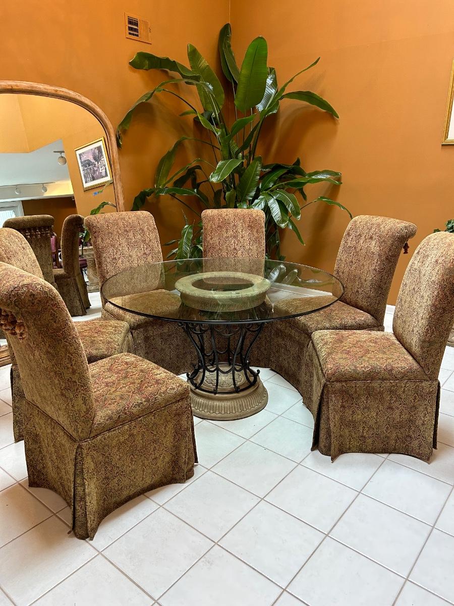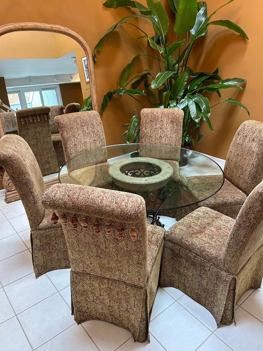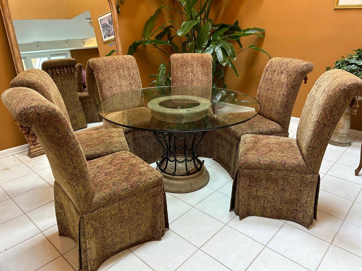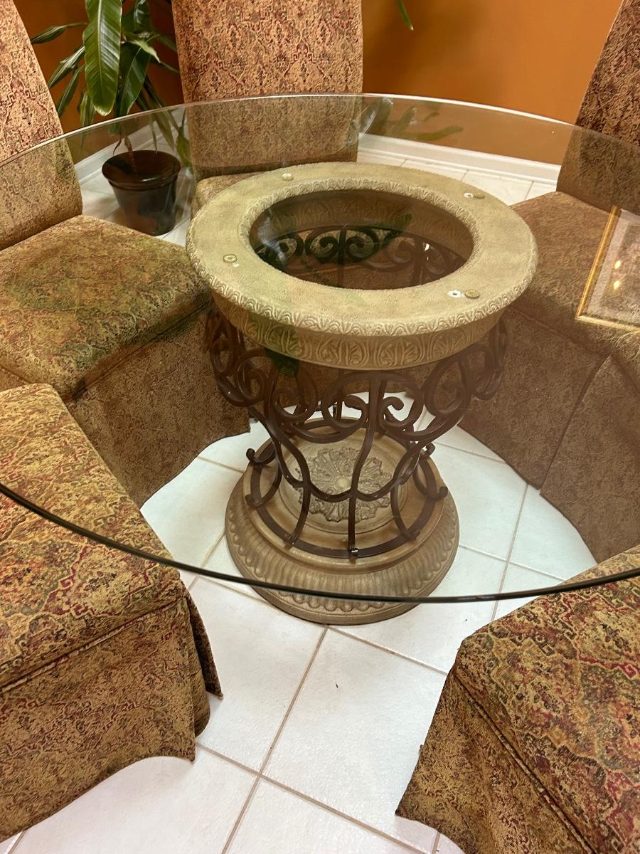 54” Round glass top table. Six Fabric chairs. Set is in good, used condition.