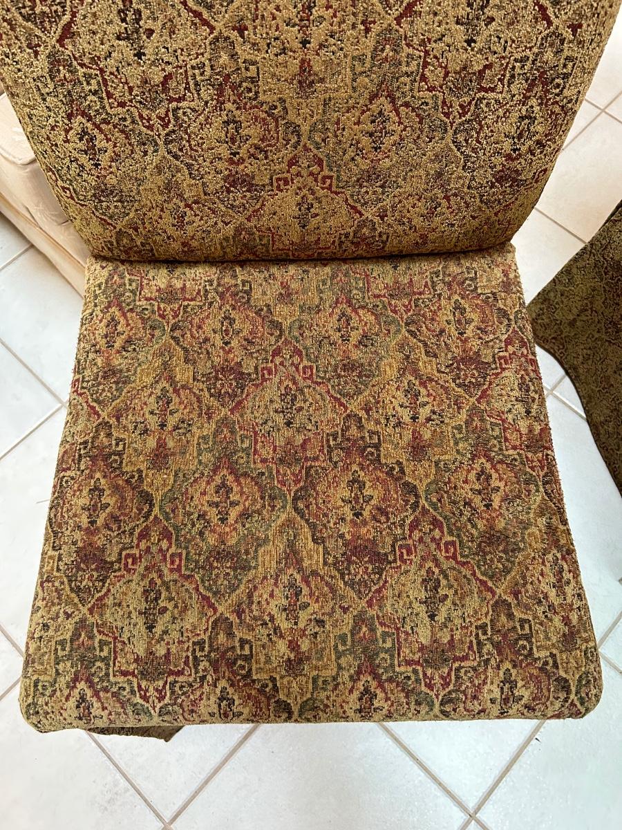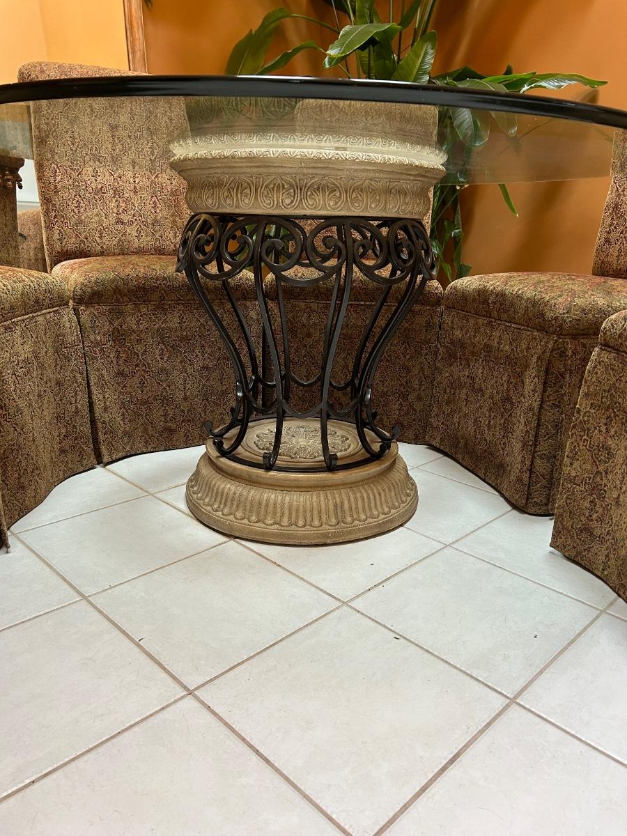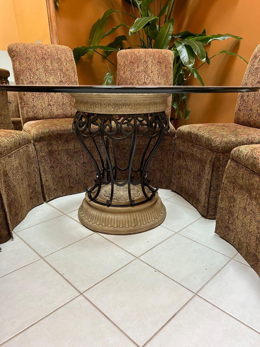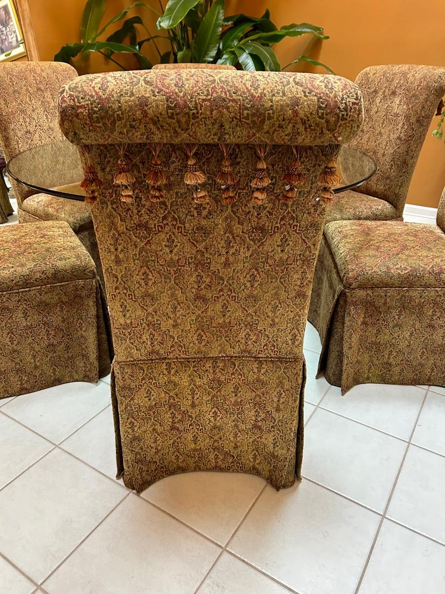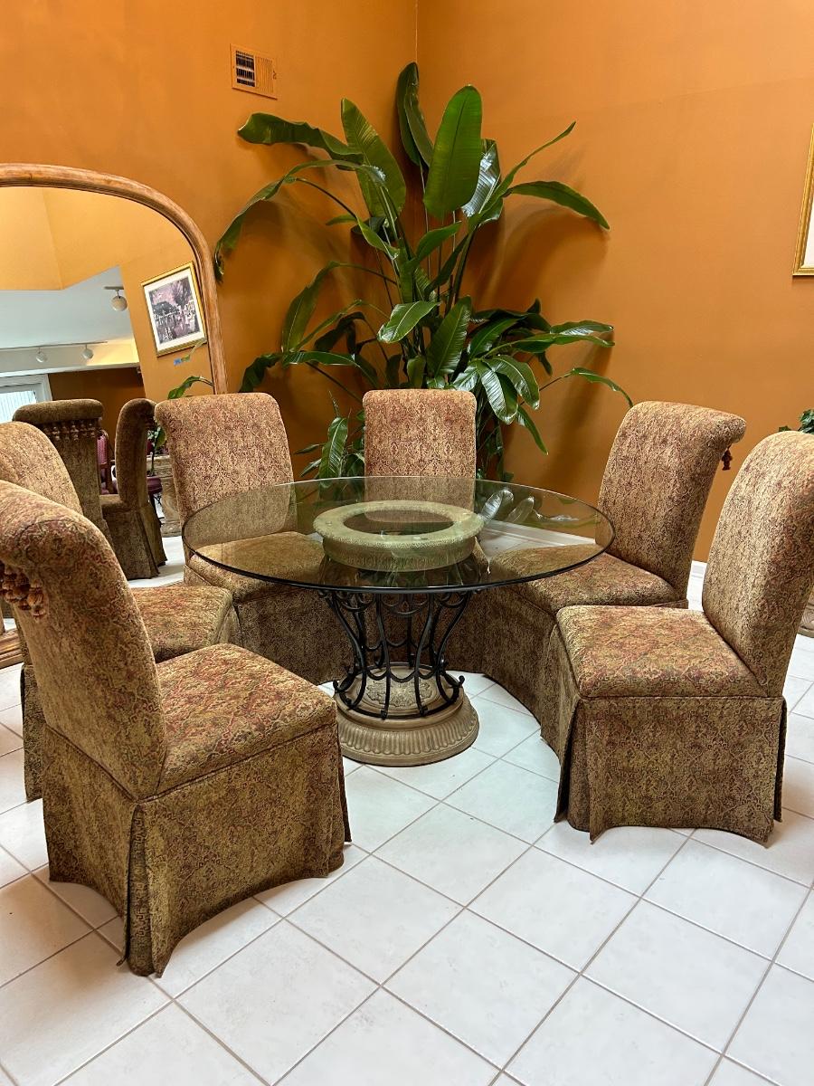 54” Round glass top table. Six Fabric chairs. Set is in good, used condition.