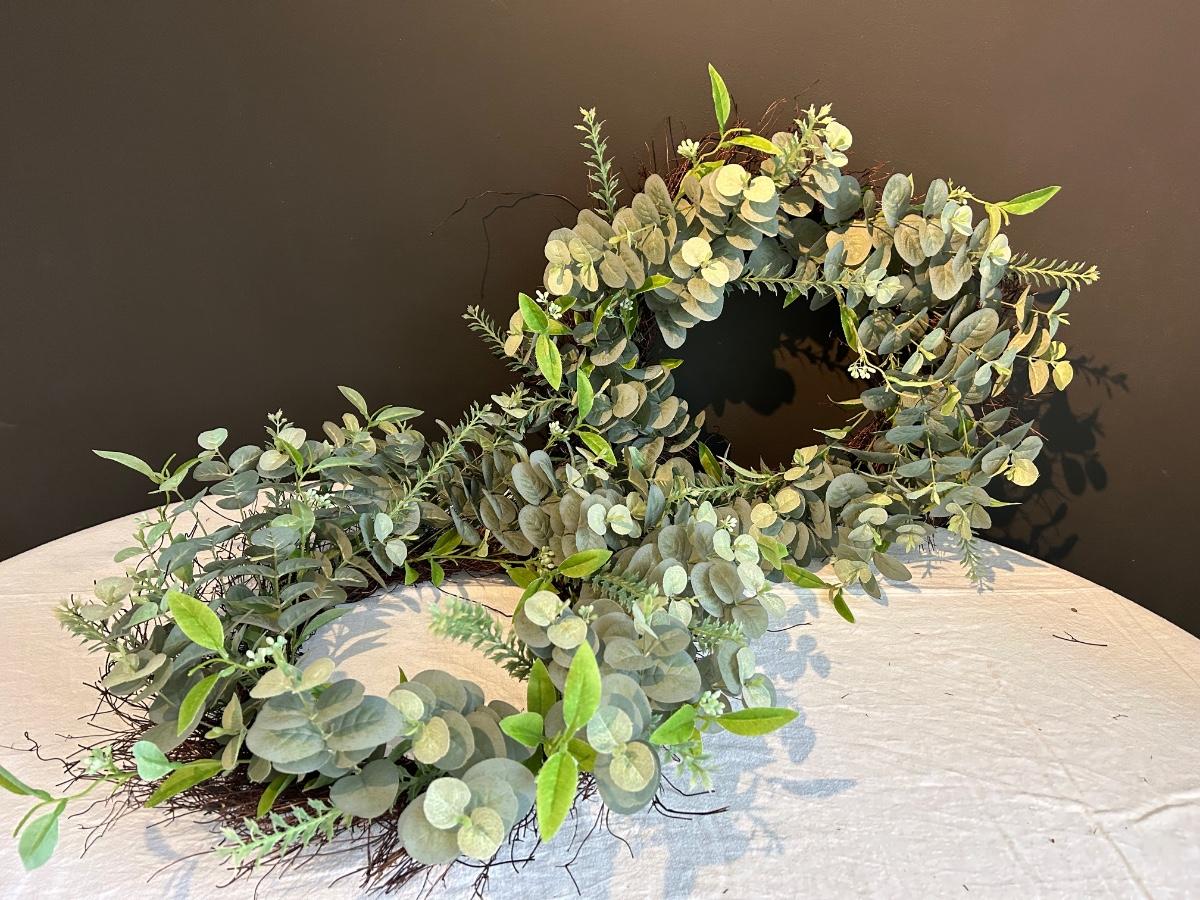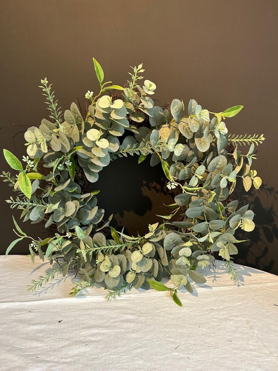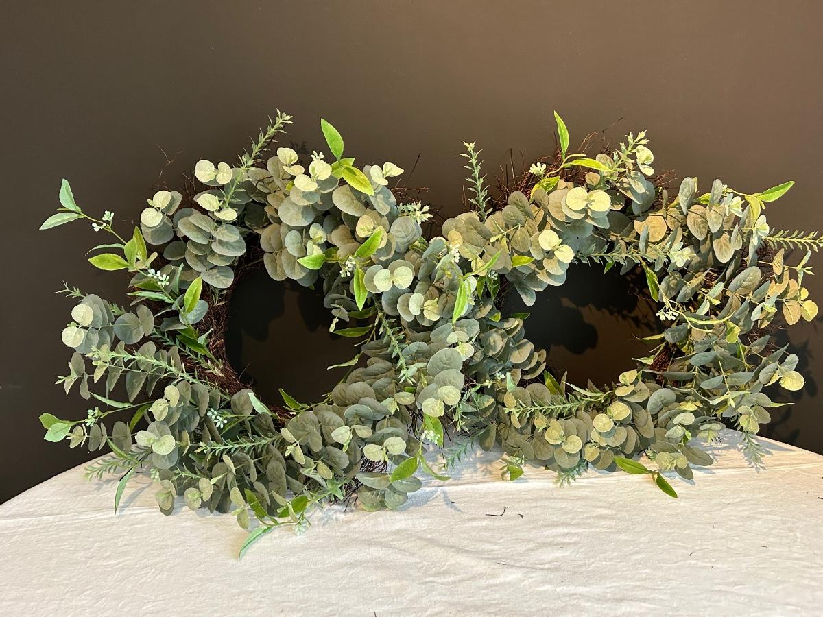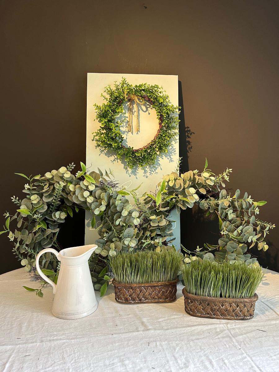 Two eucalyptus wreathes, two potted grass decorations, wall hanging and pitcher.