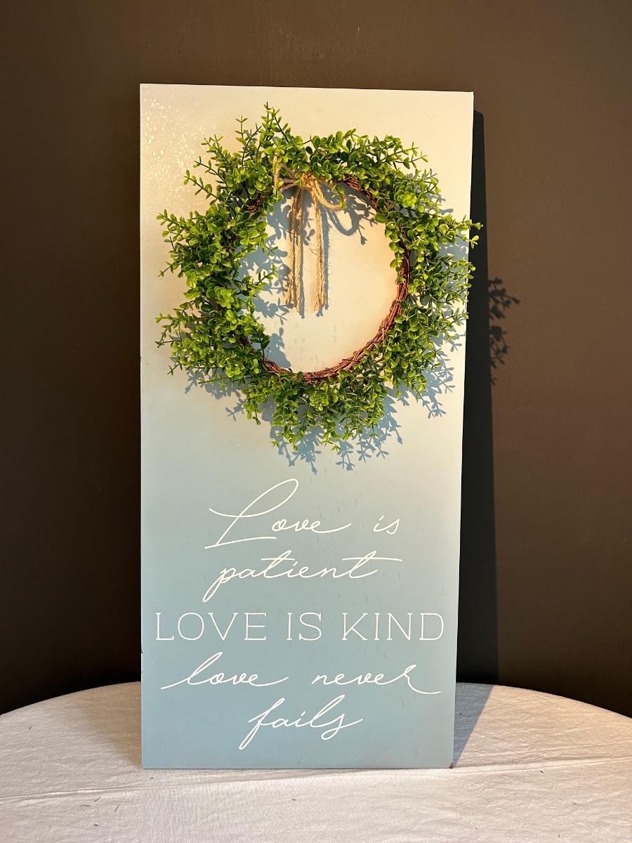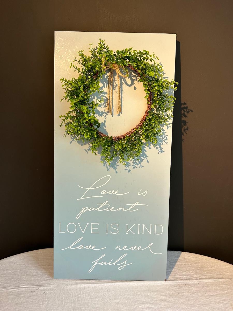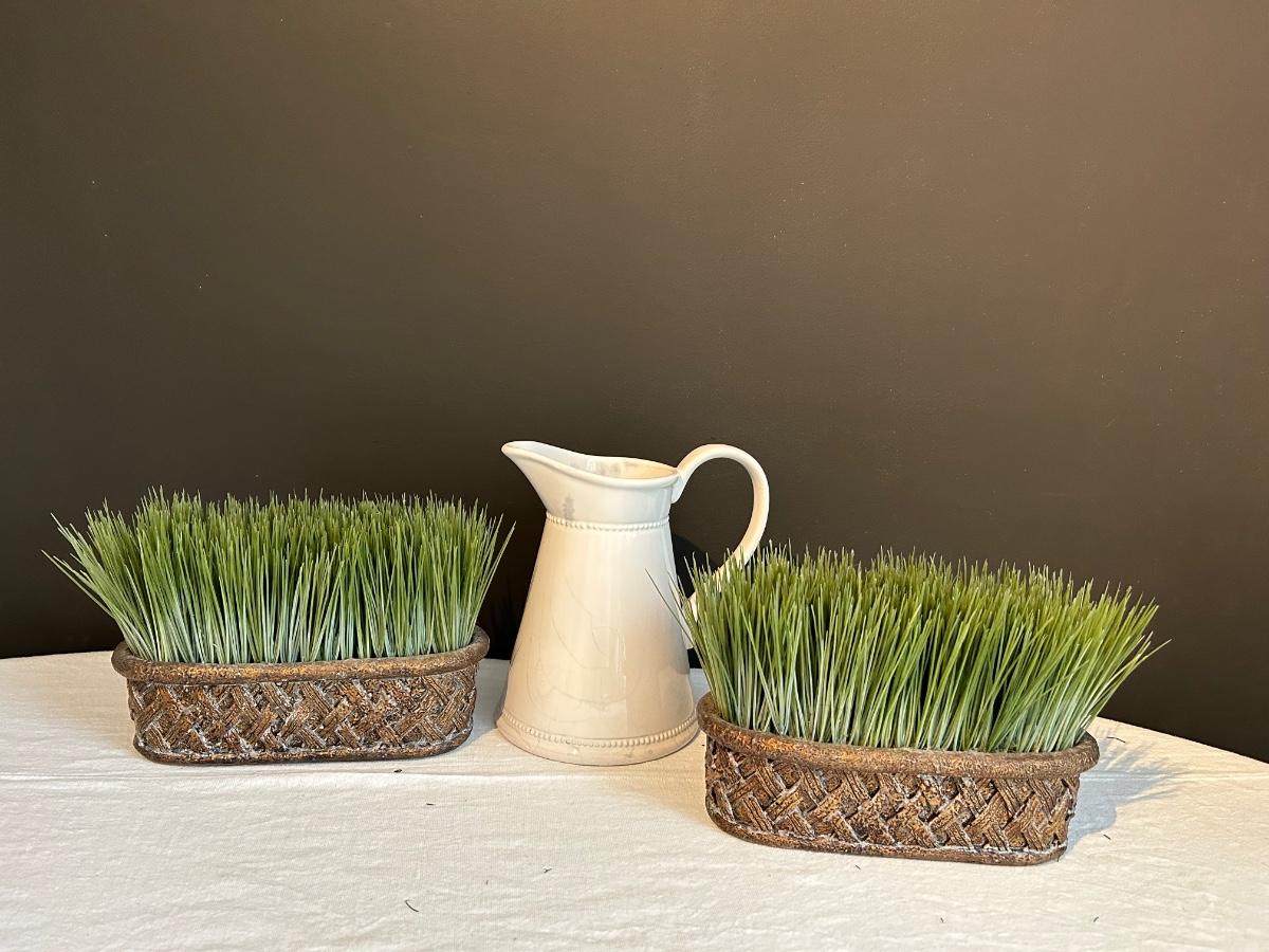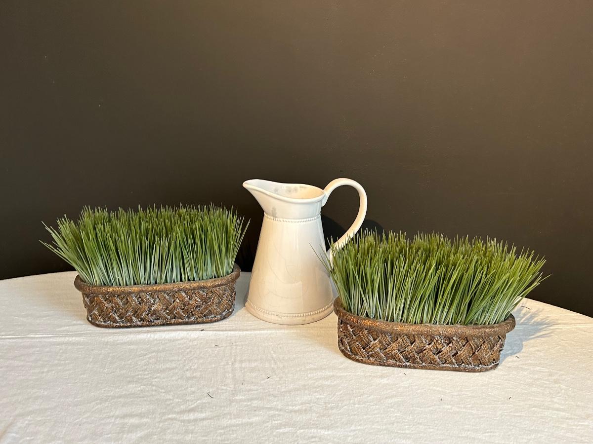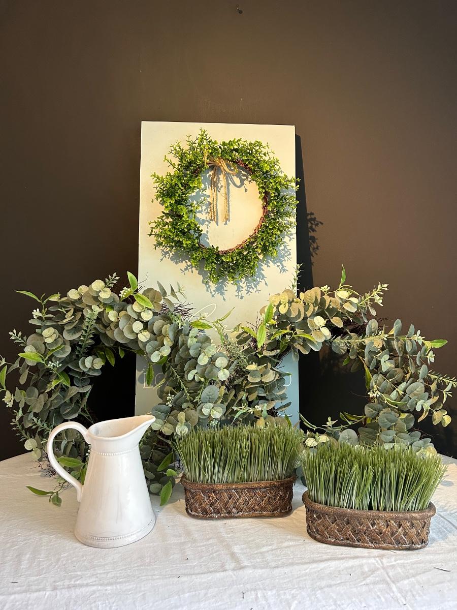 LOT 10: Home Decor: Eucalyptus Wreaths, Art, Pitcher, and Wheatgrass Planters