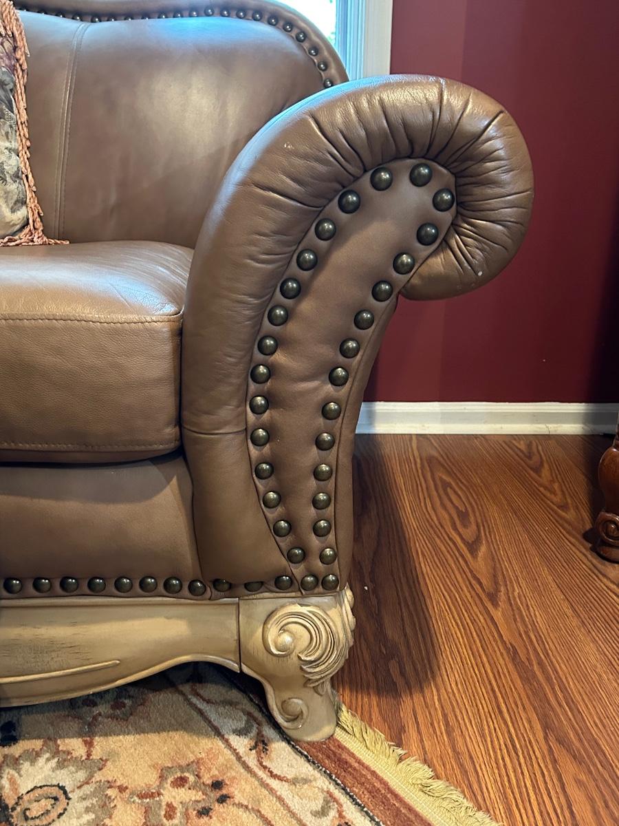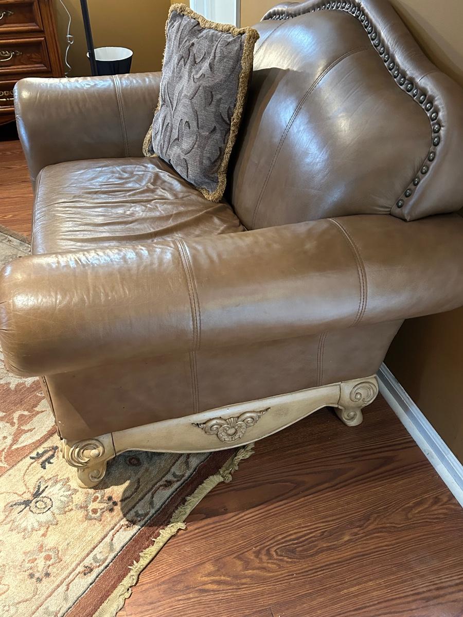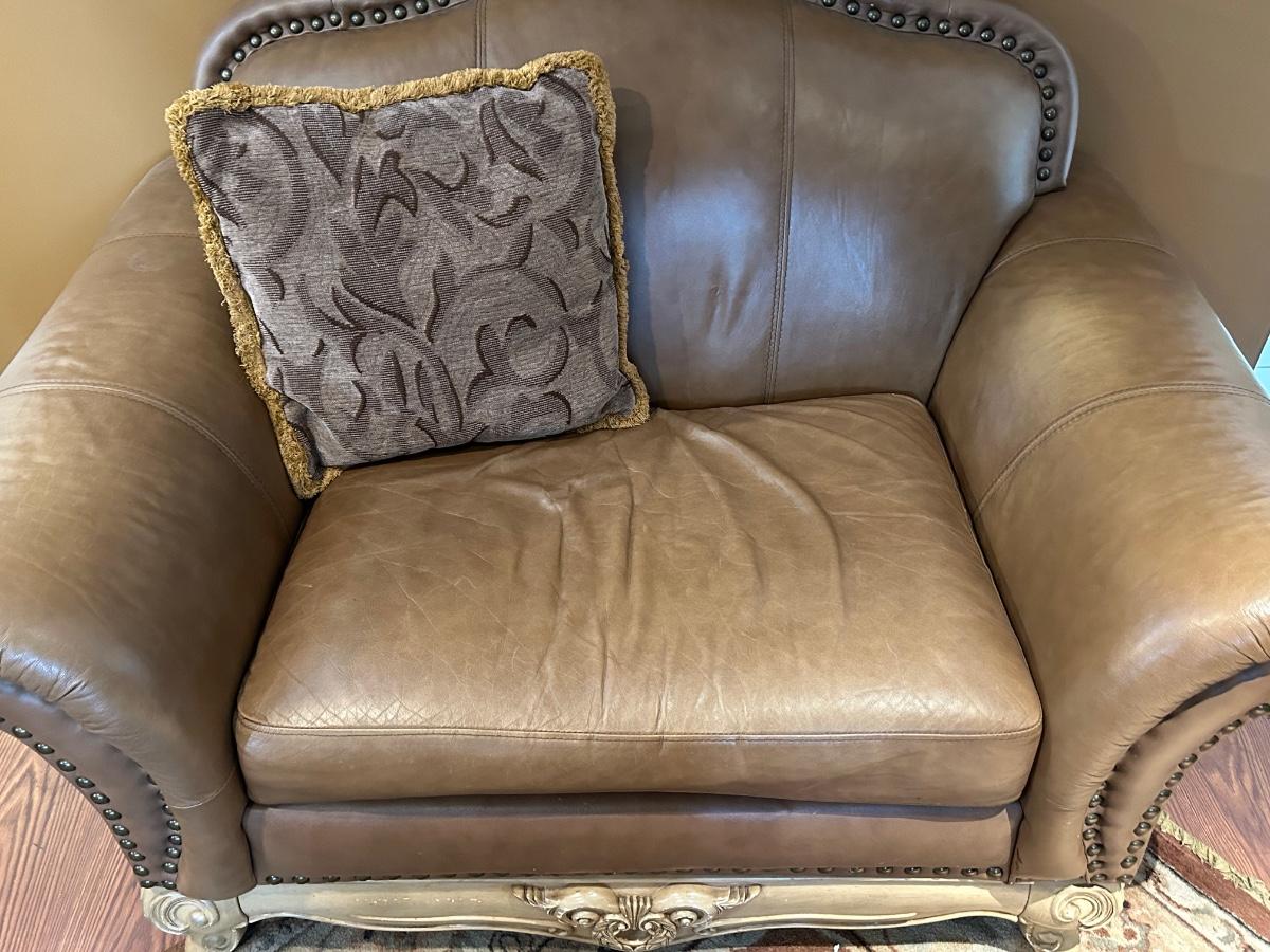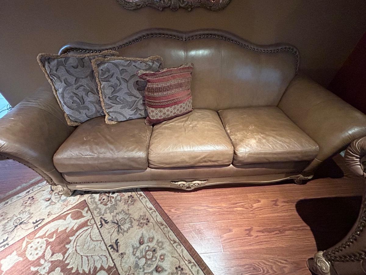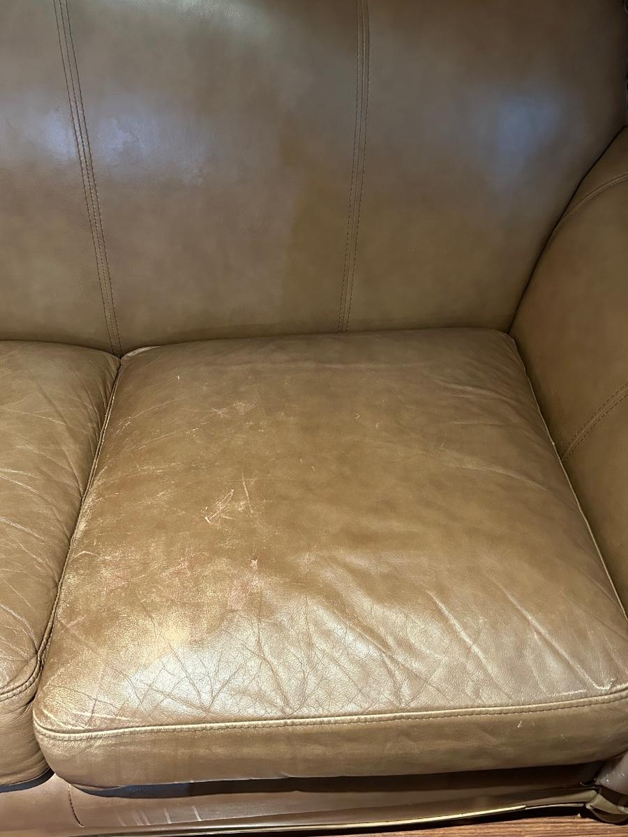 Leather set is in used condition. This set does show some wear. Color is a neutral brown.