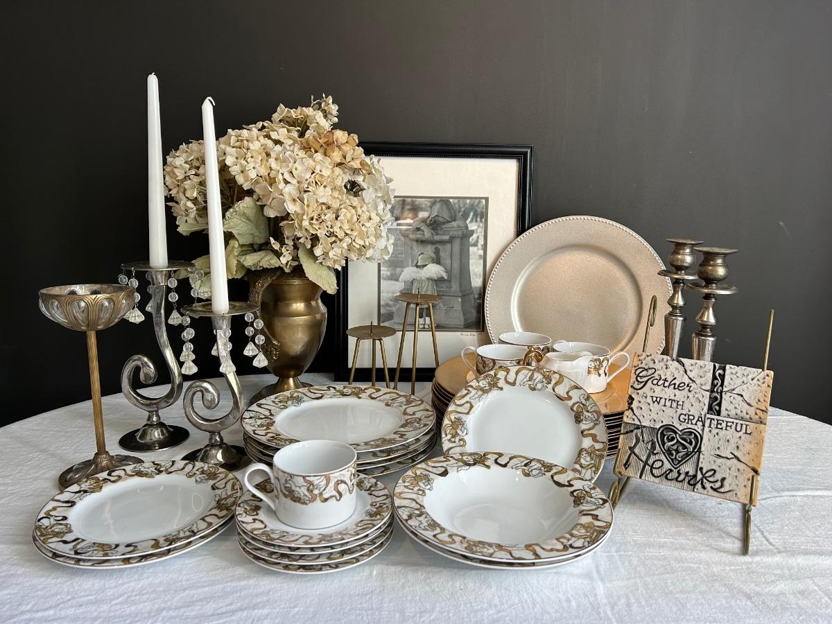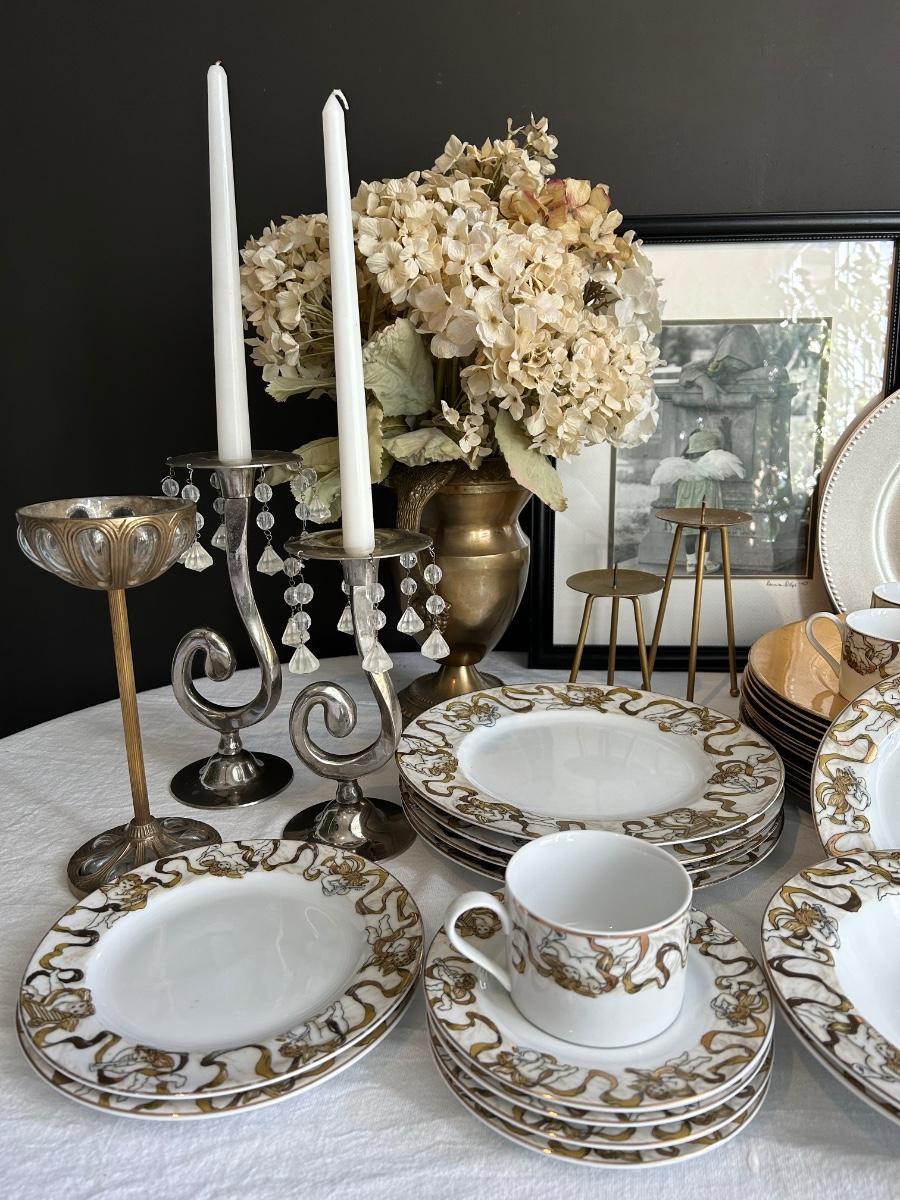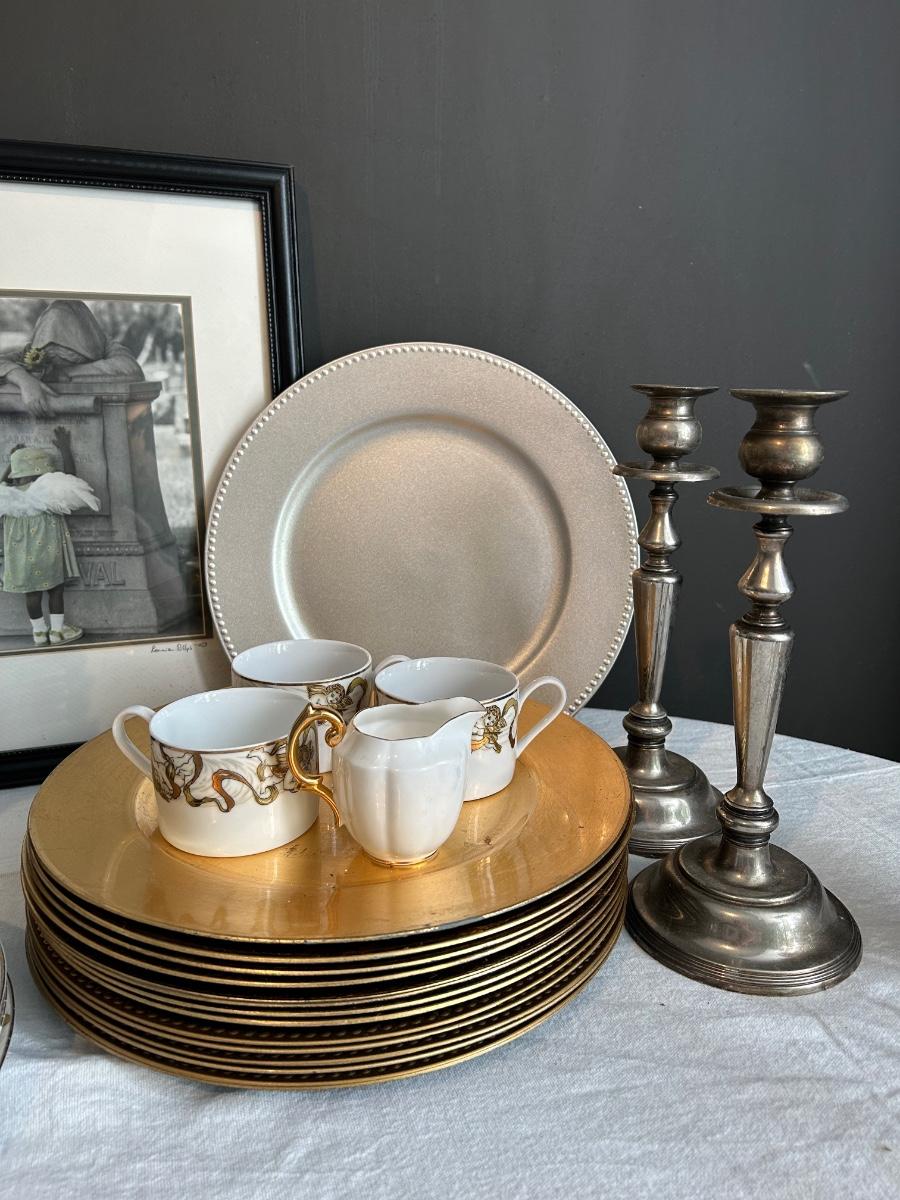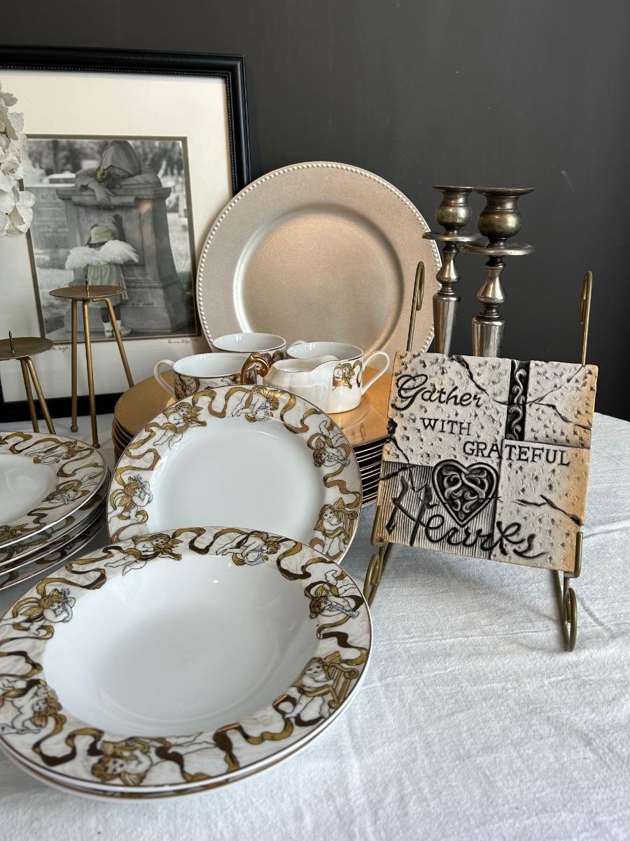 Cherub plates and tea cups. Gold and silver chargers, candlesticks, vase w floral arrangement and art decor.