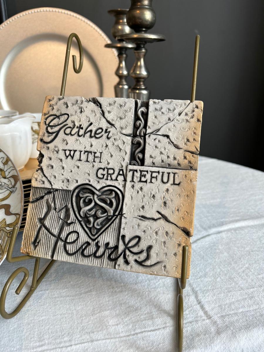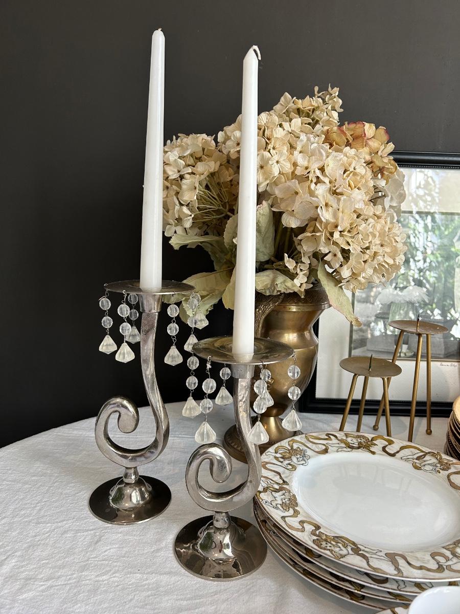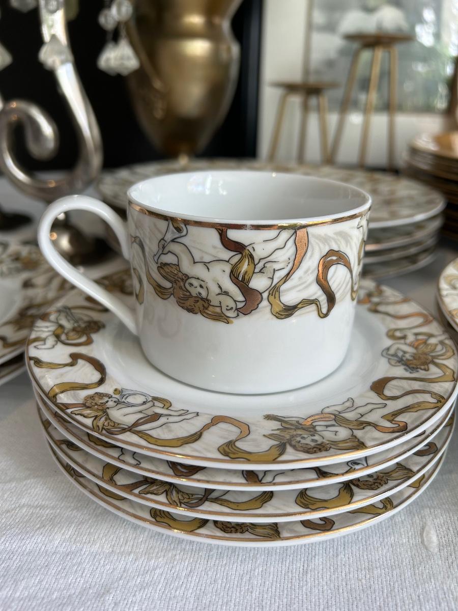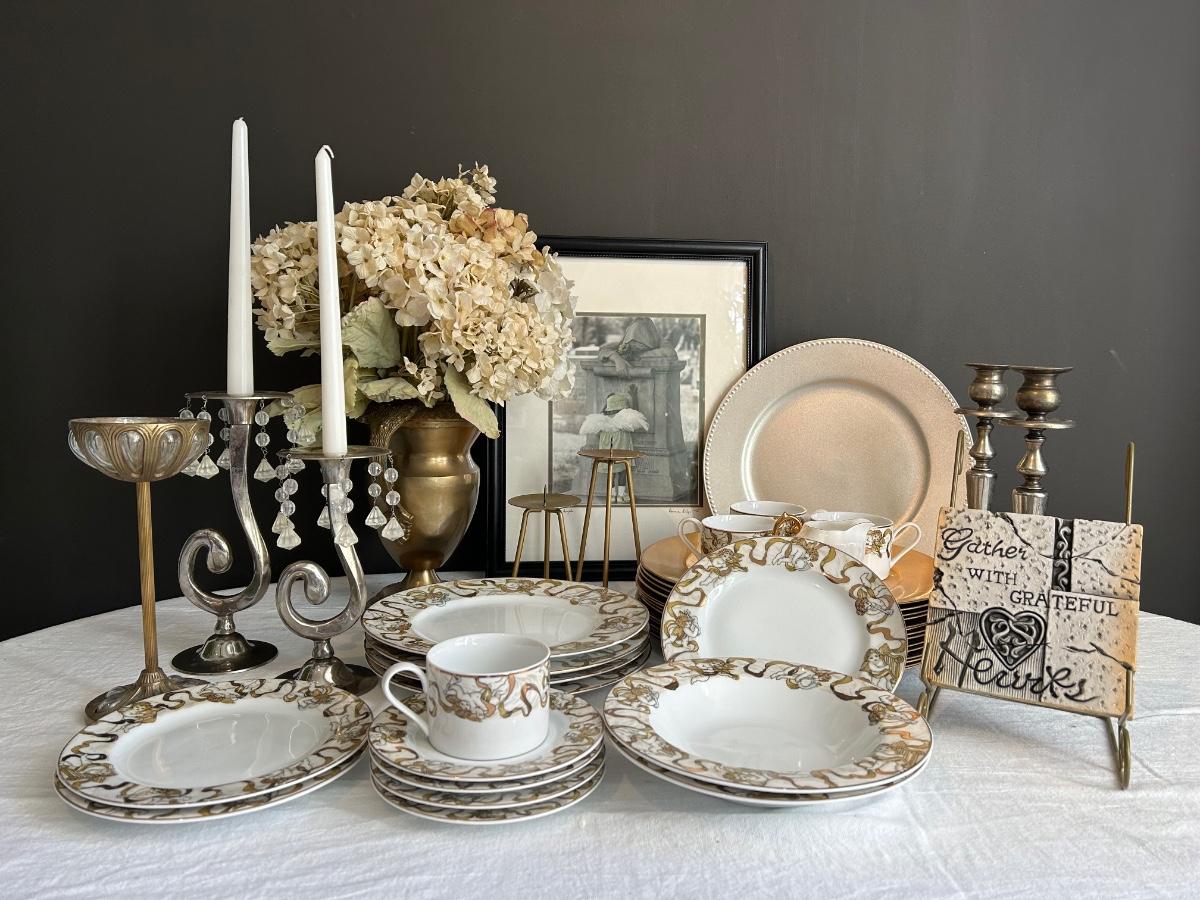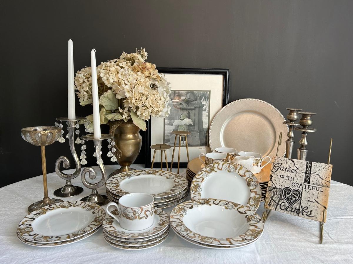 Cherub plates and tea cups. Gold and silver chargers, candlesticks, vase w floral arrangement and art decor.