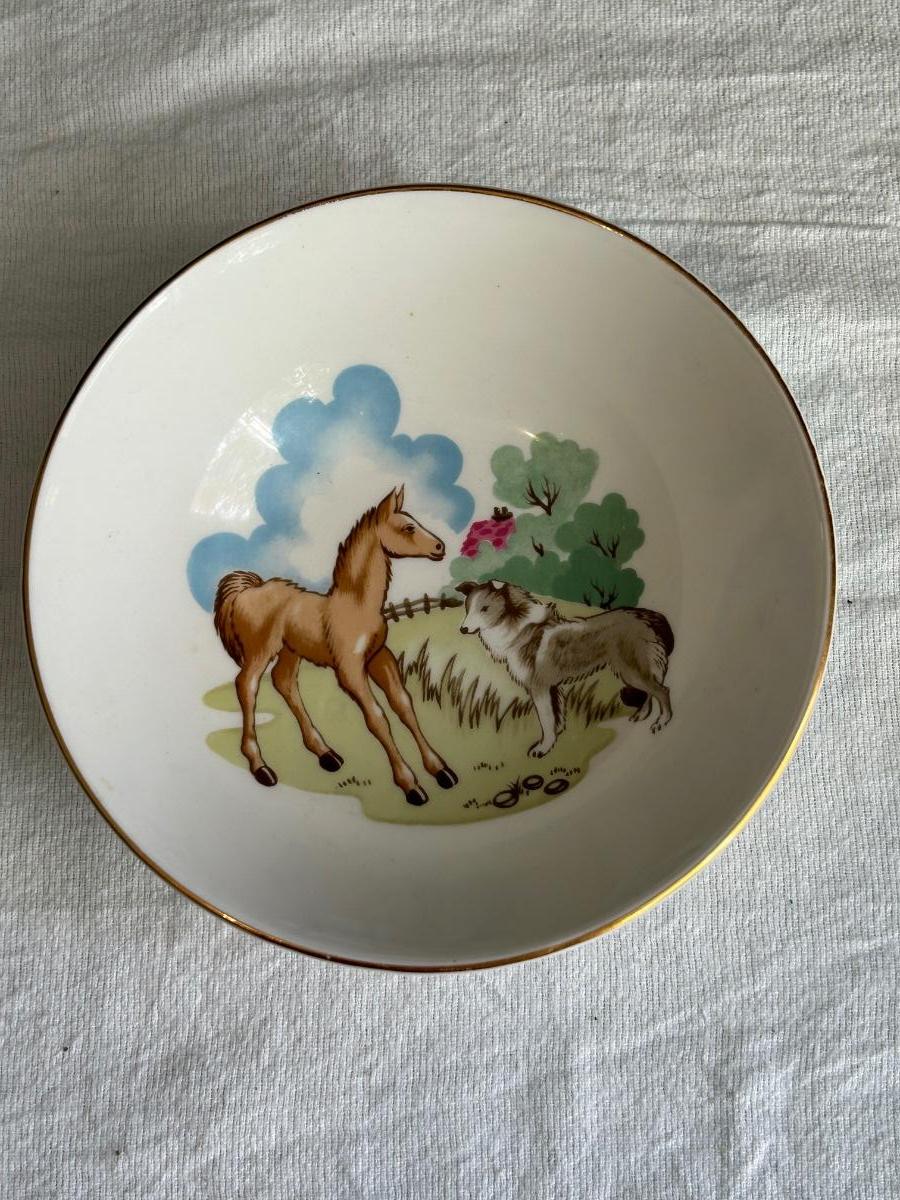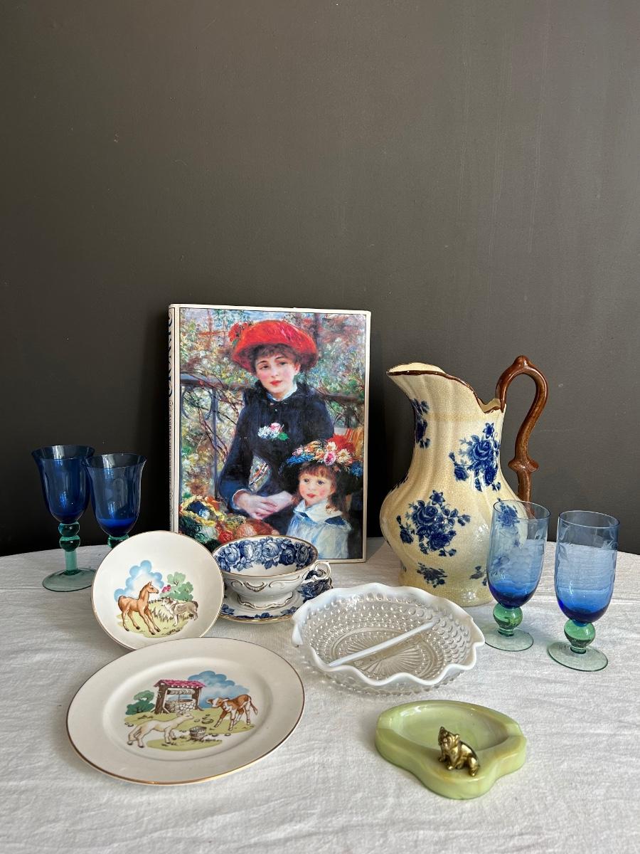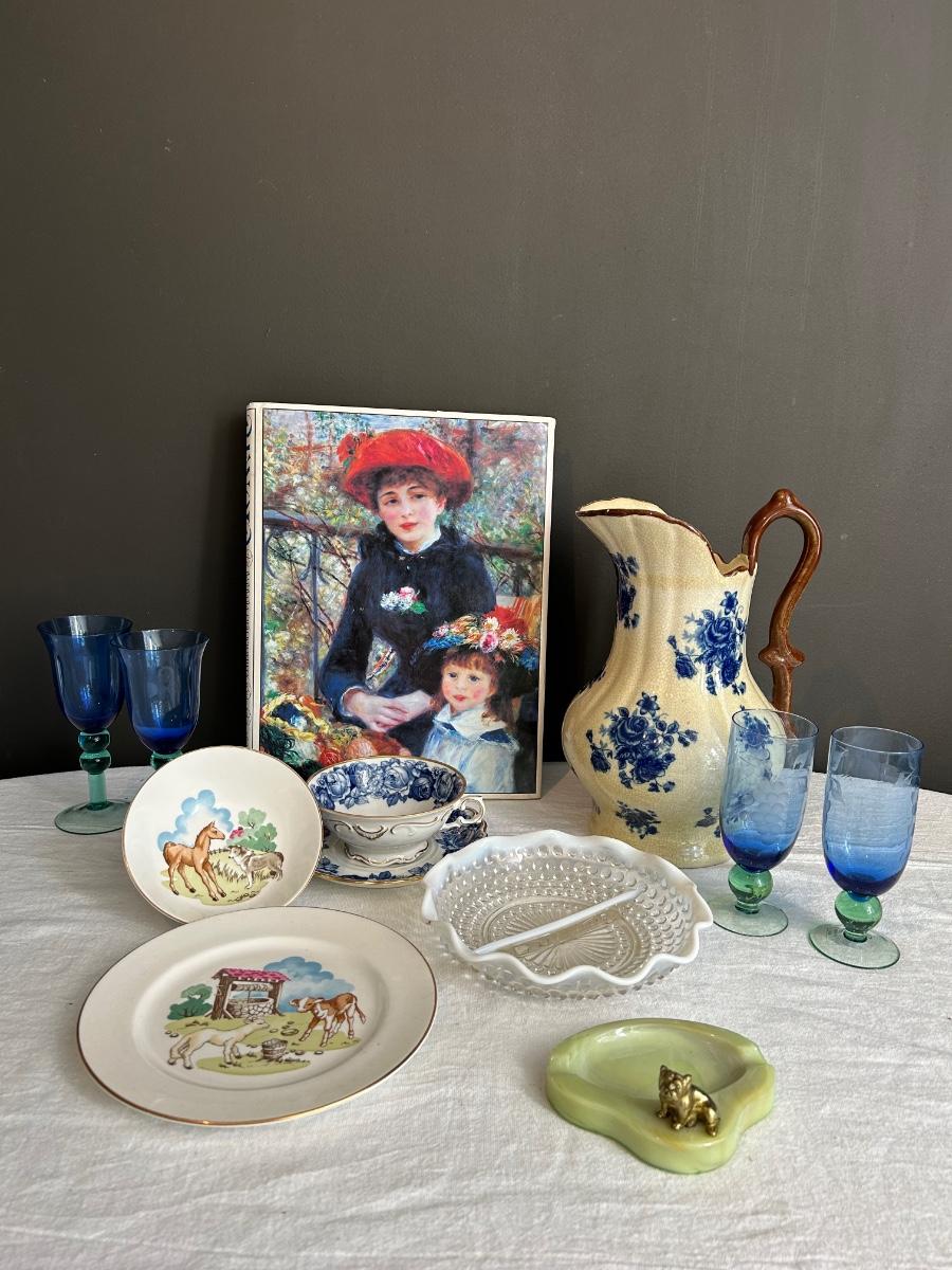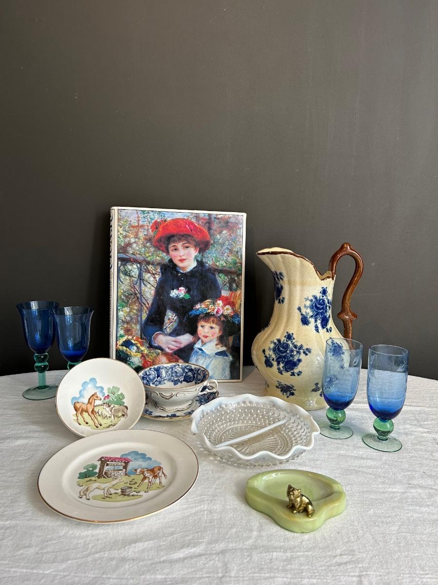 Collection includes vintage children's dishes by Princess House and Royal Windsor. Heirloom teacup set. Book, pitcher, glasses and more.