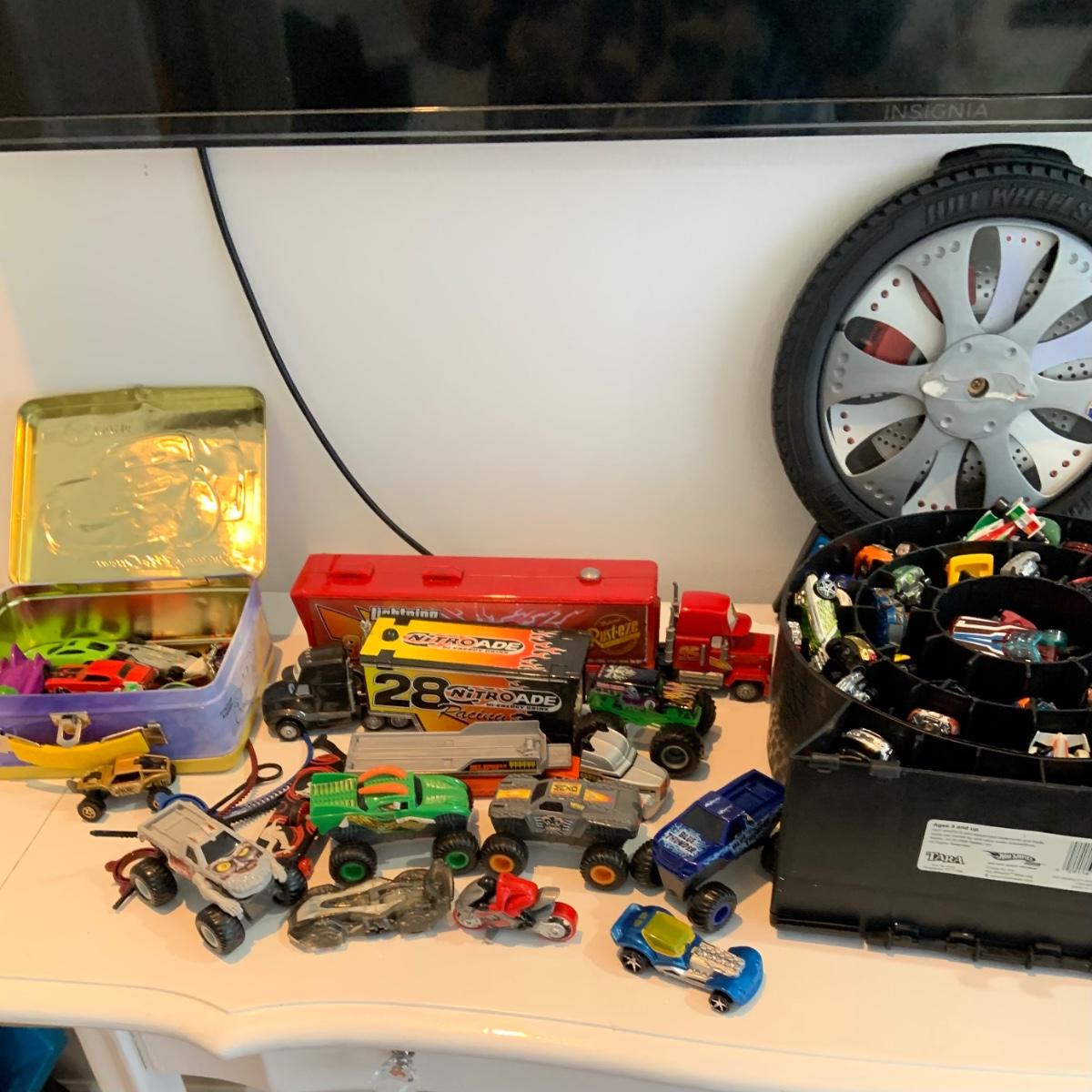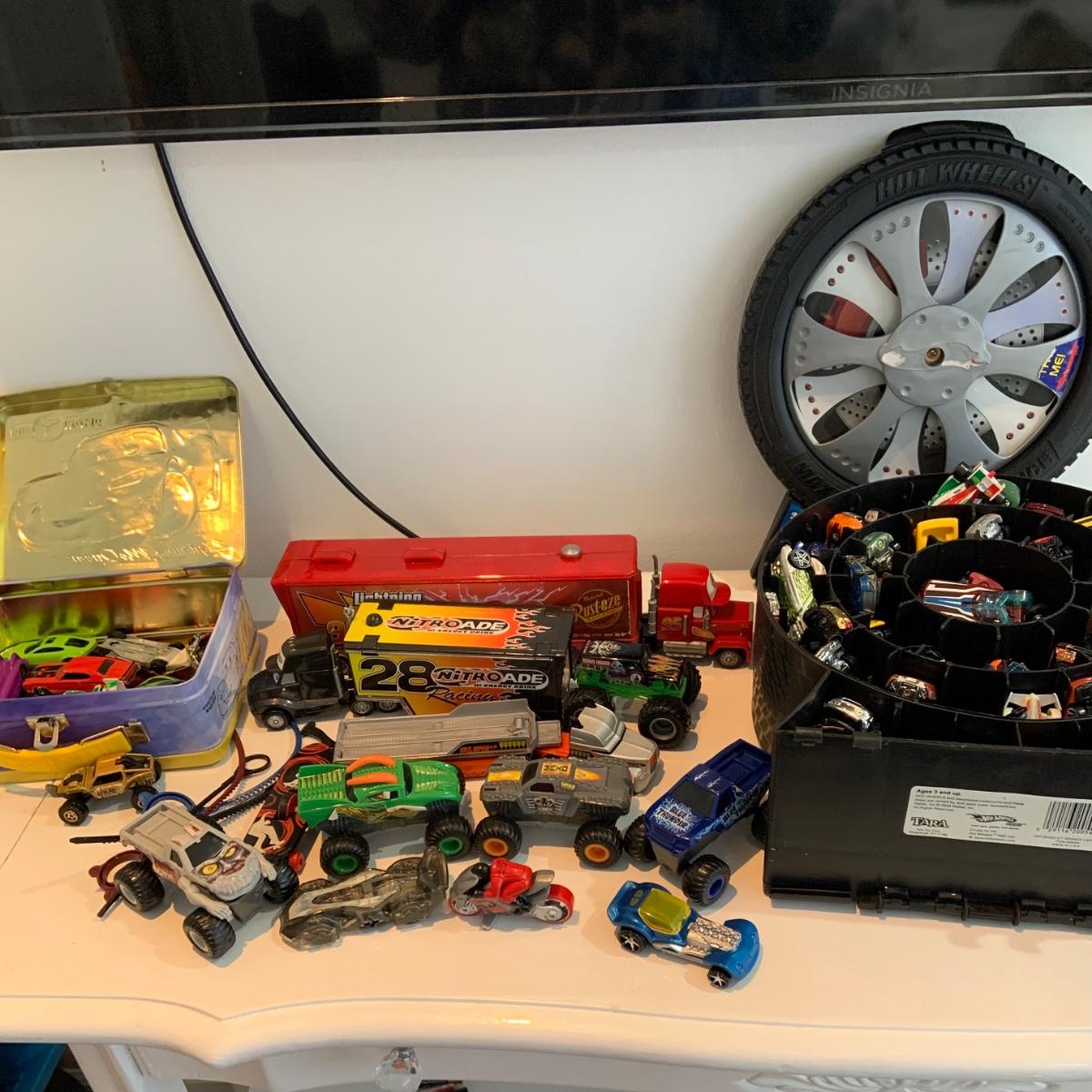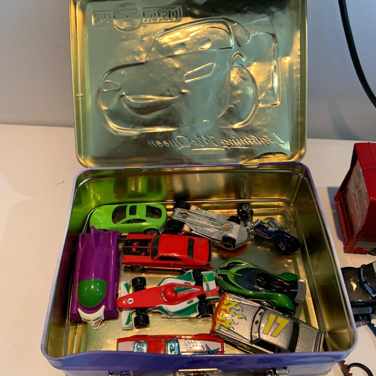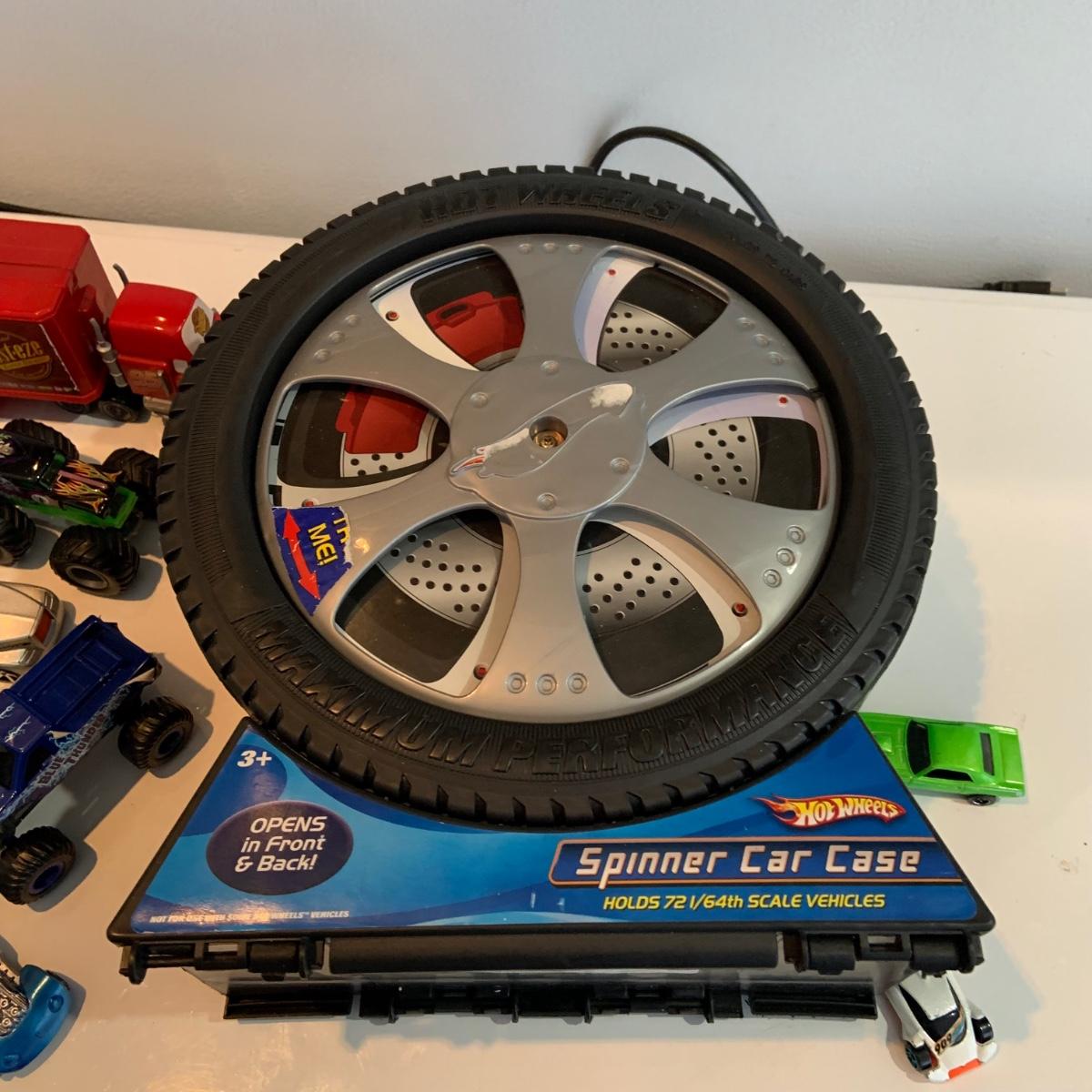 LOT:33G: Large Collection of Diecast Hotwheels and Other Toy Cars. and Carrying Case and Tin