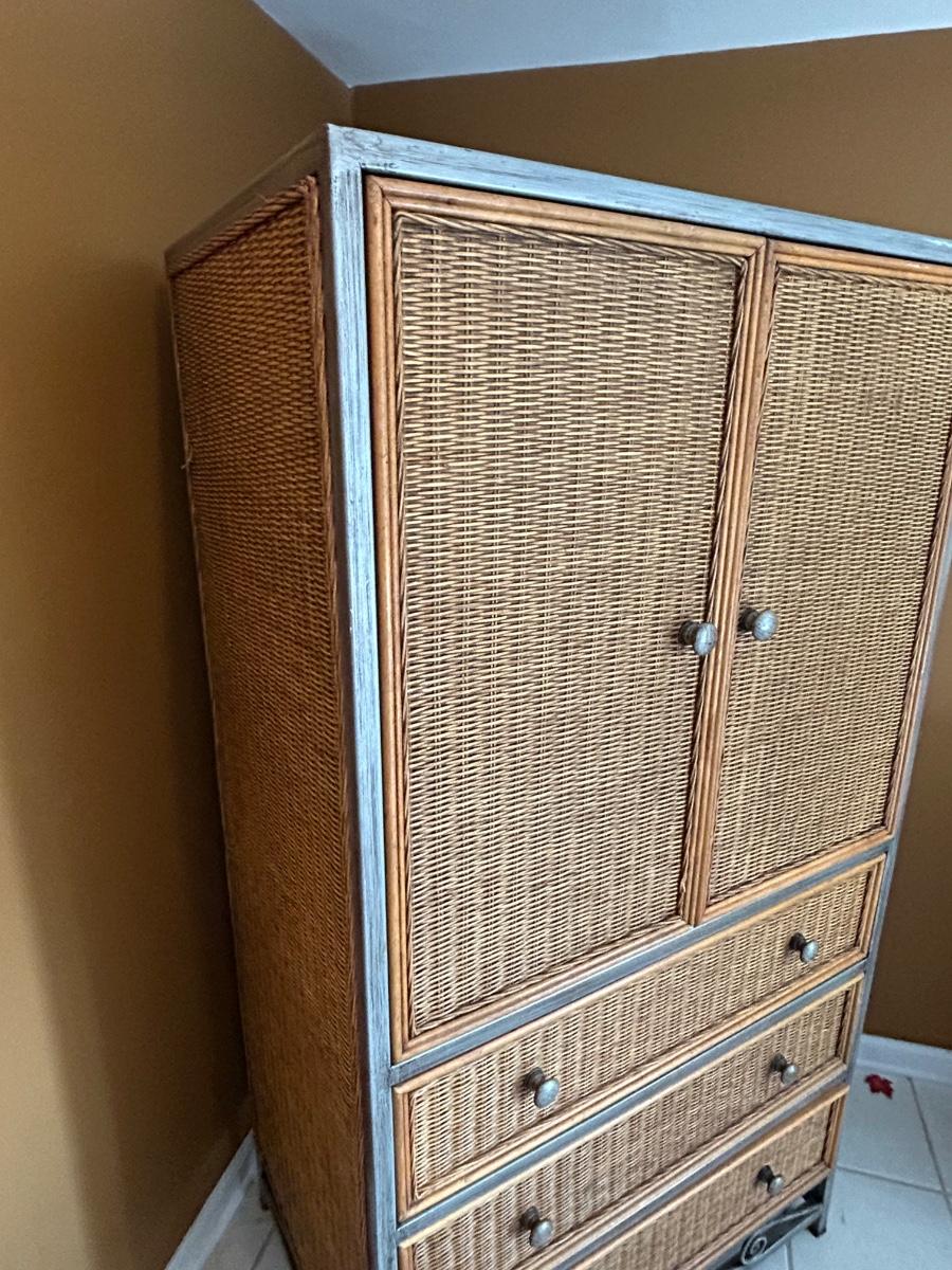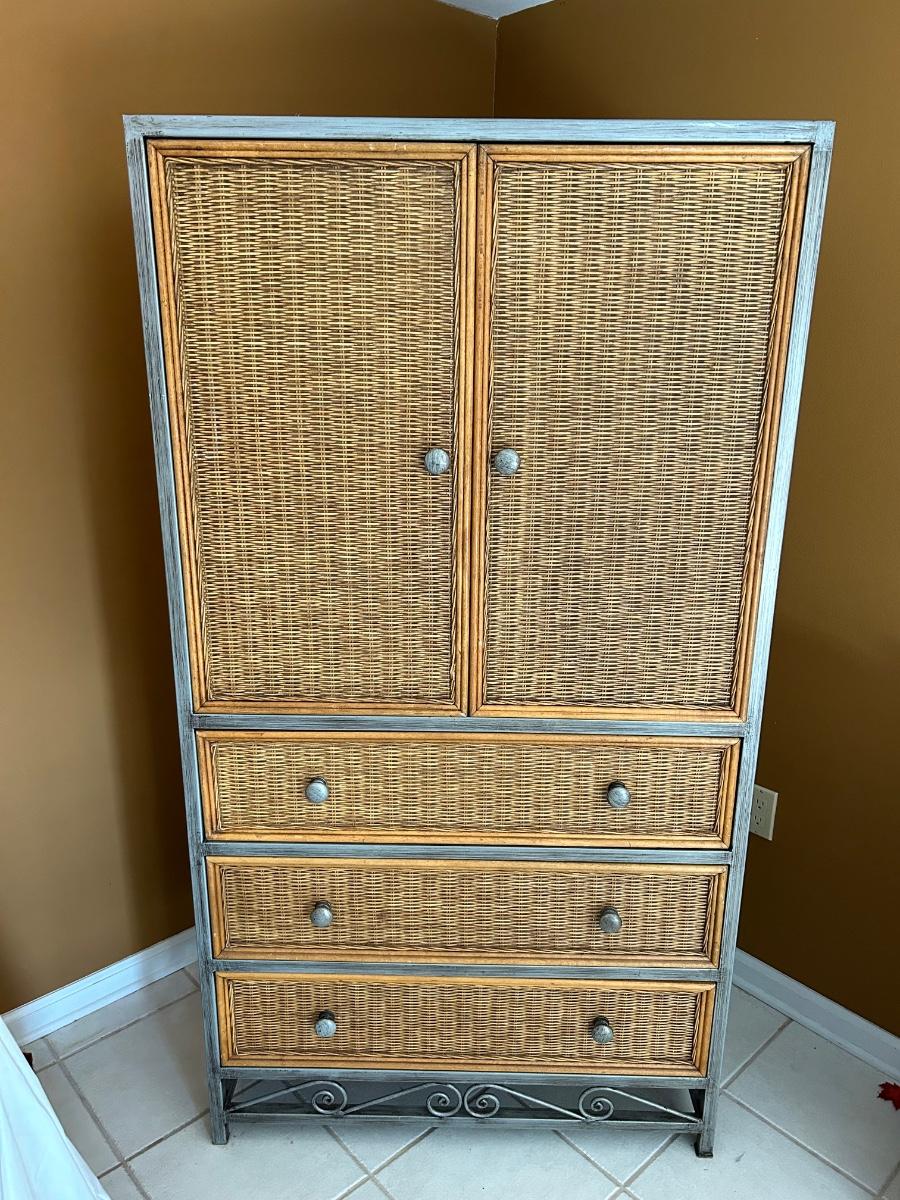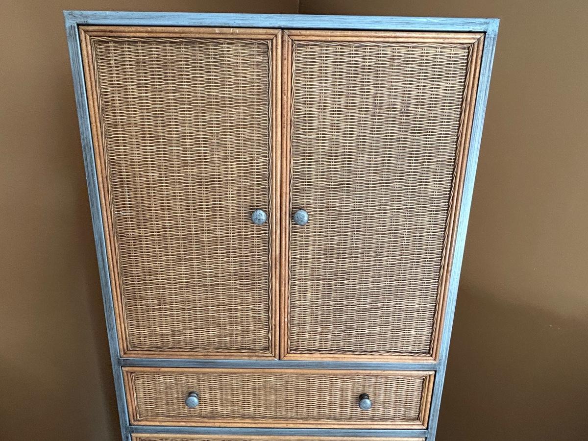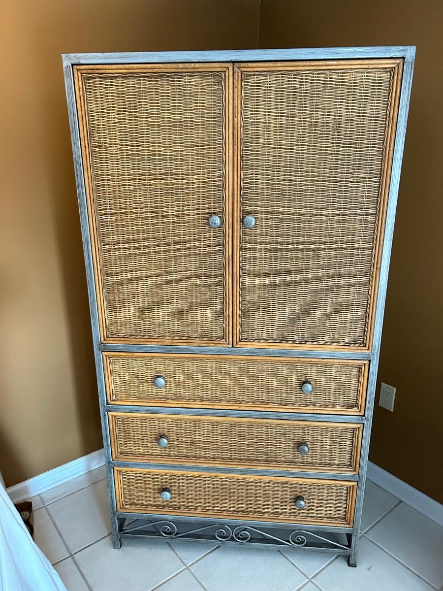 36”x24”x67” Wicker Armoire/ media cabinet with three drawers. Wicker with metal frame.