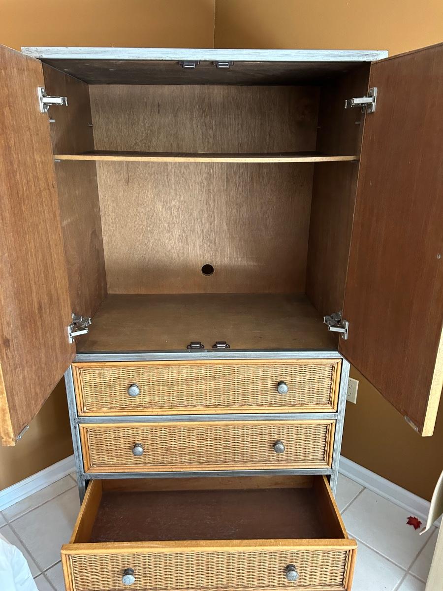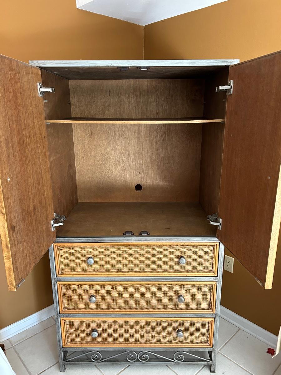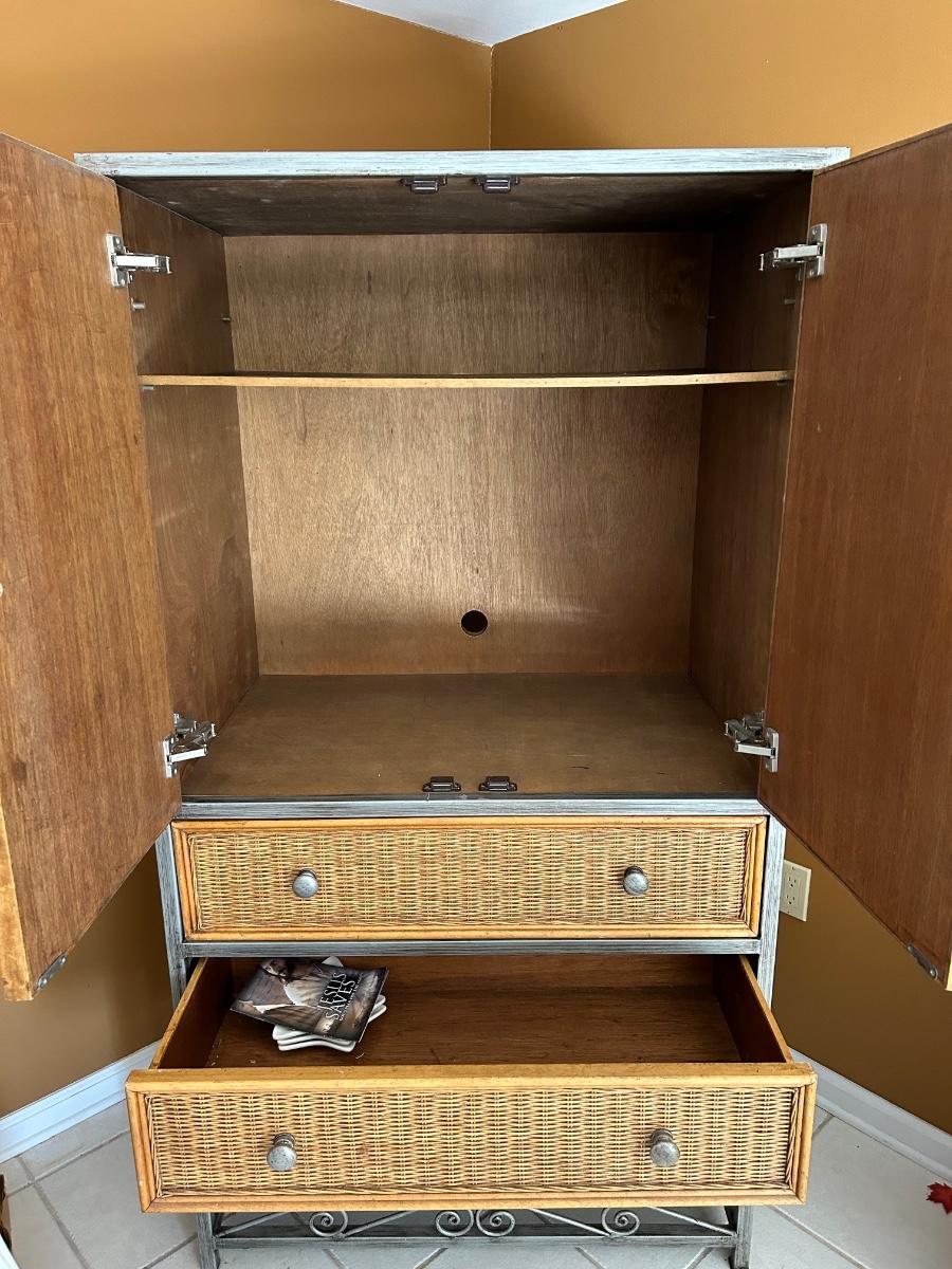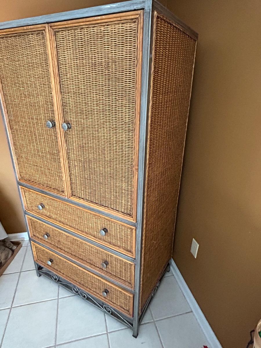 36”x24”x67” Wicker Armoire/ media cabinet with three drawers. Wicker with metal frame.