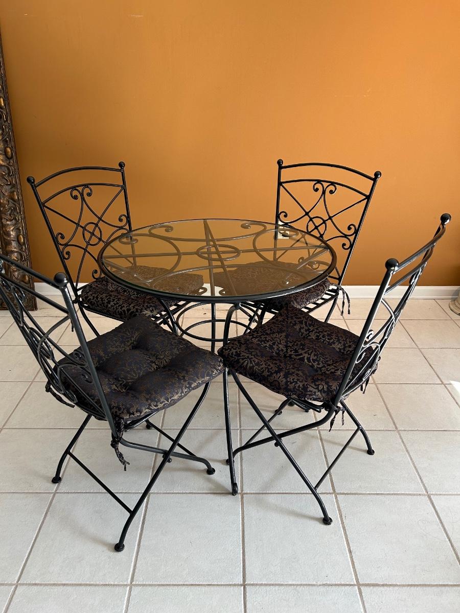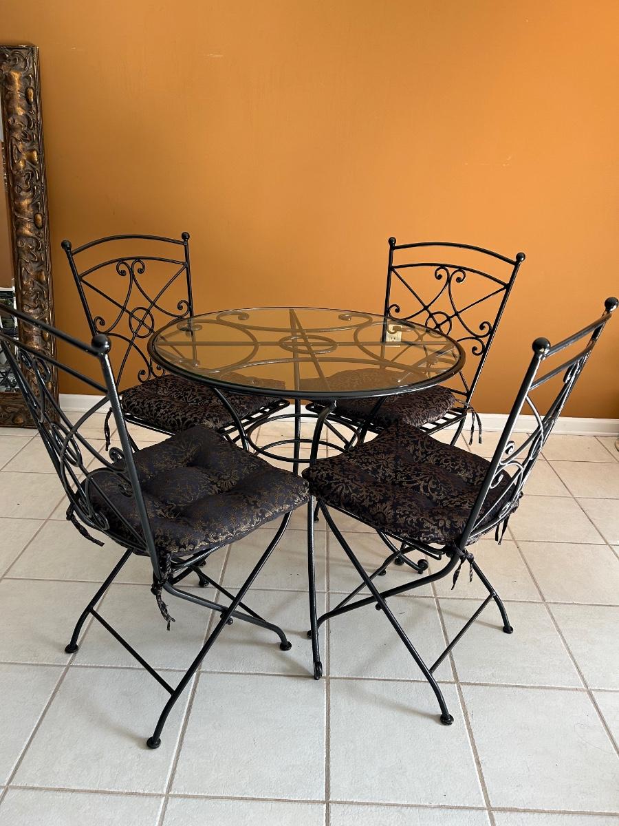 Glass top table w metal frame 30” round table. Four folding metal chairs.