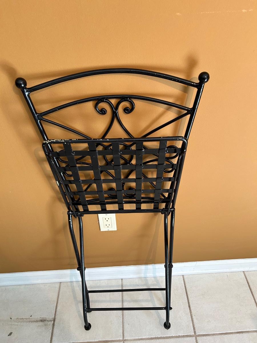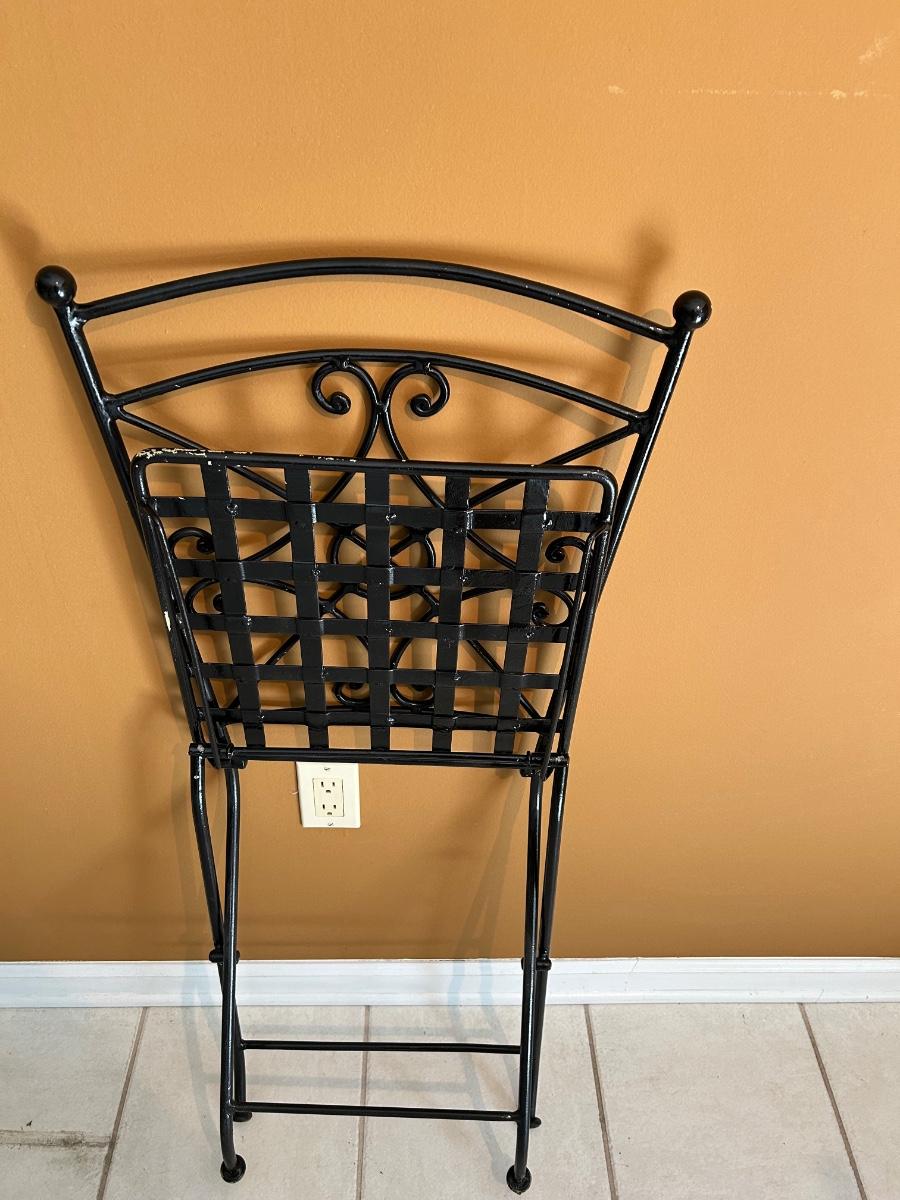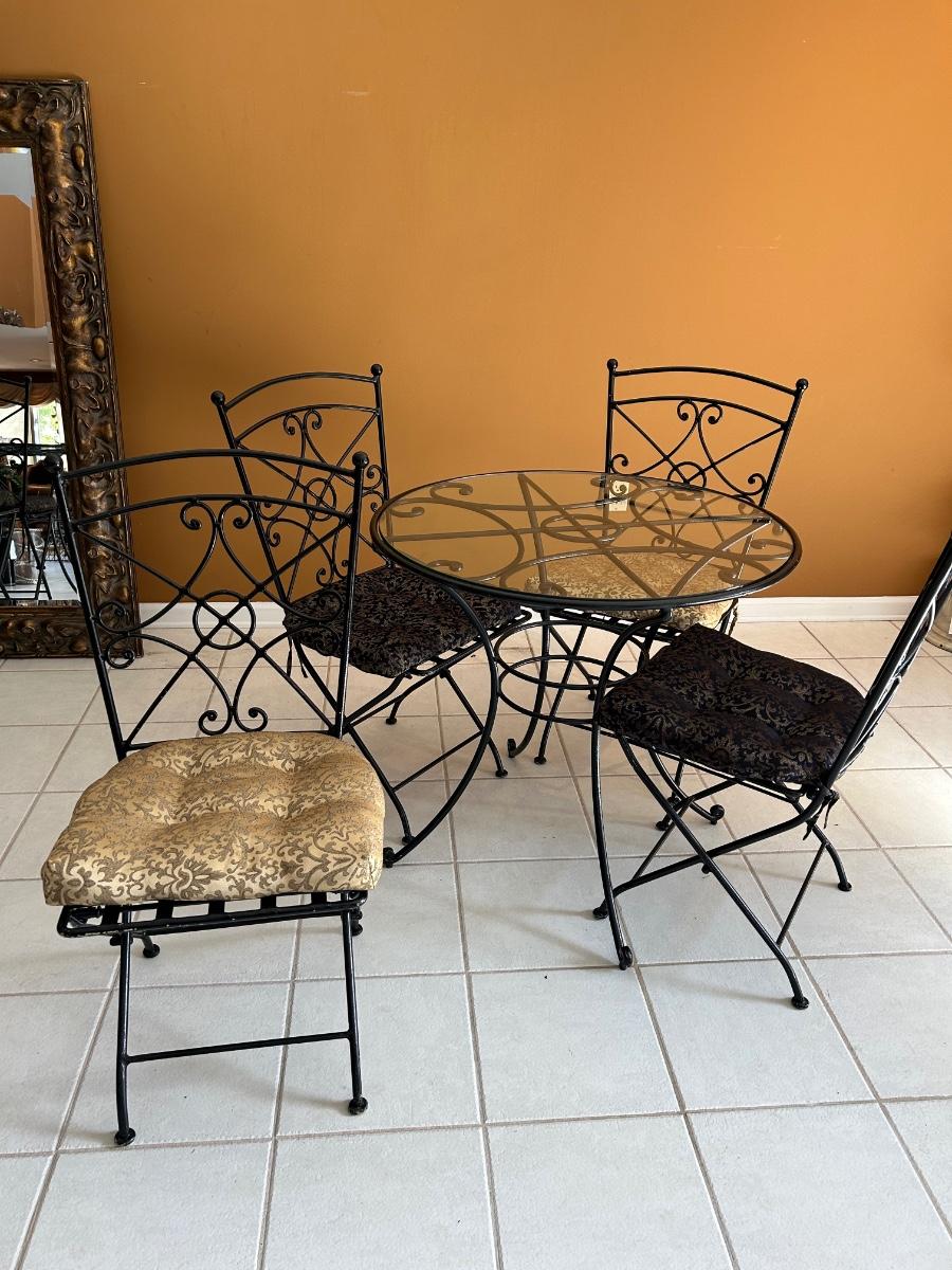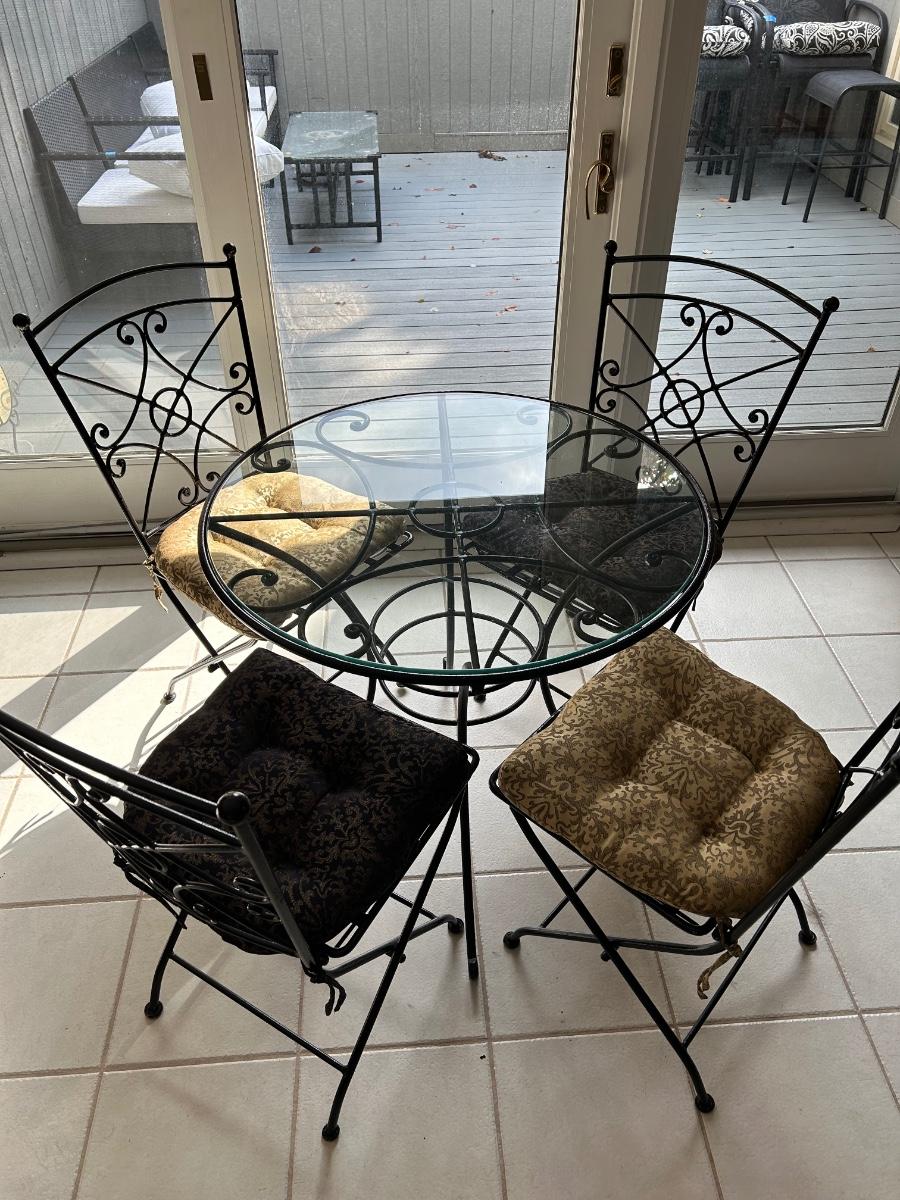 Glass top table with metal base. 30” round. Four folding metal chairs.