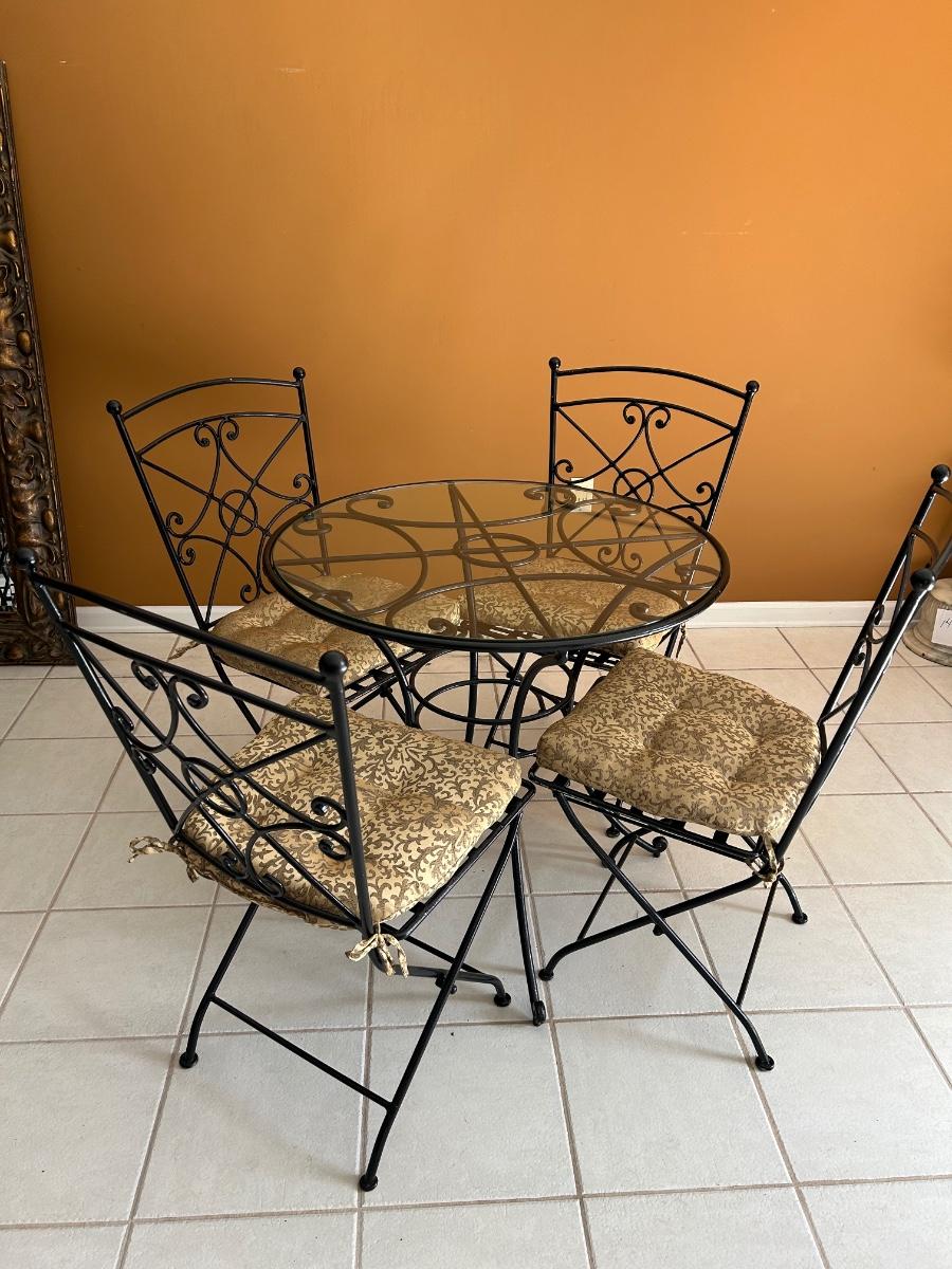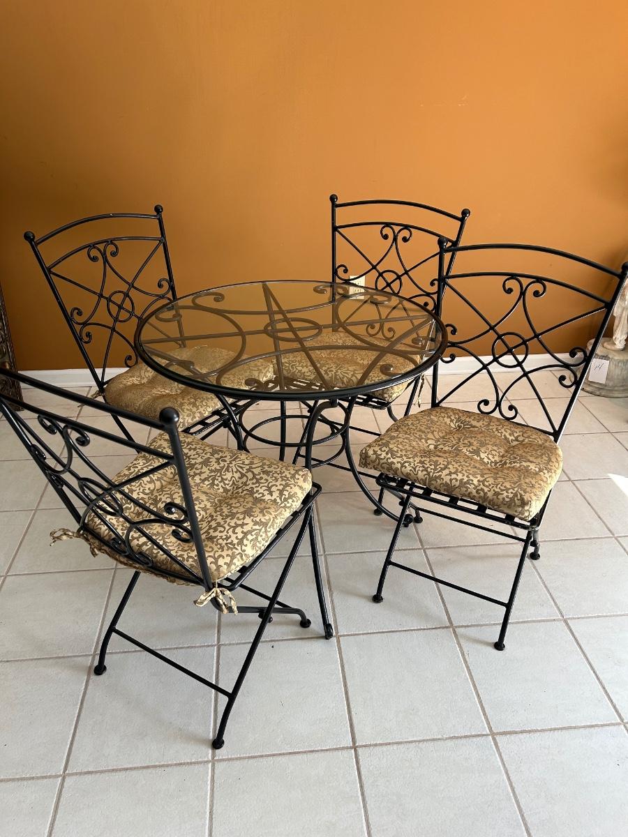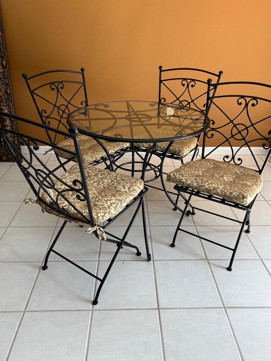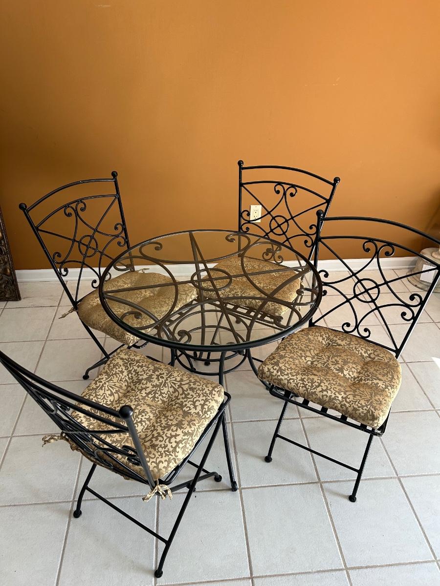 30” Round Glass top table w metal frame. Four folding metal chairs.