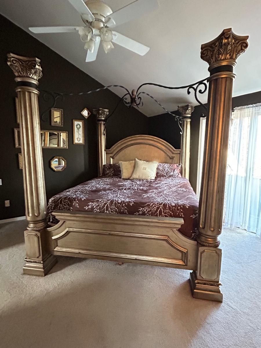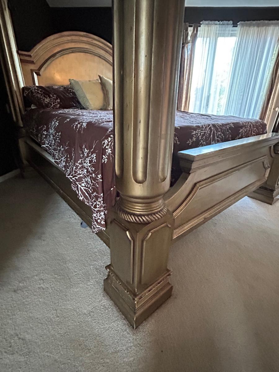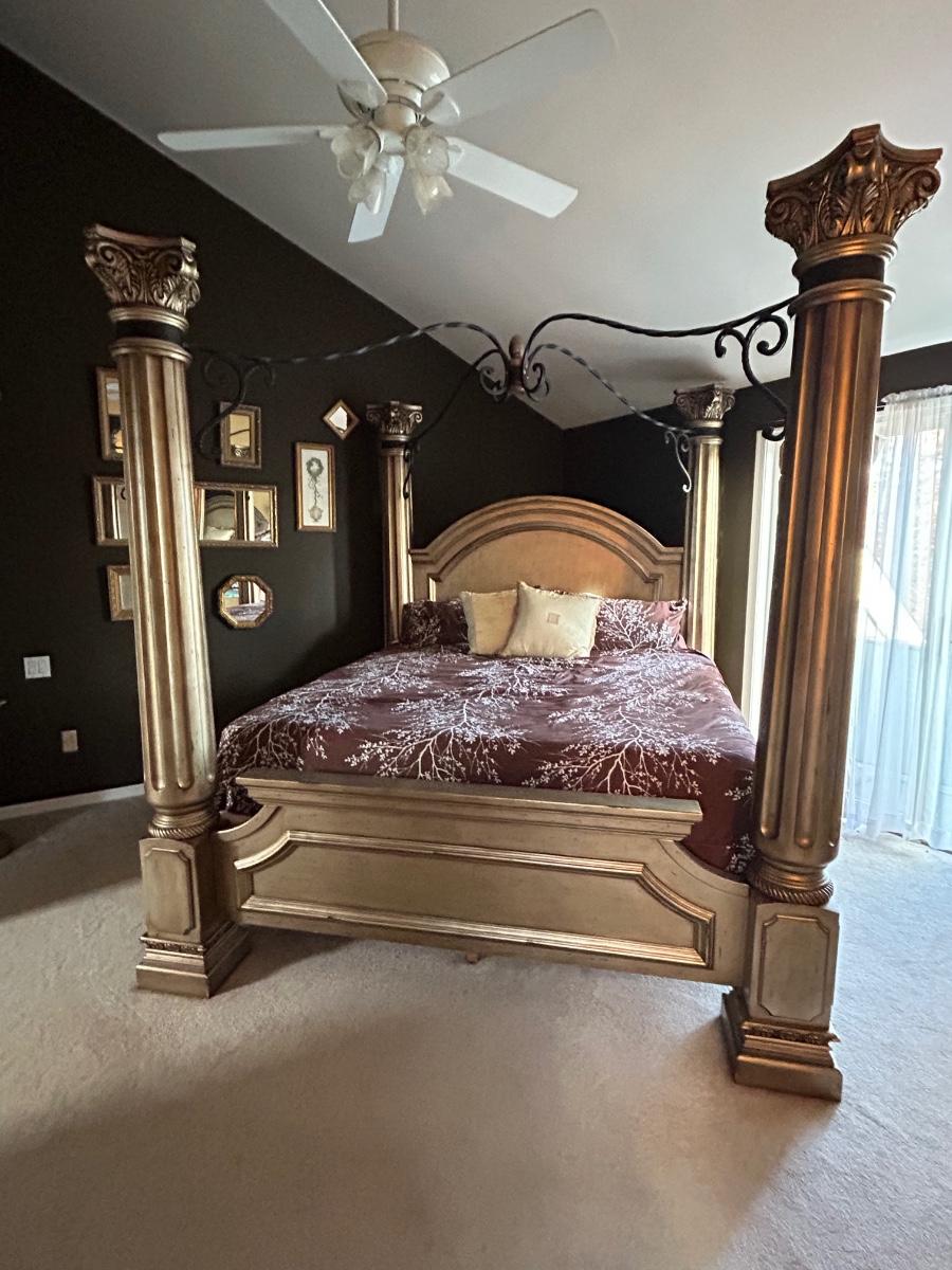 85”x92” King size bed frame. Frame has four post w metal detailing. Gold tone color.