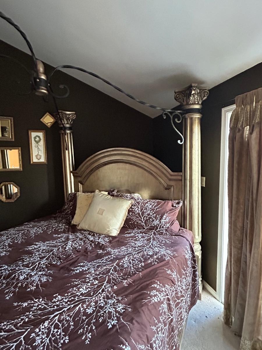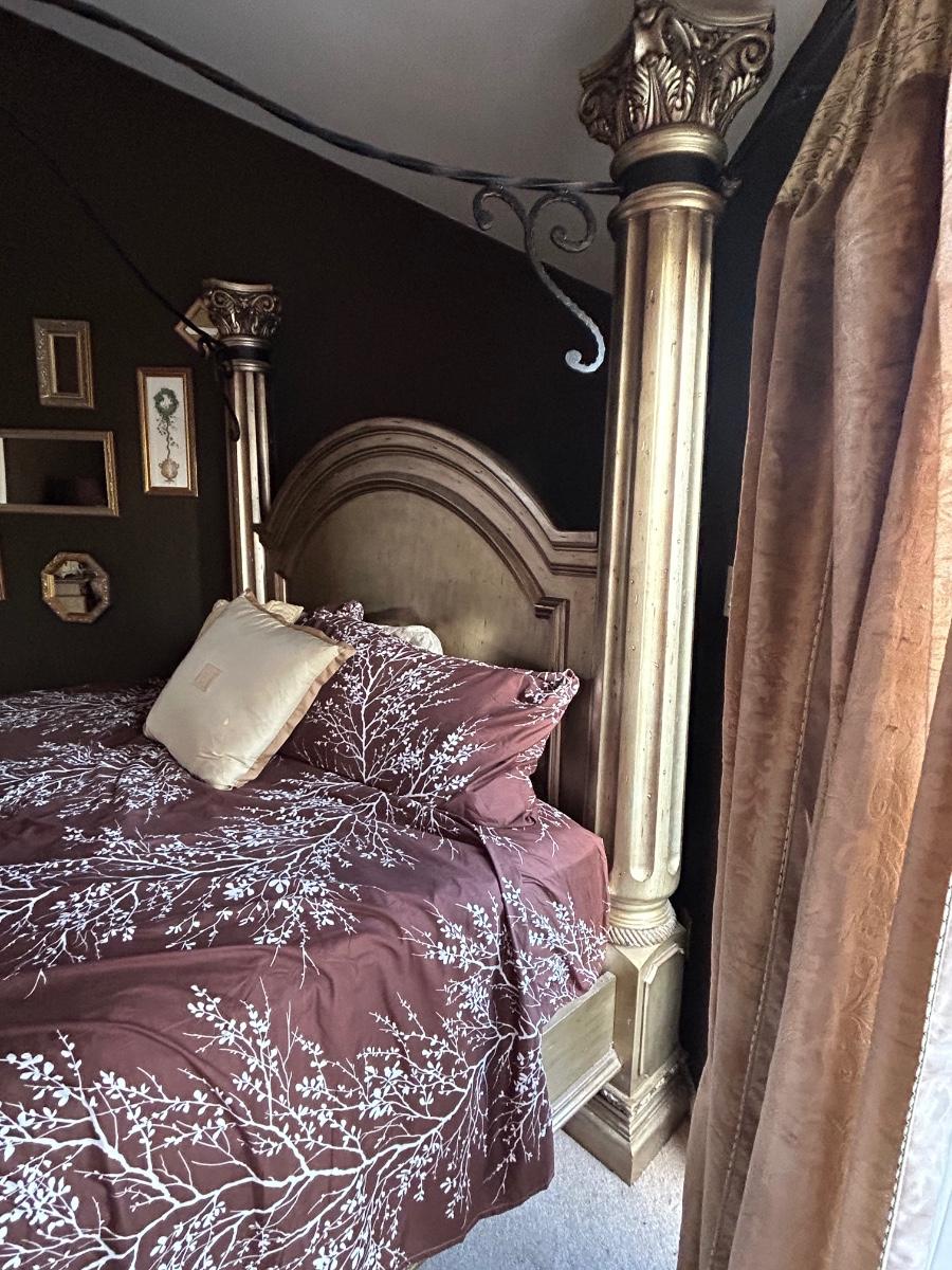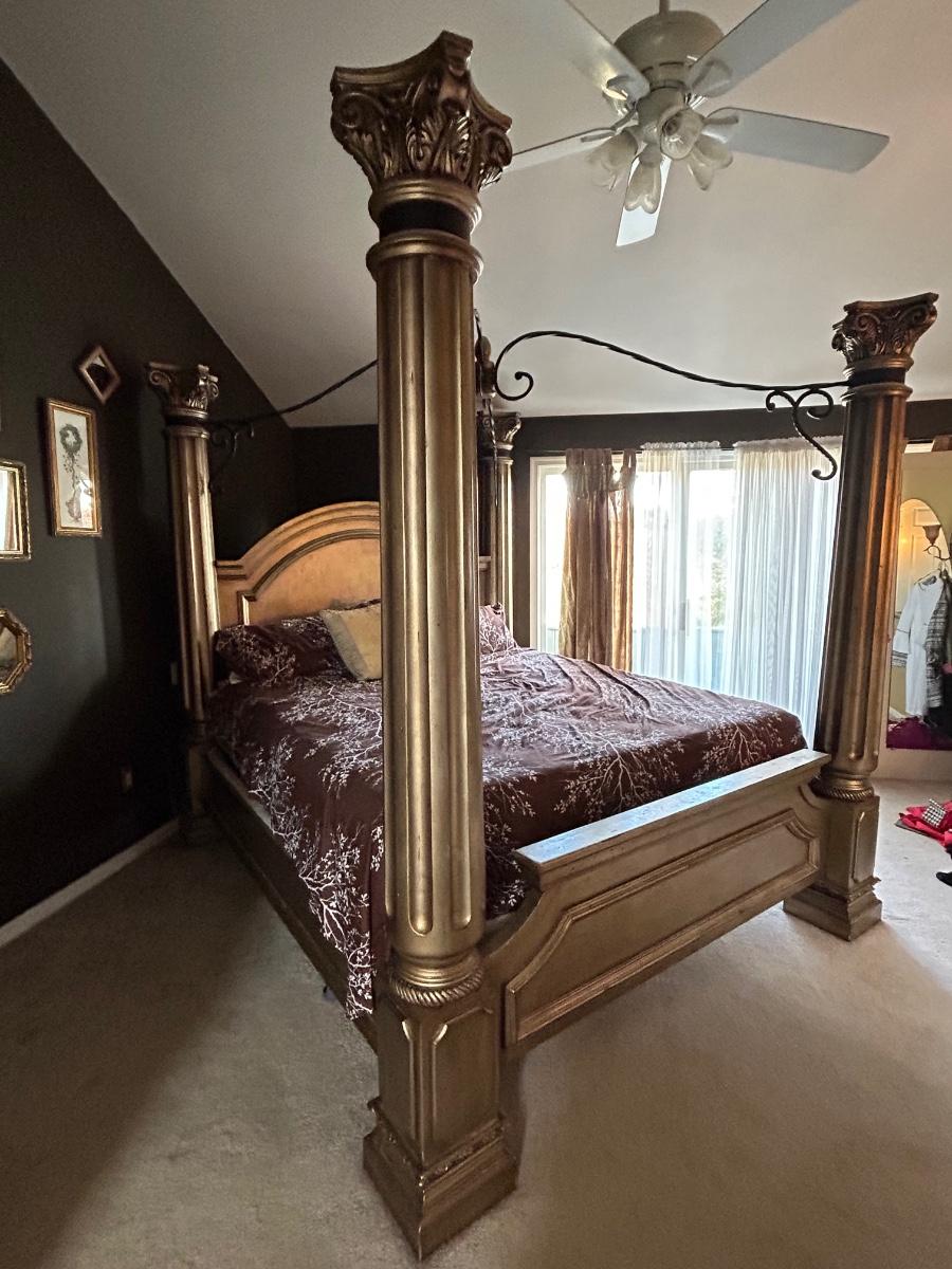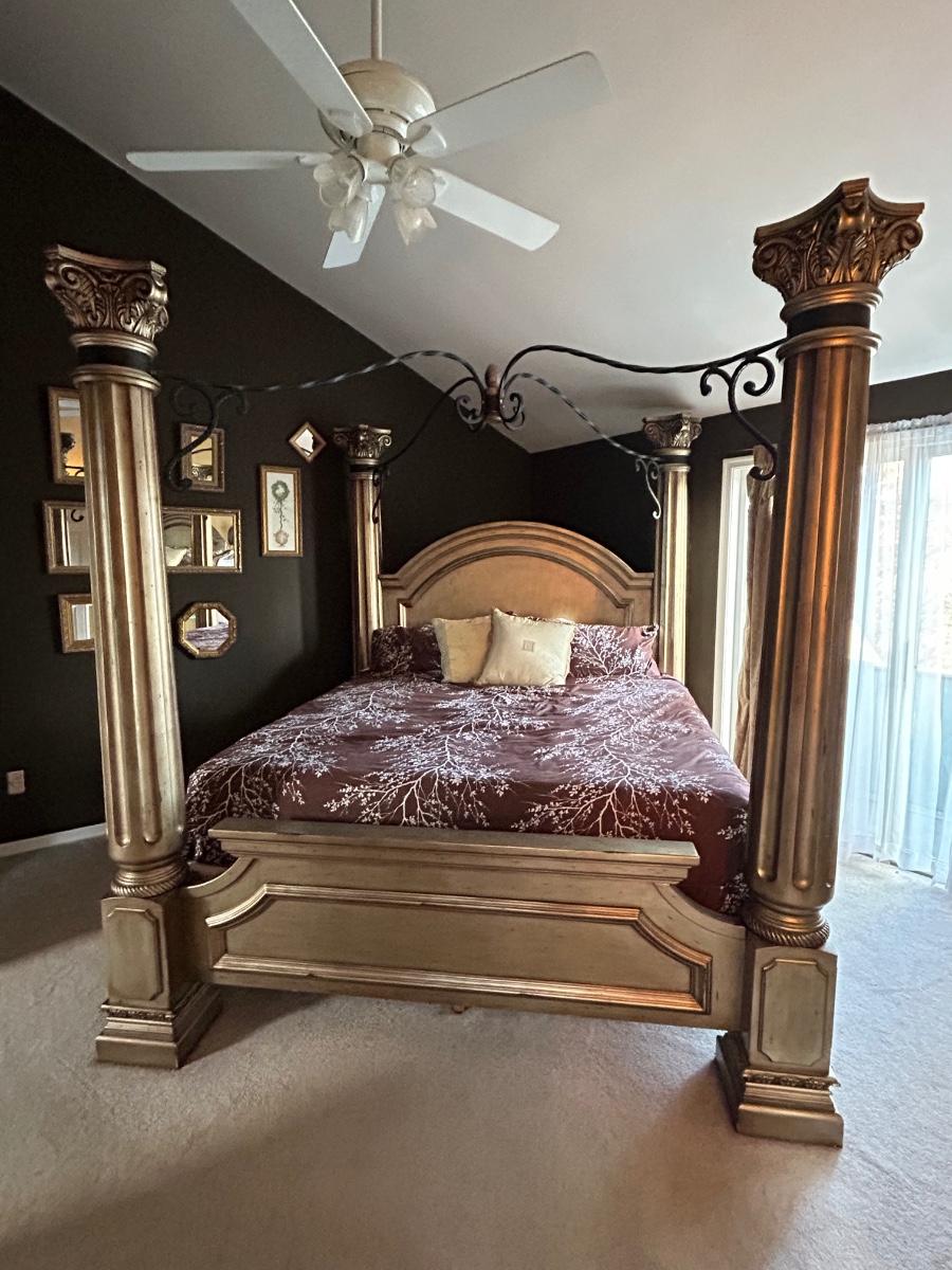 85”x92” King size bed frame. Frame has four post w metal detailing. Gold tone color.