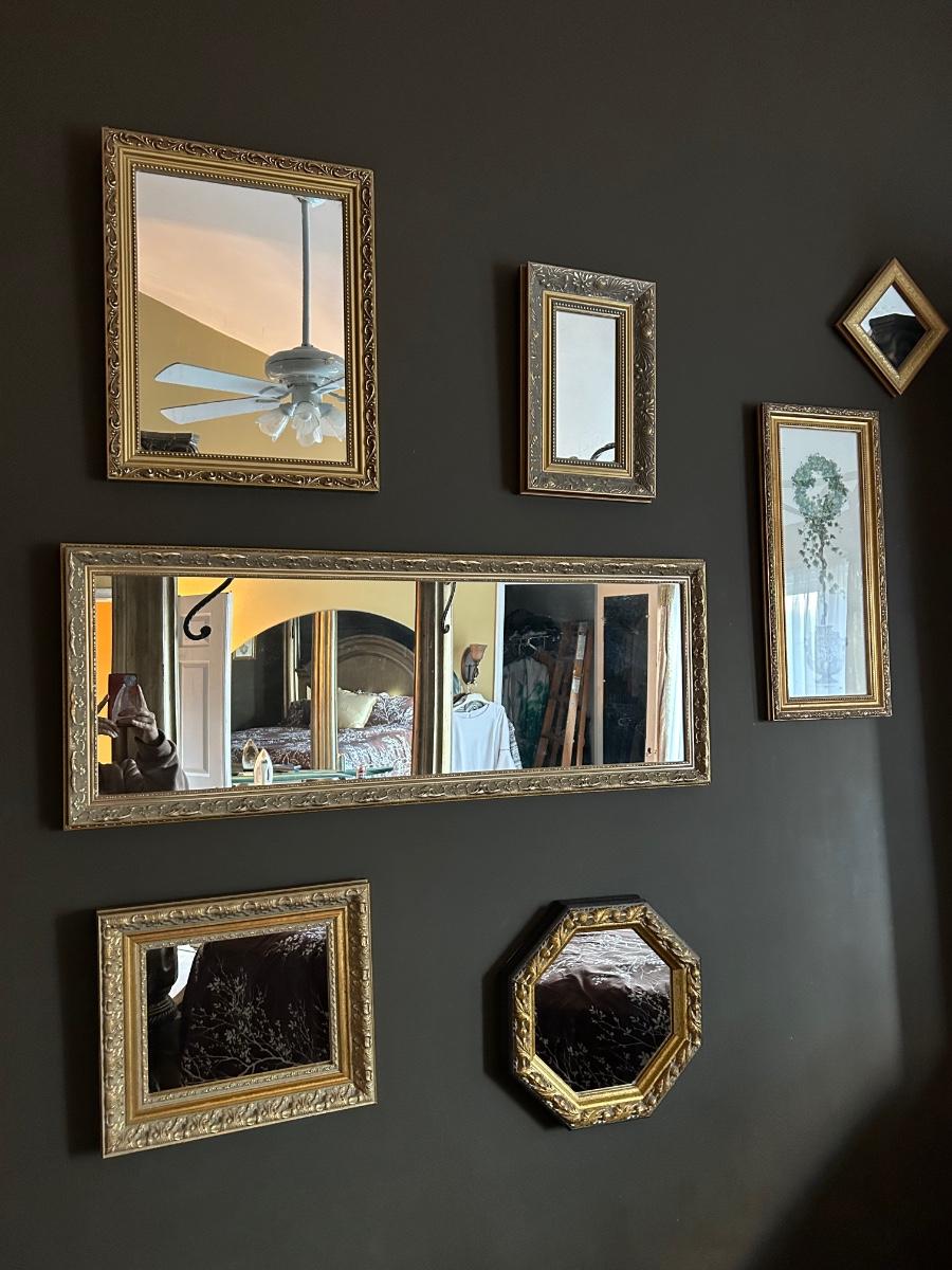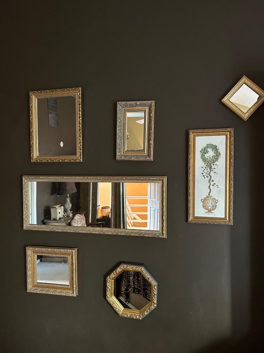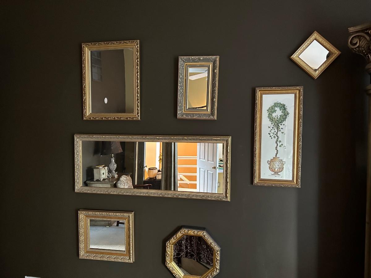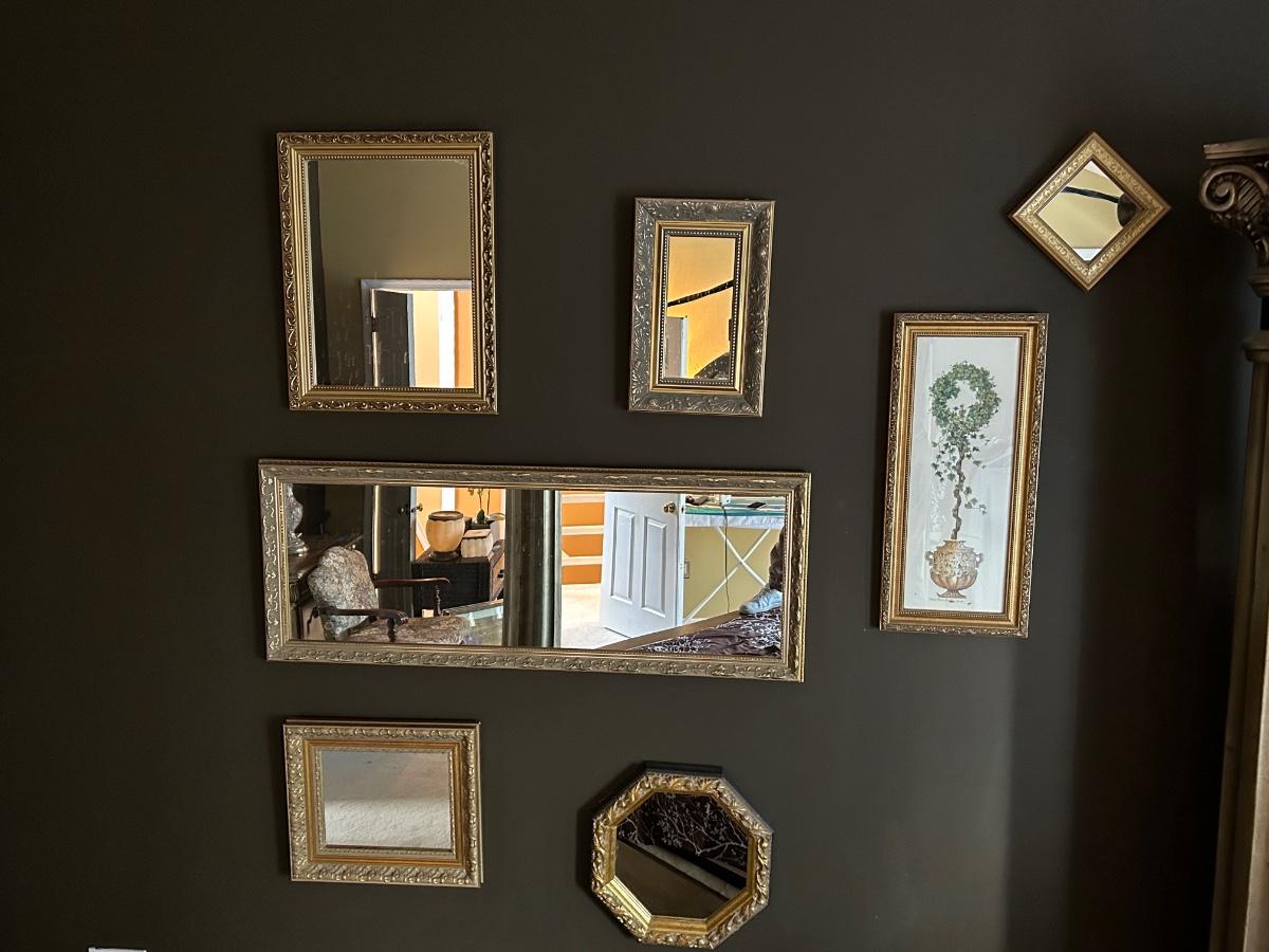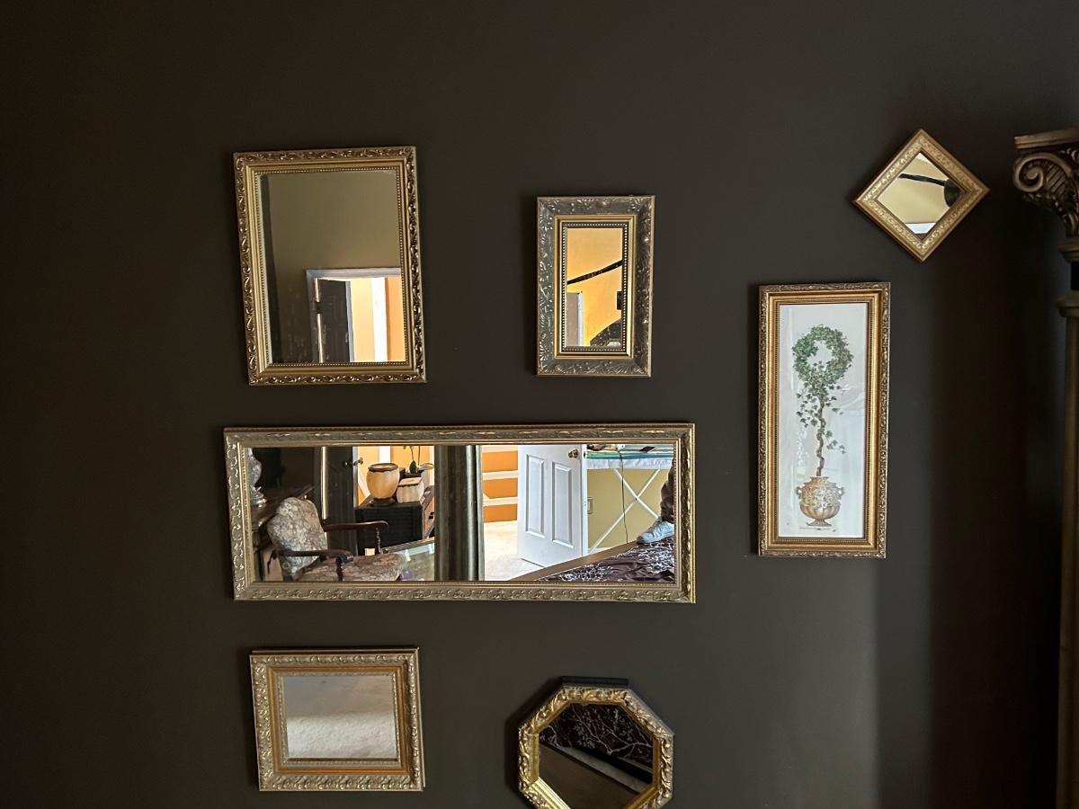 Six gold framed mirrors and one framed print. Various sizes to make a beautiful gallery art wall.