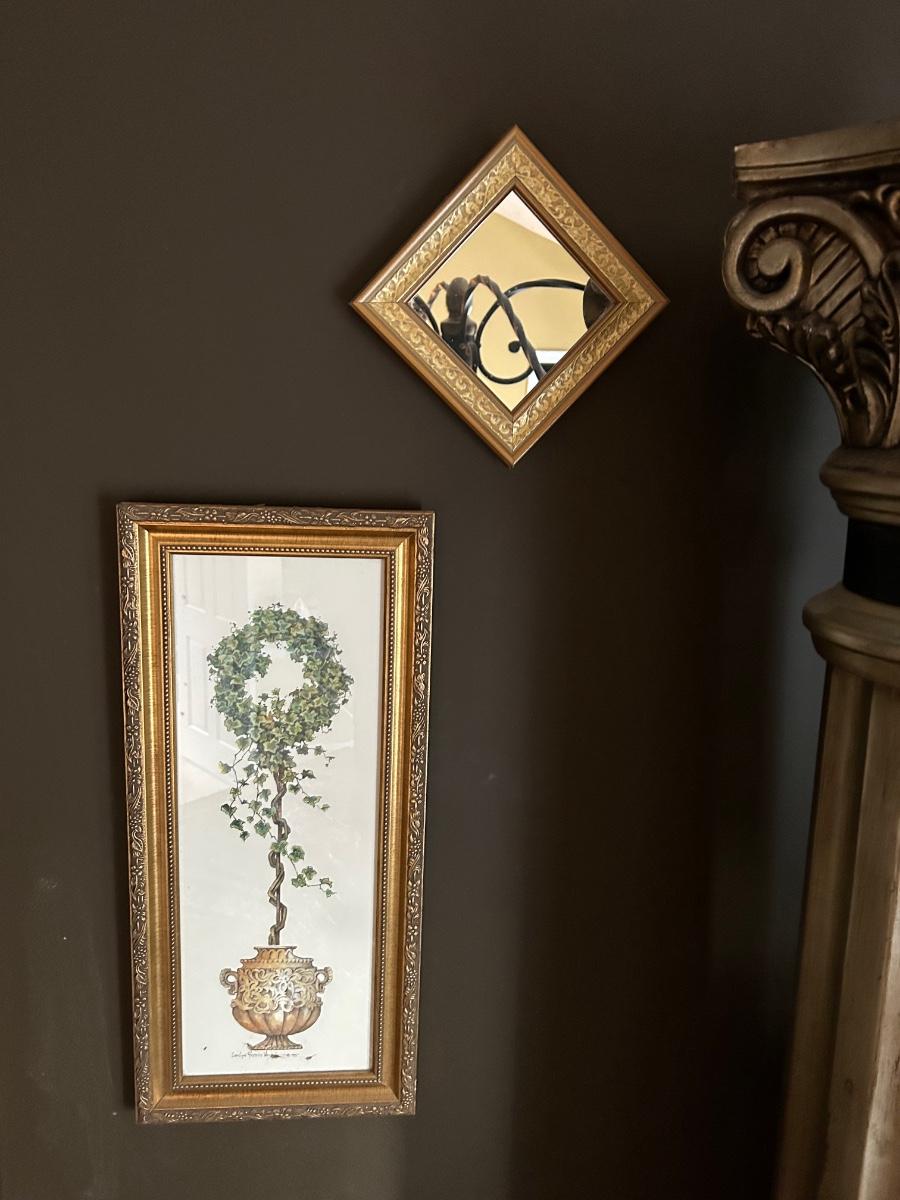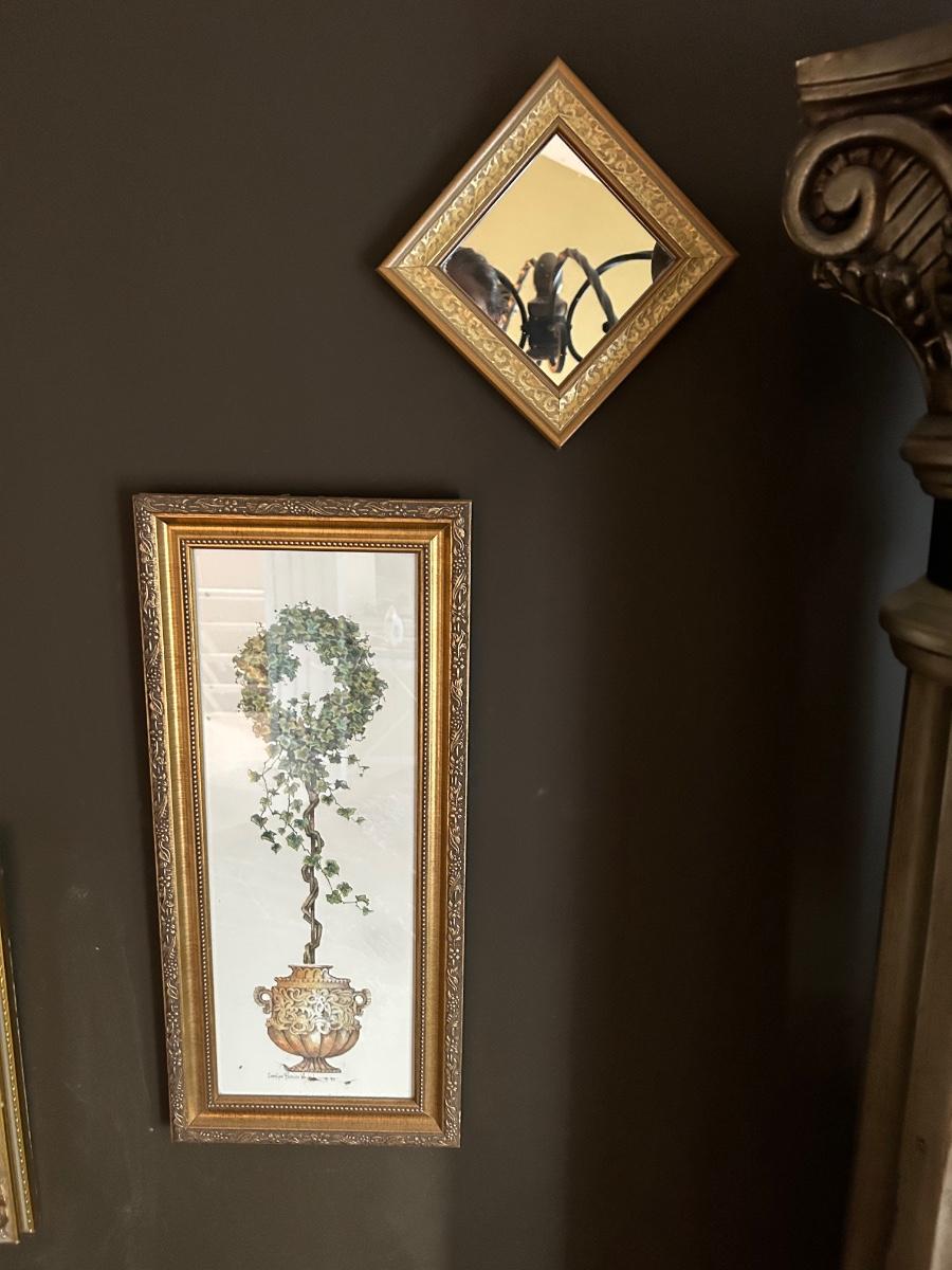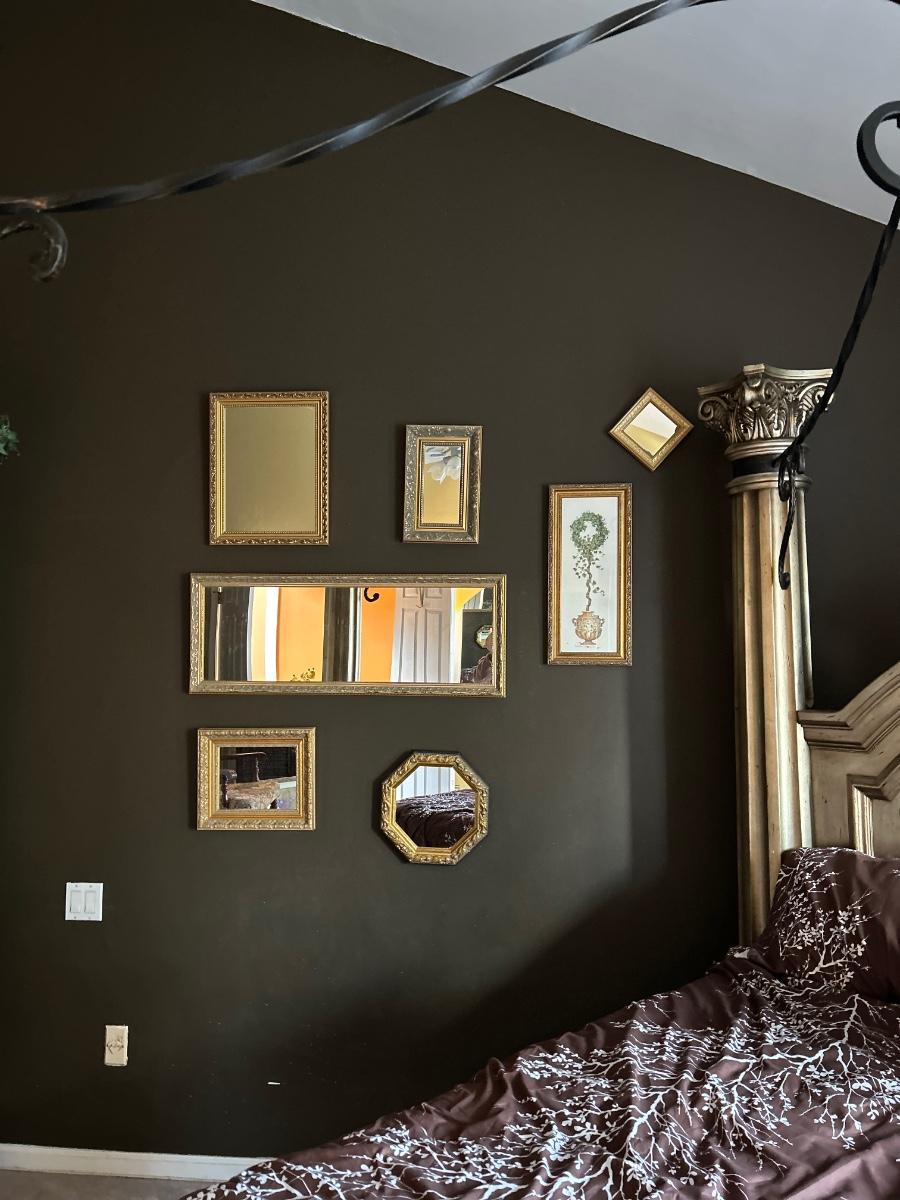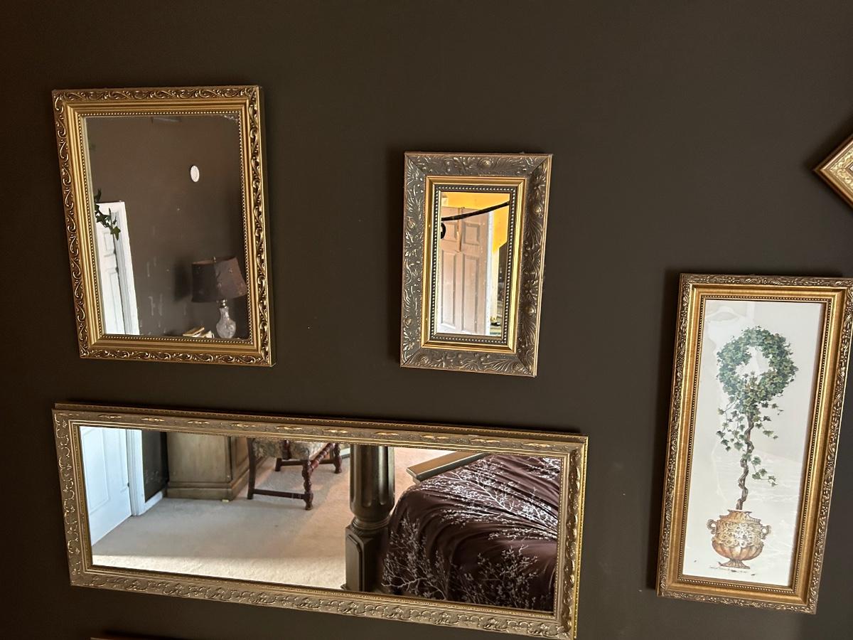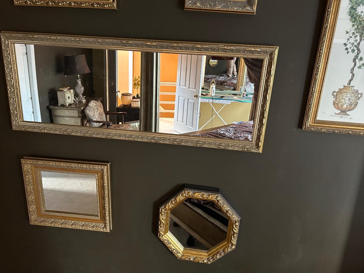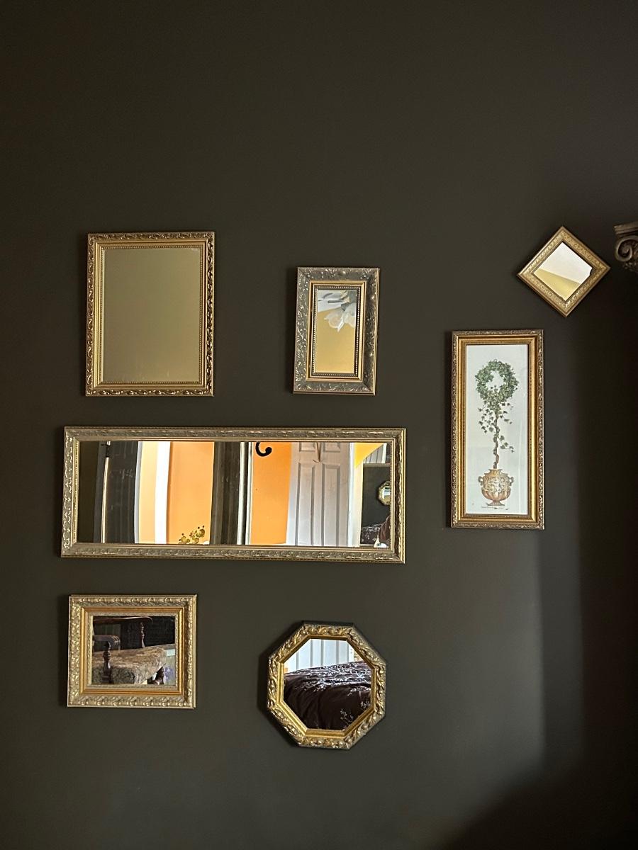 Six gold framed mirrors and one framed print. Various sizes to make a beautiful gallery art wall.