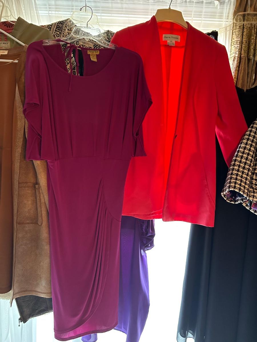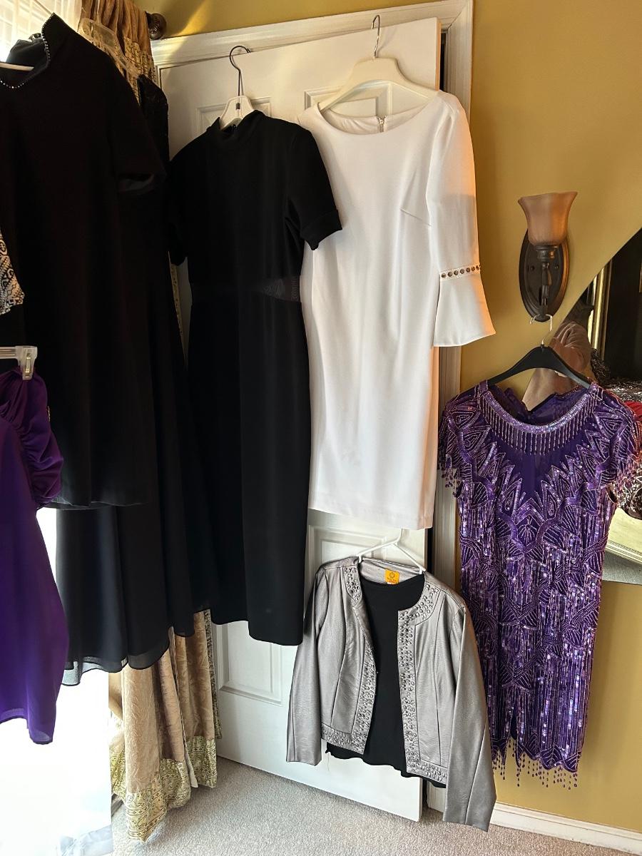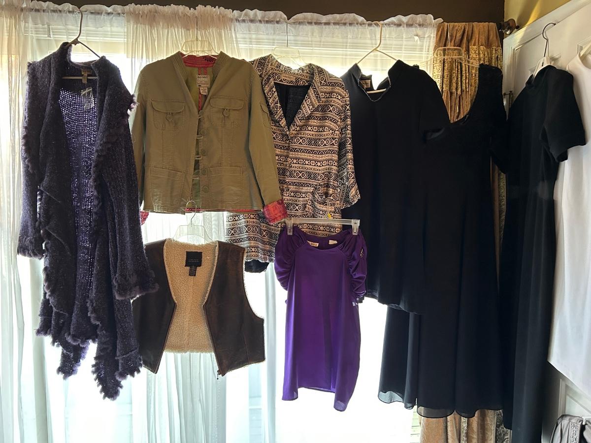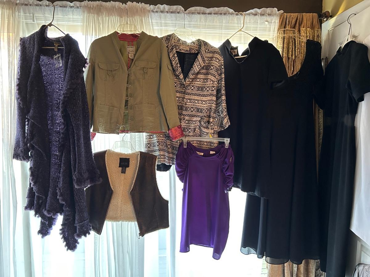 Large walk in closet filled with clothes, shoes, handbags and accessories. Photos show samples of the clothing inside. Various sizes from M-L 10-14.