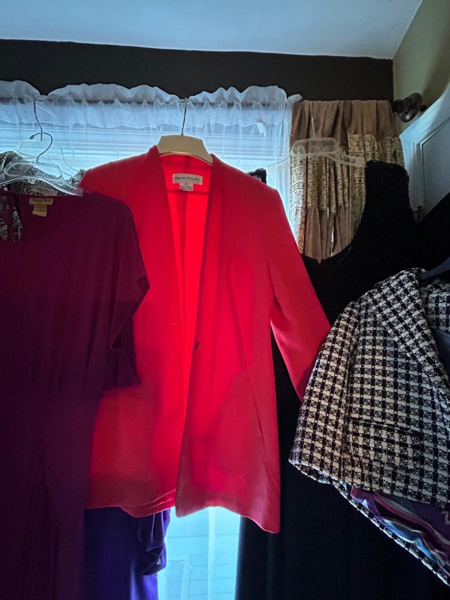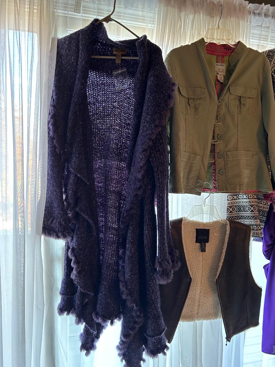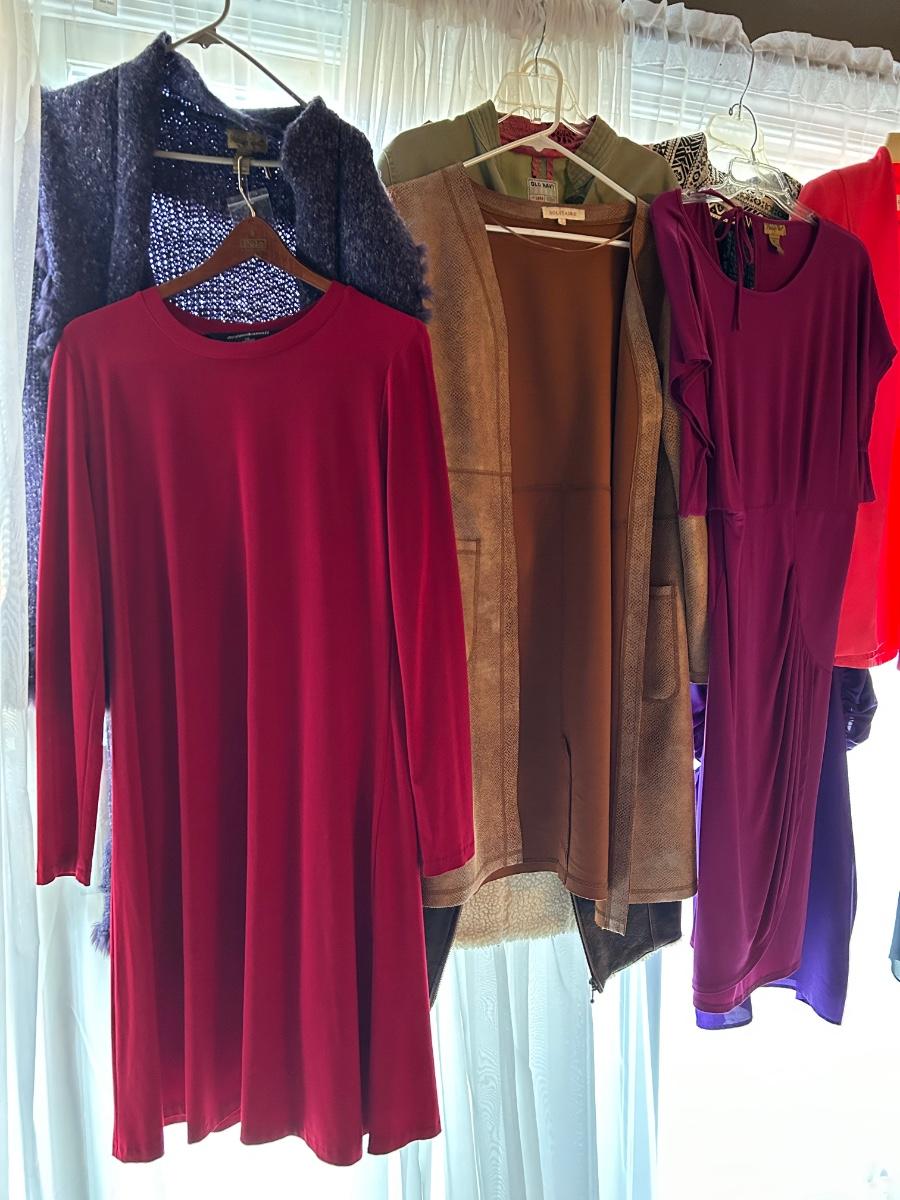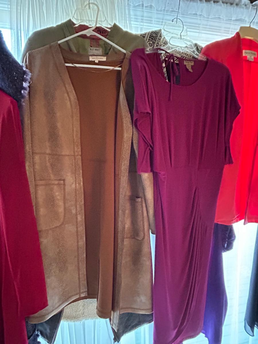 Large walk in closet filled with clothes, shoes, handbags and accessories. Photos show samples of the clothing inside. Various sizes from M-L 10-14.