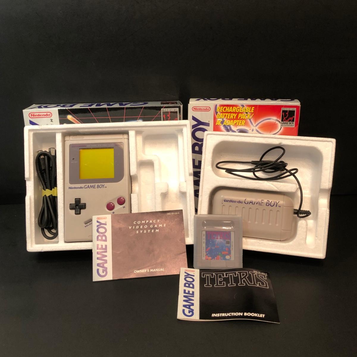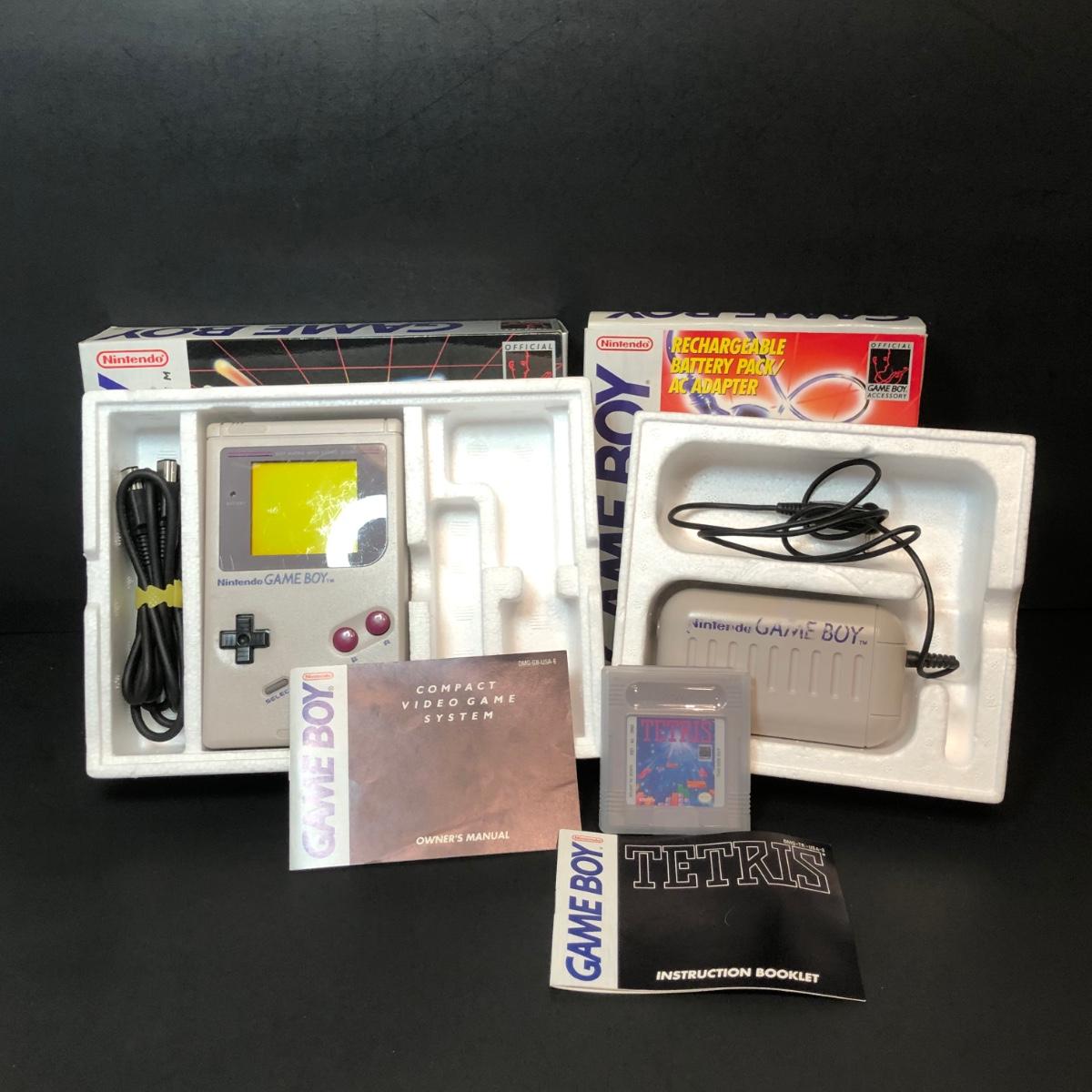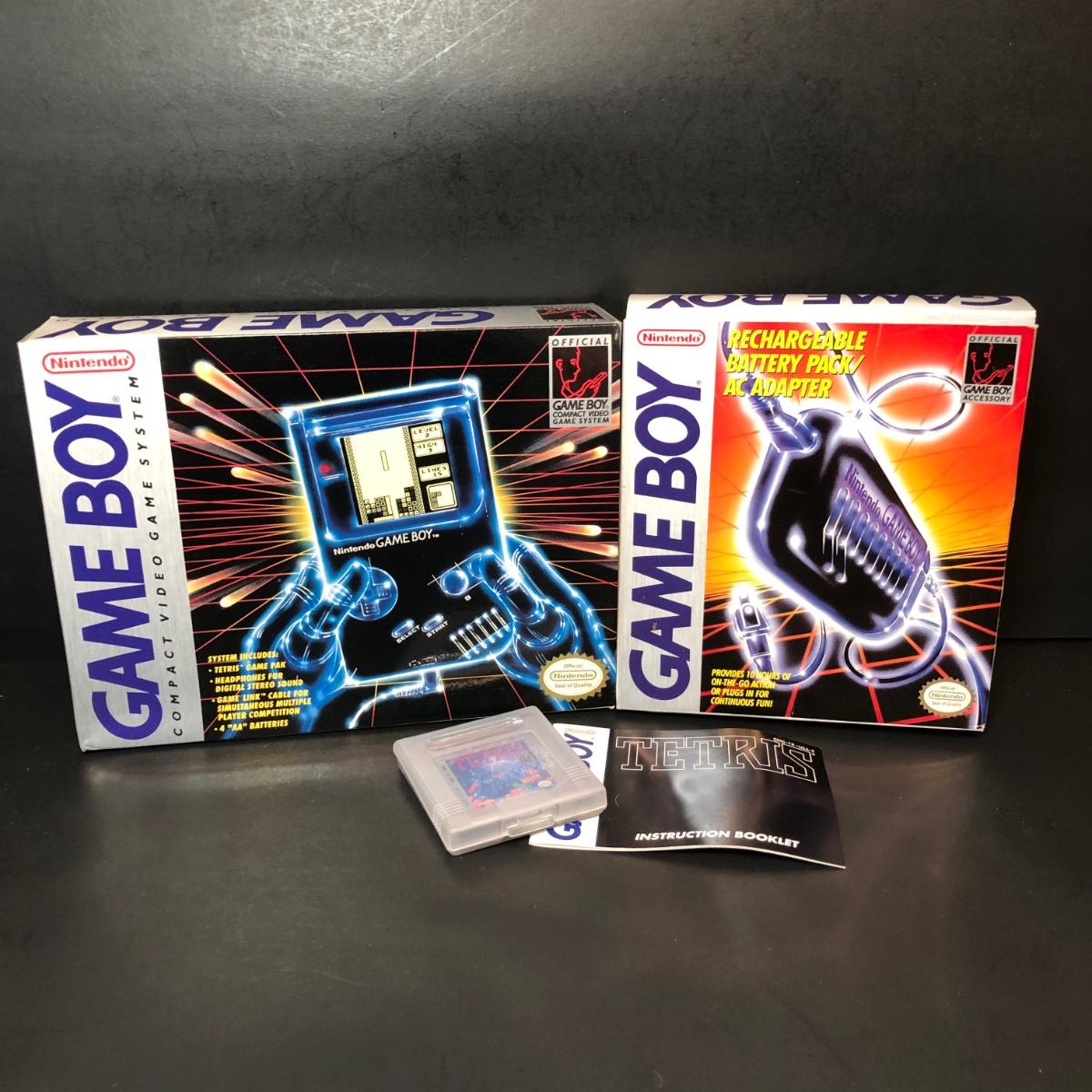 LOT 3M: Original Nintendo Game Boy w/ Box, Link Cable, Owner's Manual, Tetris Cartridge w/ Instructions & Rechargeable Battery Pack w/ Box