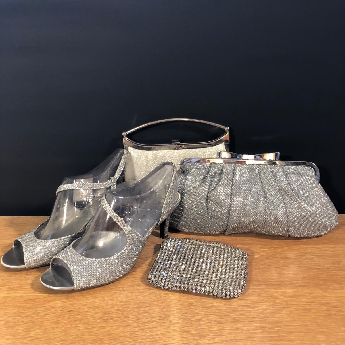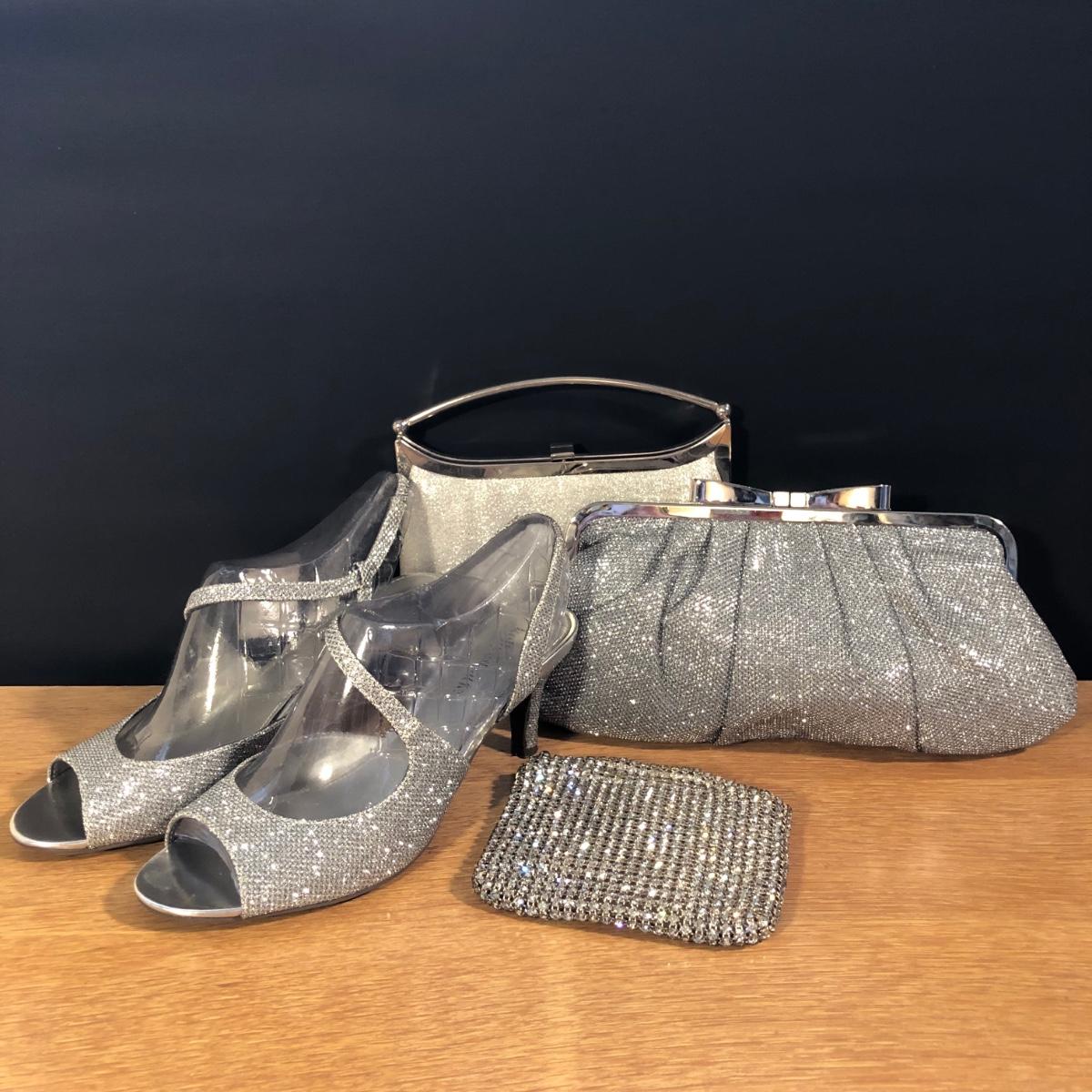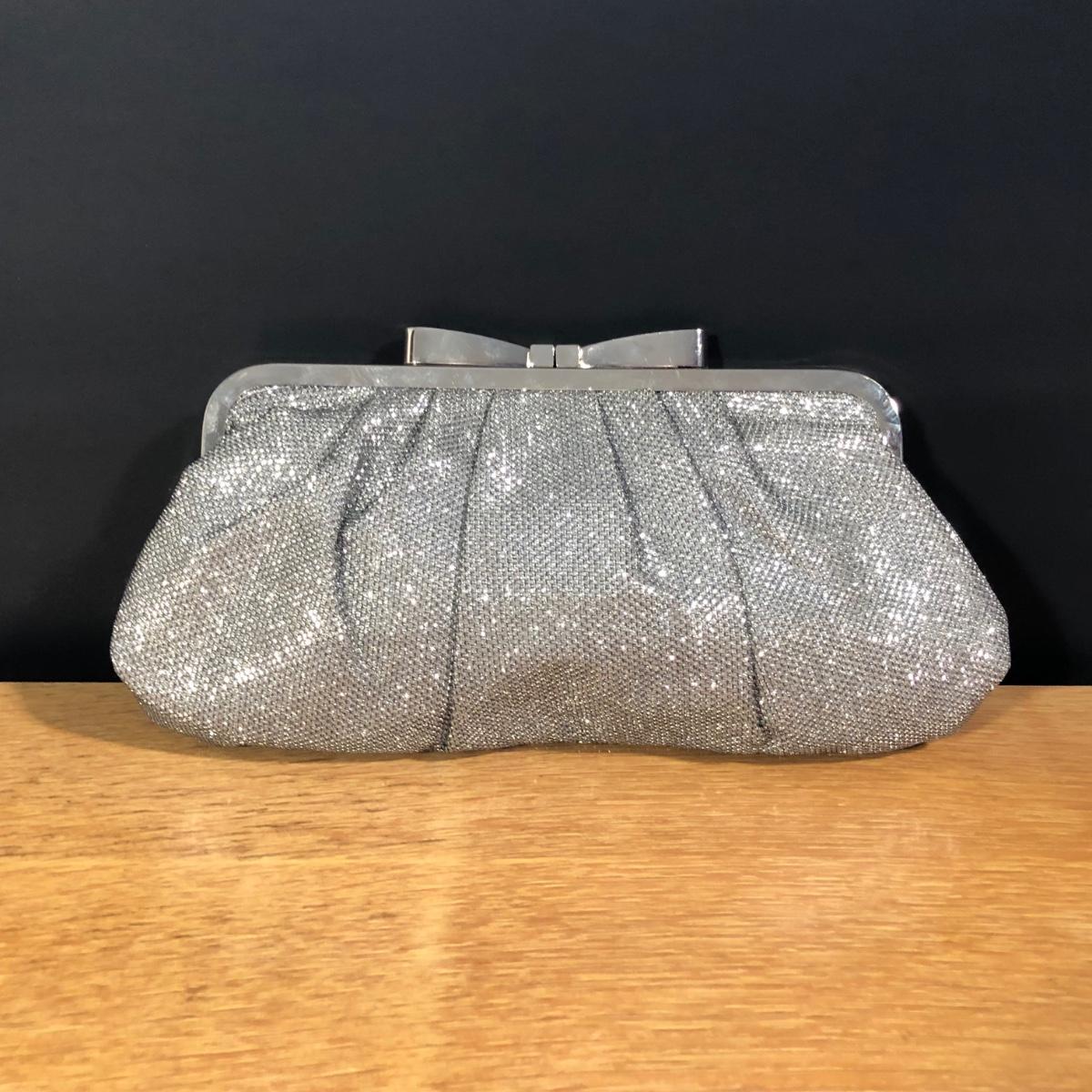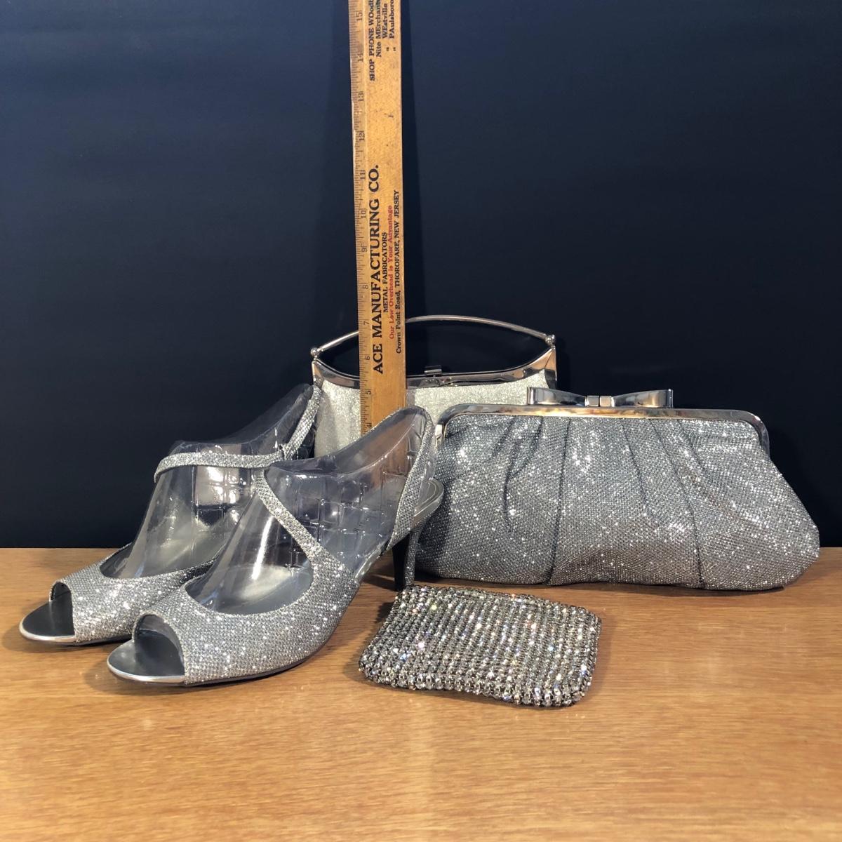LOT 17M: So Sparkly! Kelly & Katie Silver Heels (Size 7.5) w/ Rhinestone Coin Purse & Glittery Clutches