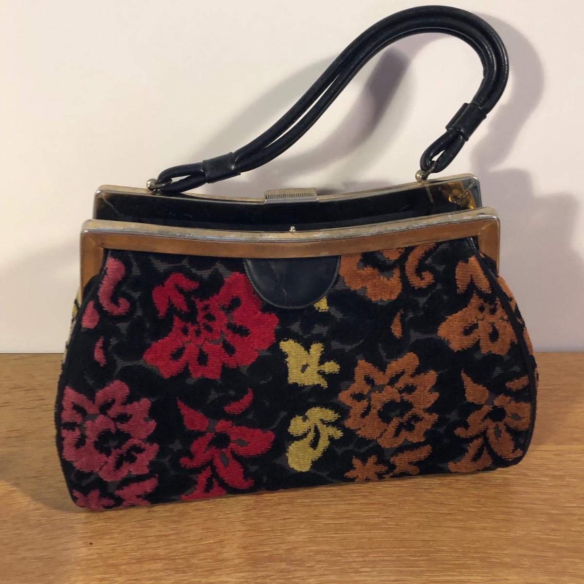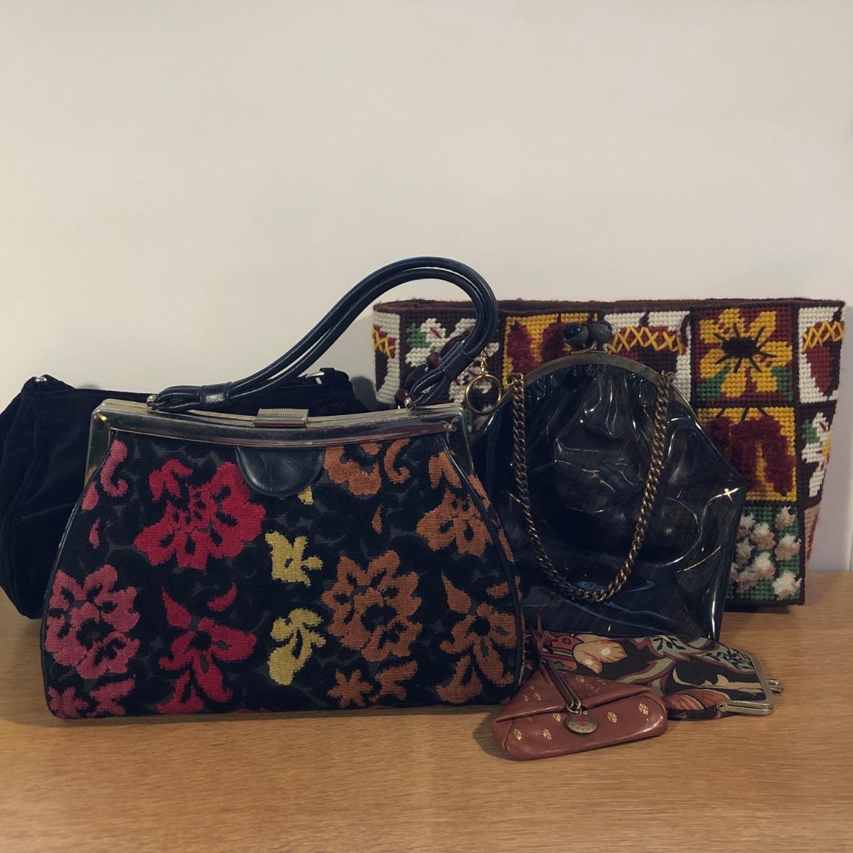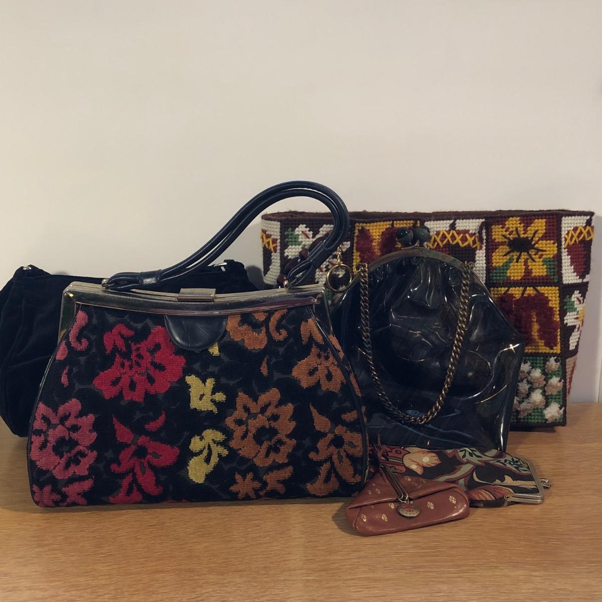 LOT 22M: Vintage Bags & More - Floral Carpet Bag, 1970s Nature Woven Bag, Vinyl Evening Bag, Firenze Coin Purse & More