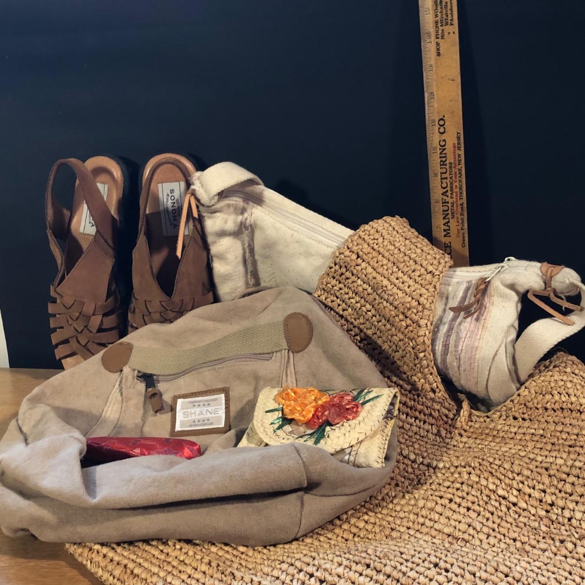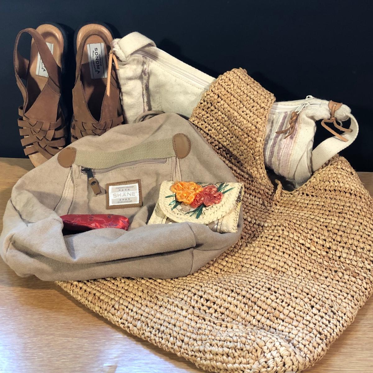 LOT 24M: Boho Collection - Sonoma Comfort Fisherman Sandals (size 7.5), Cotton Loom Bag, Shane Bag, Coin Purses & Jacqueline Ferror Straw Bag