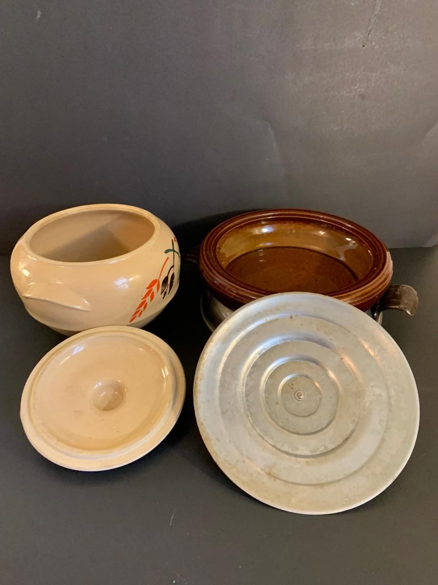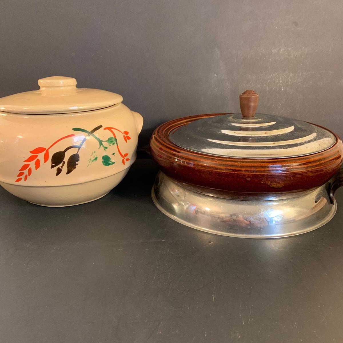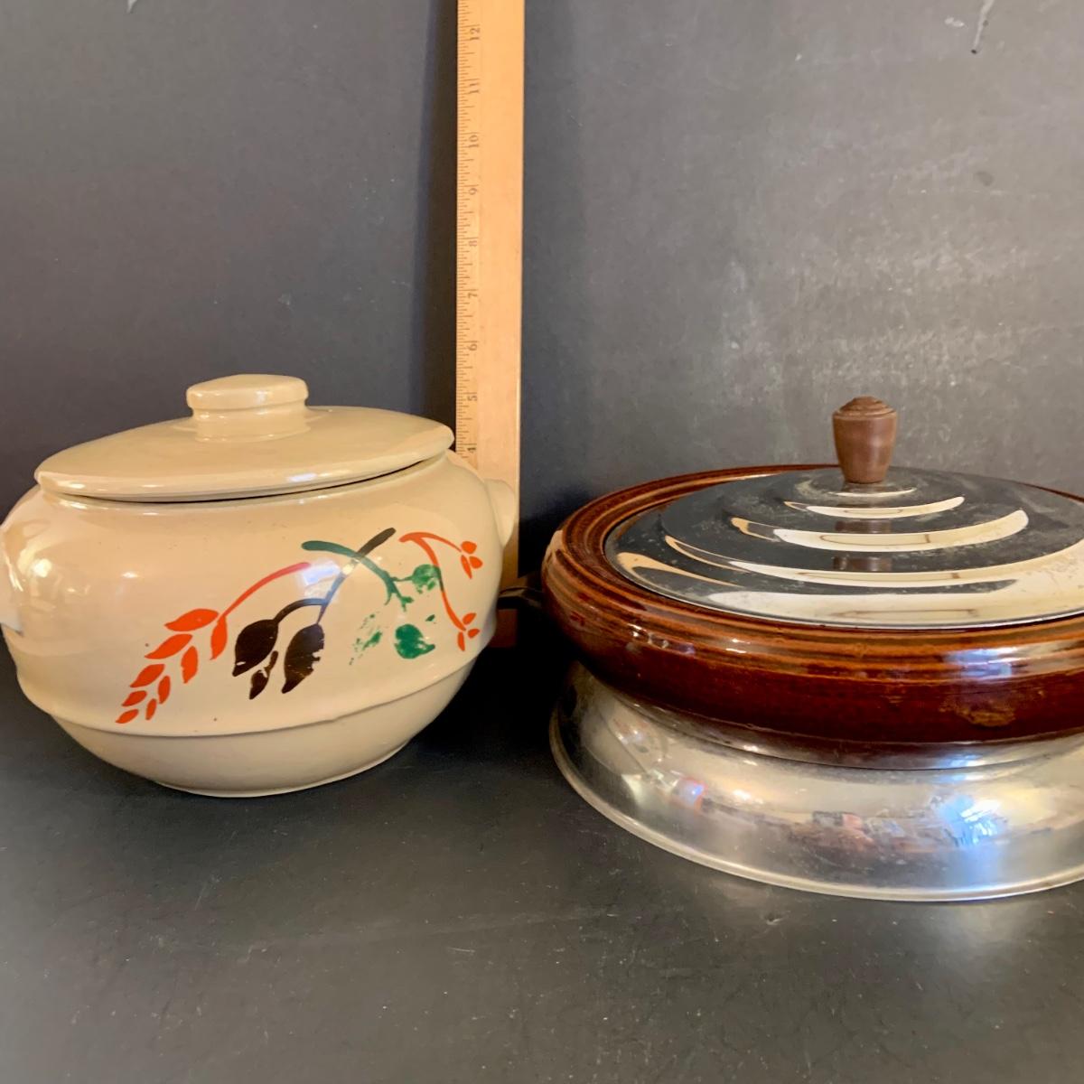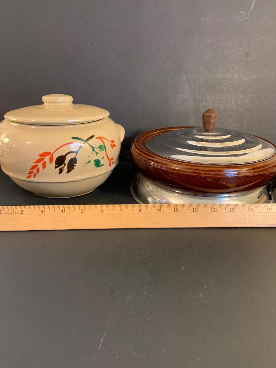 LOT:32G: Brown Betty Ceramic Bowl with Metal Base and Lid and Stoneware Bean Pot with Lid