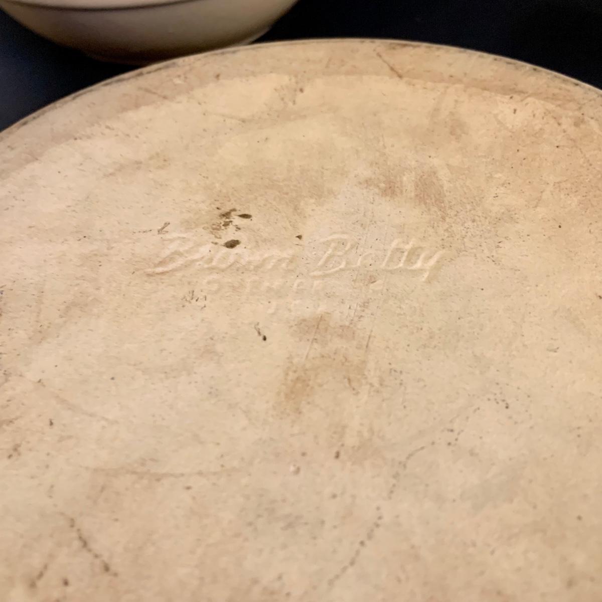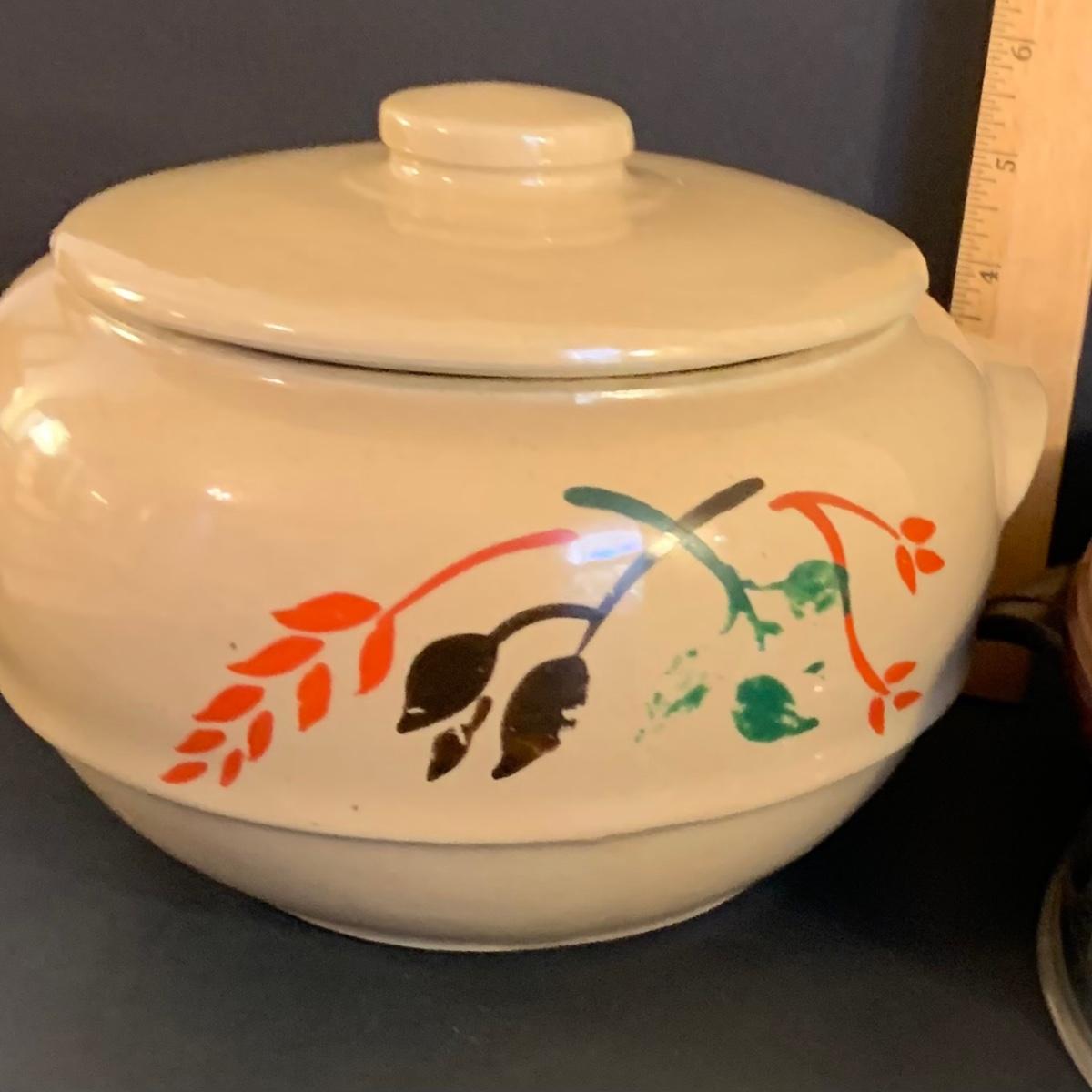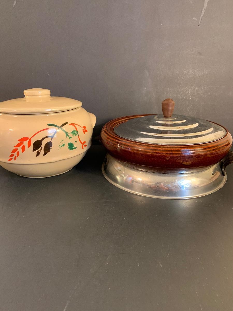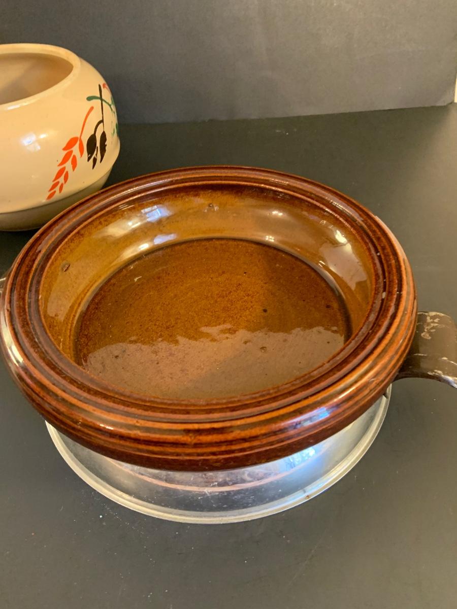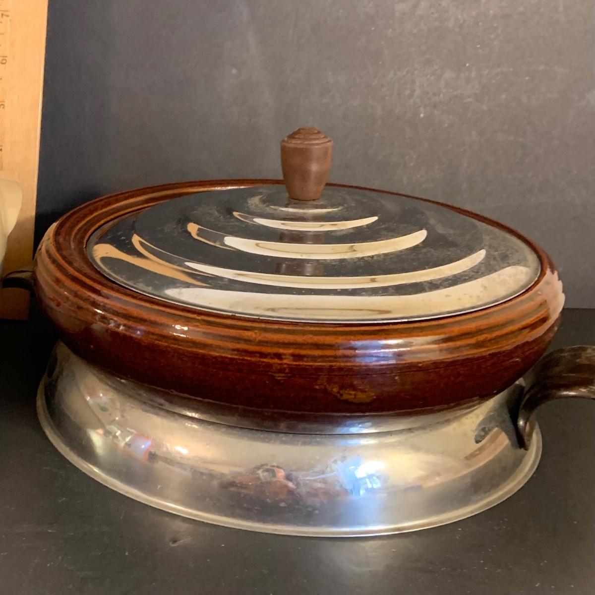 LOT:32G: Brown Betty Ceramic Bowl with Metal Base and Lid and Stoneware Bean Pot with Lid