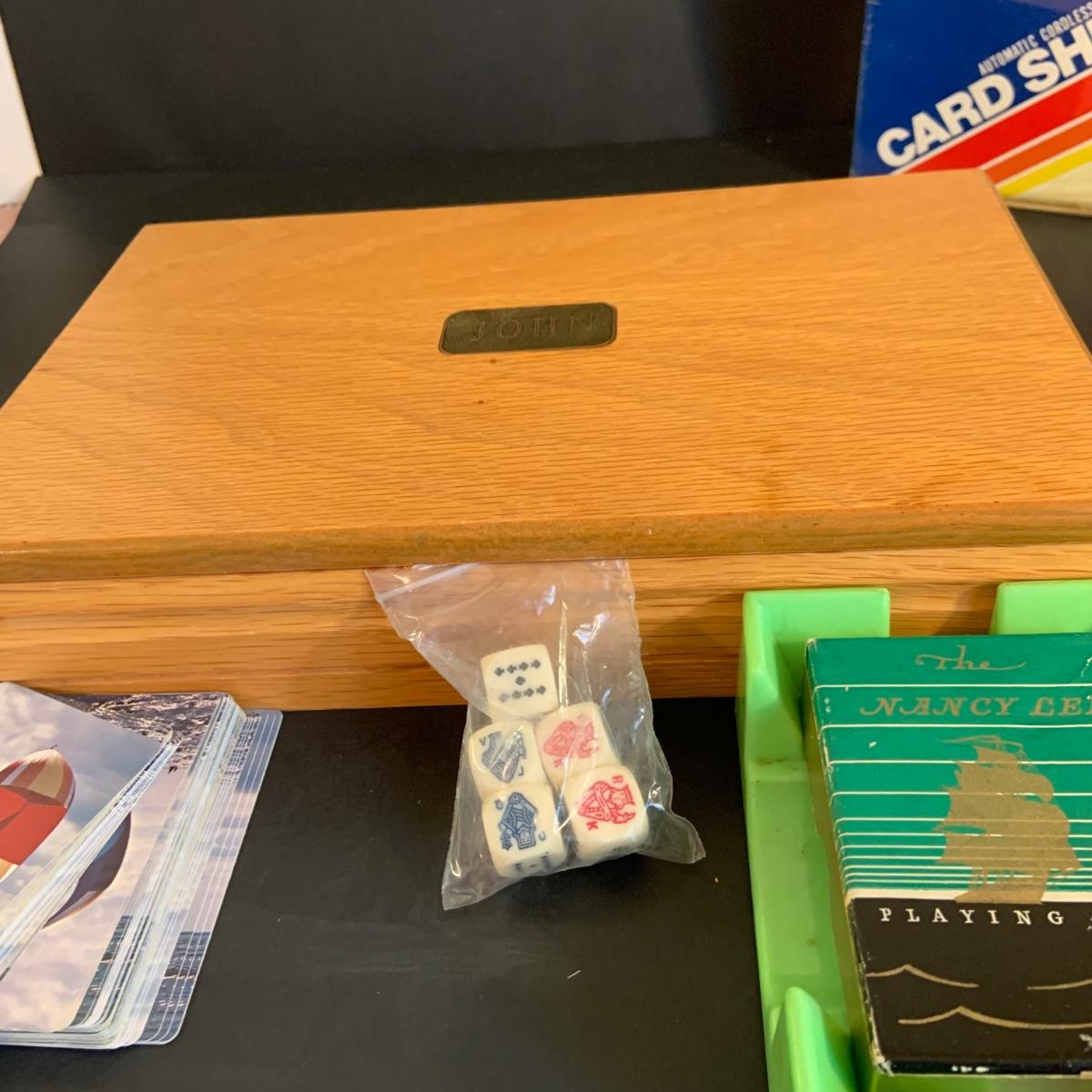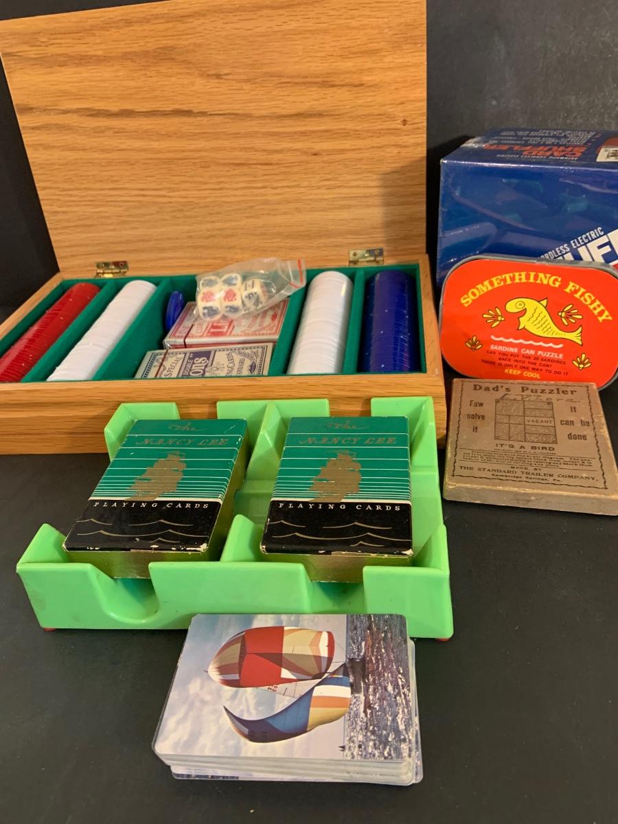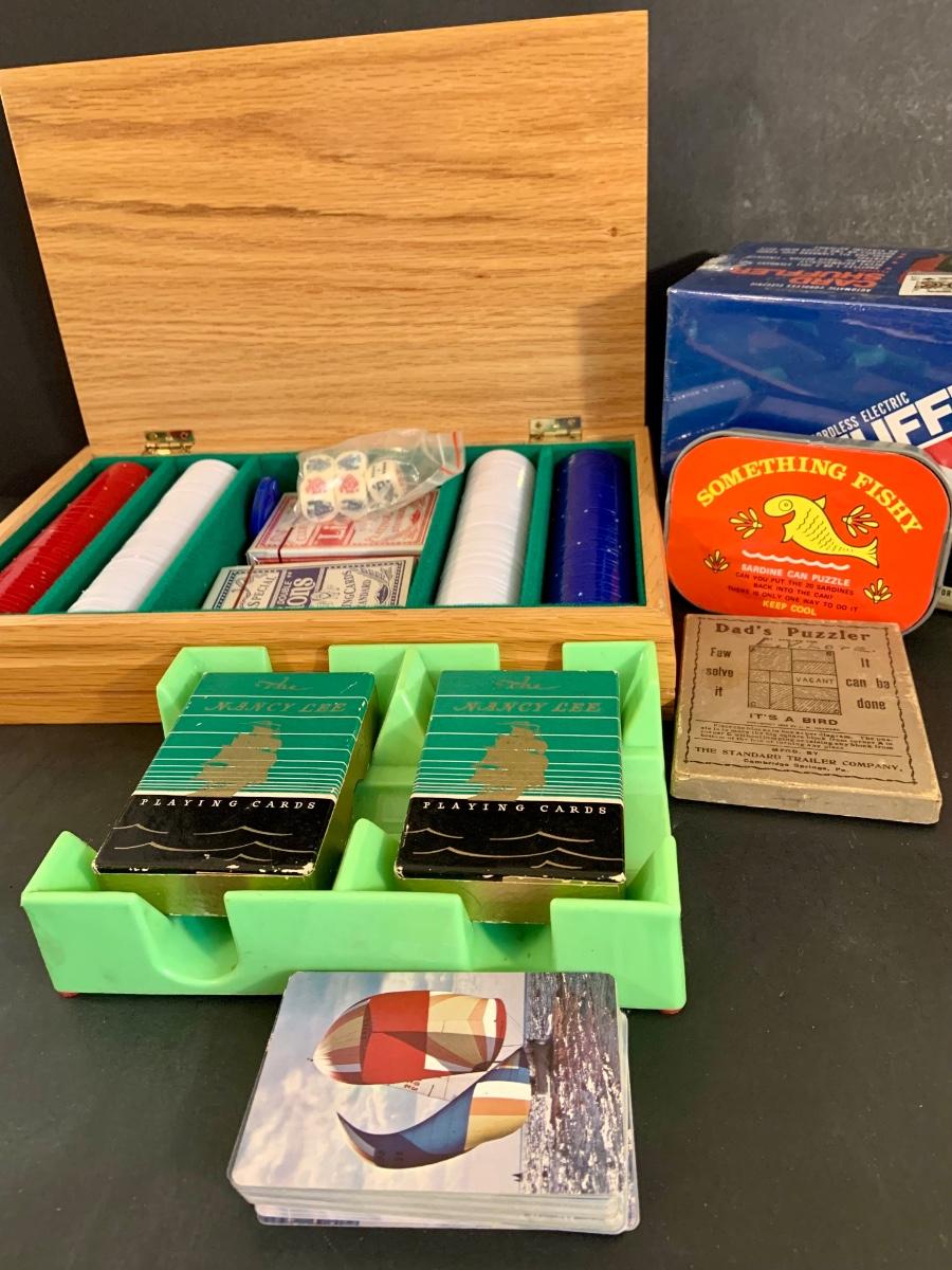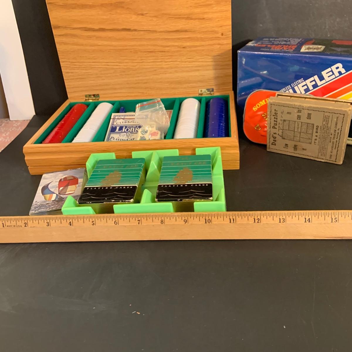 LOT:40G: Wooden Box with Poker Chips, Cards and Dice: Playing Cards, Vintage "Dad's Puzzle, Unopende Card Shuffler and More