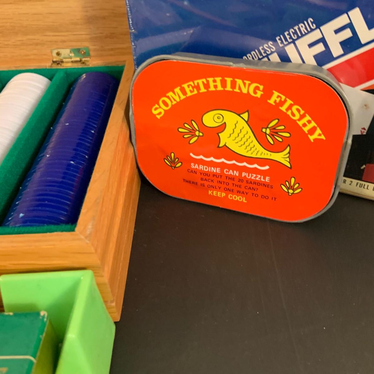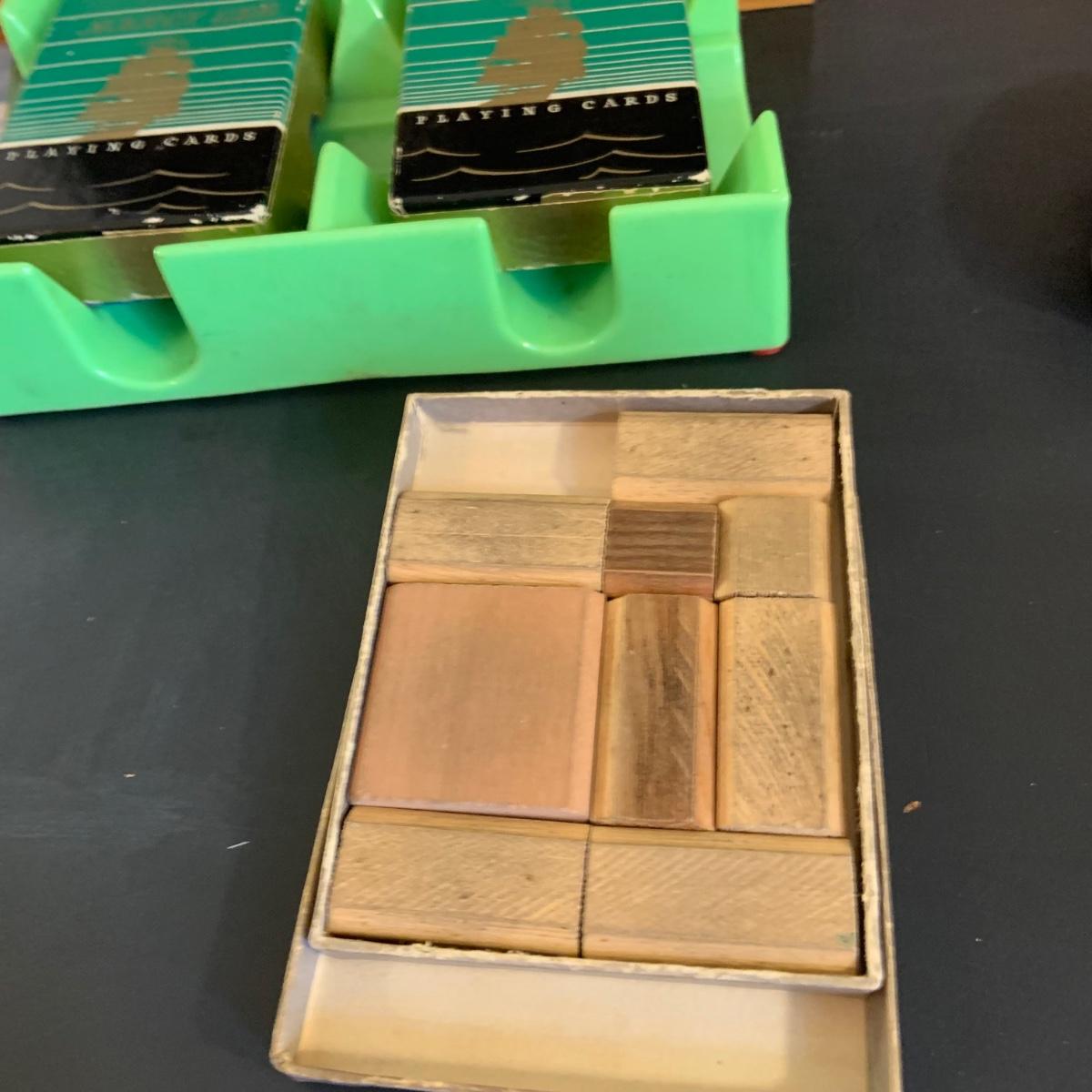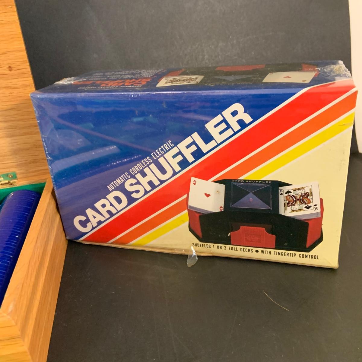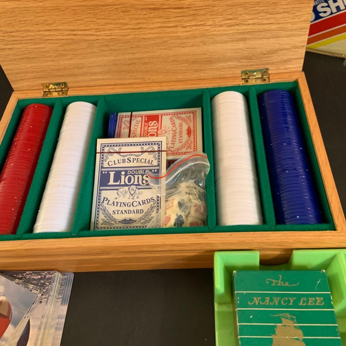 LOT:40G: Wooden Box with Poker Chips, Cards and Dice: Playing Cards, Vintage "Dad's Puzzle, Unopende Card Shuffler and More