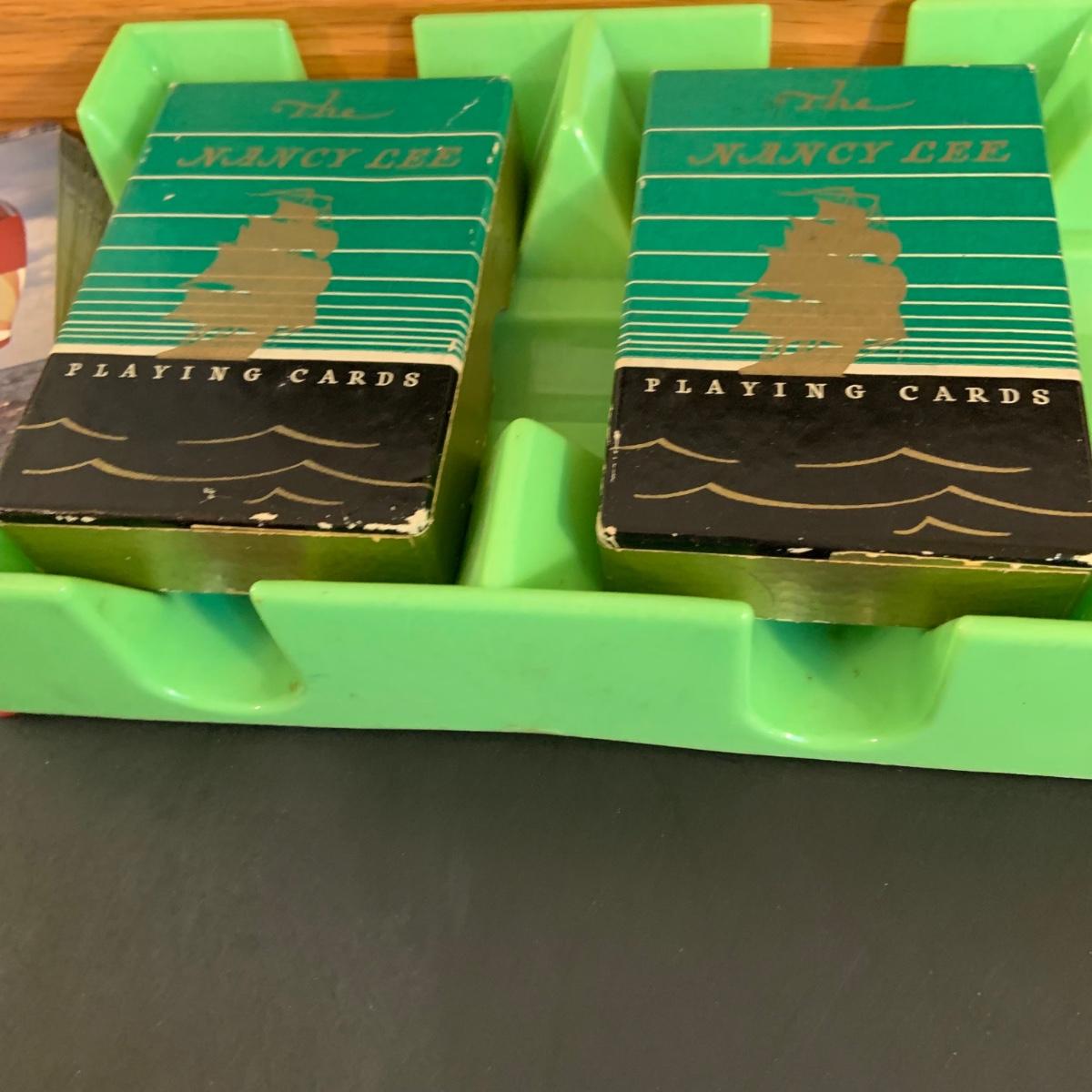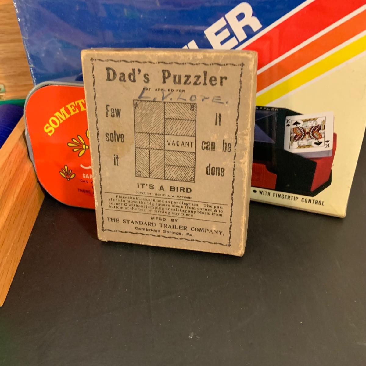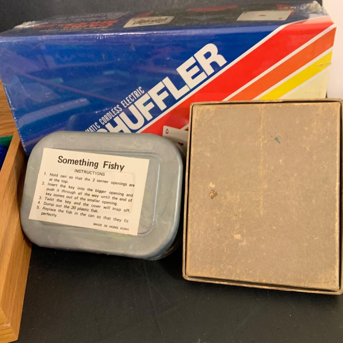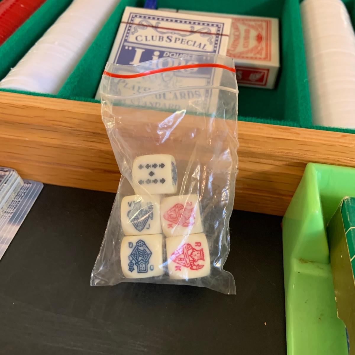 LOT:40G: Wooden Box with Poker Chips, Cards and Dice: Playing Cards, Vintage "Dad's Puzzle, Unopende Card Shuffler and More