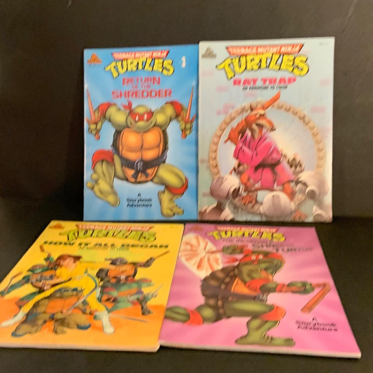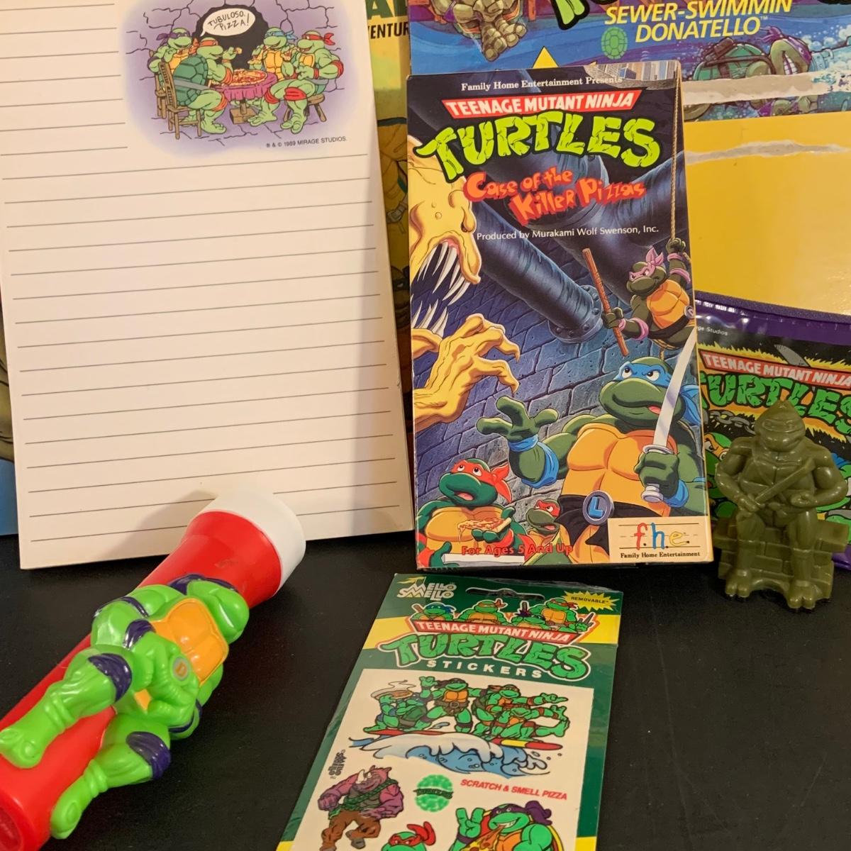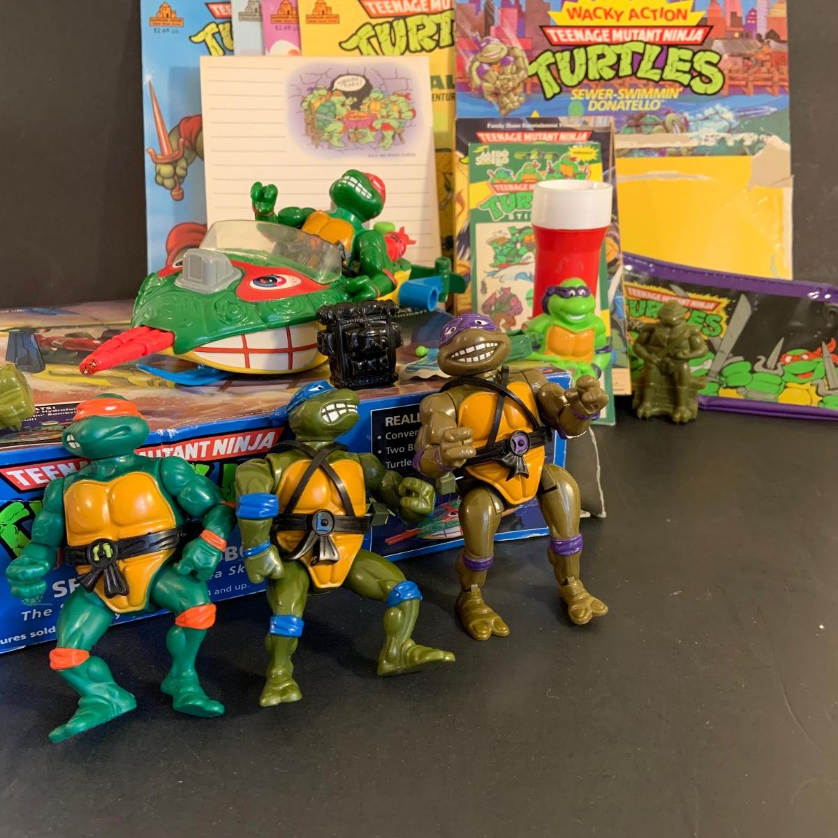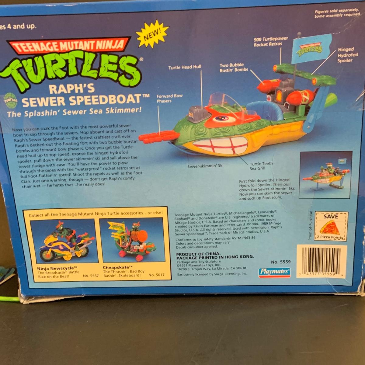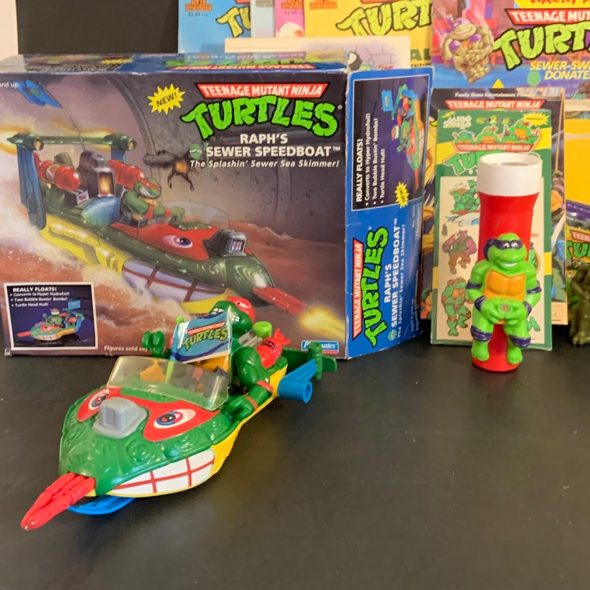 LOT:43G: Teenage Mutan Ninja Turtles Acton Figures, Raph's Sewer Speedboat, Cardbacks, VHS, Books and More