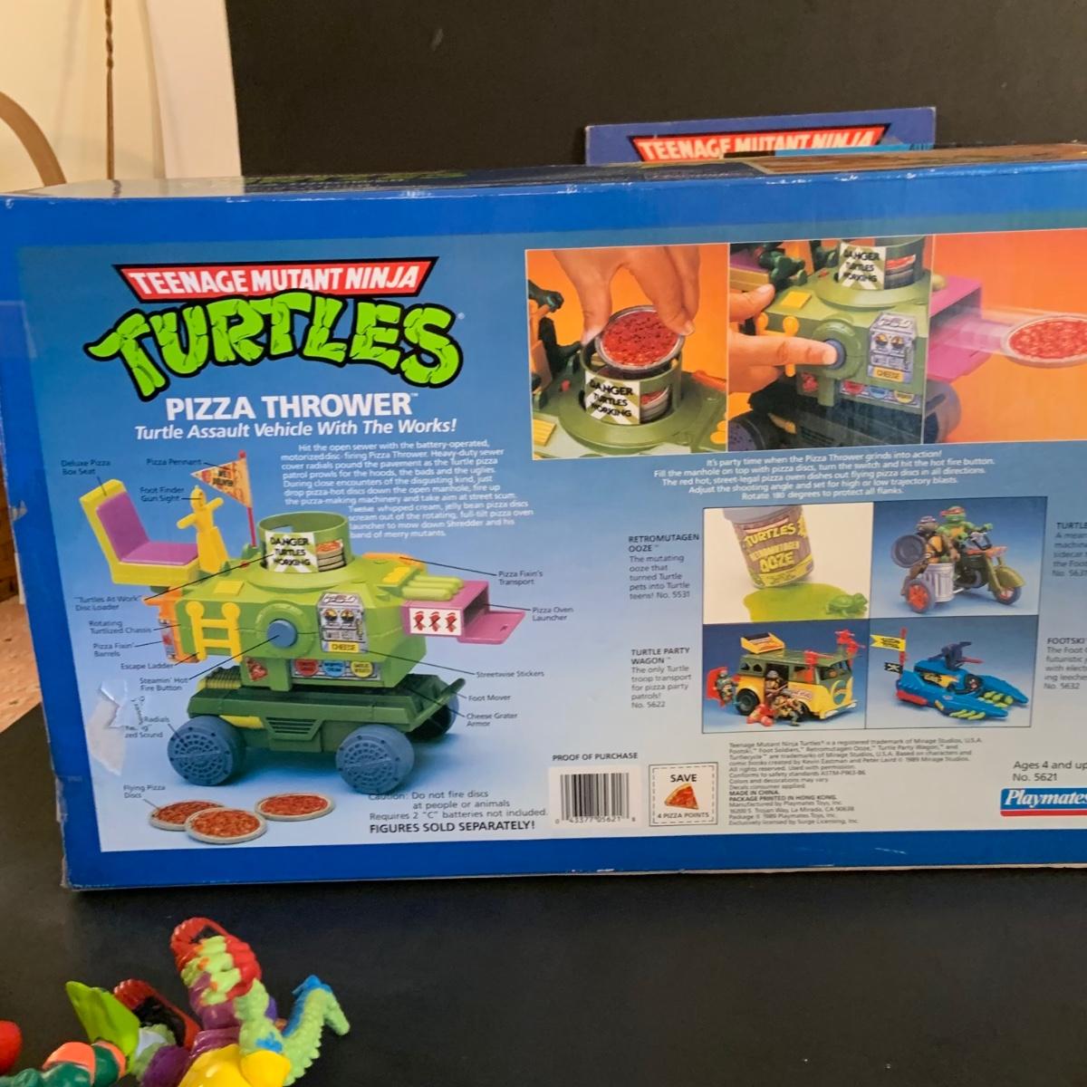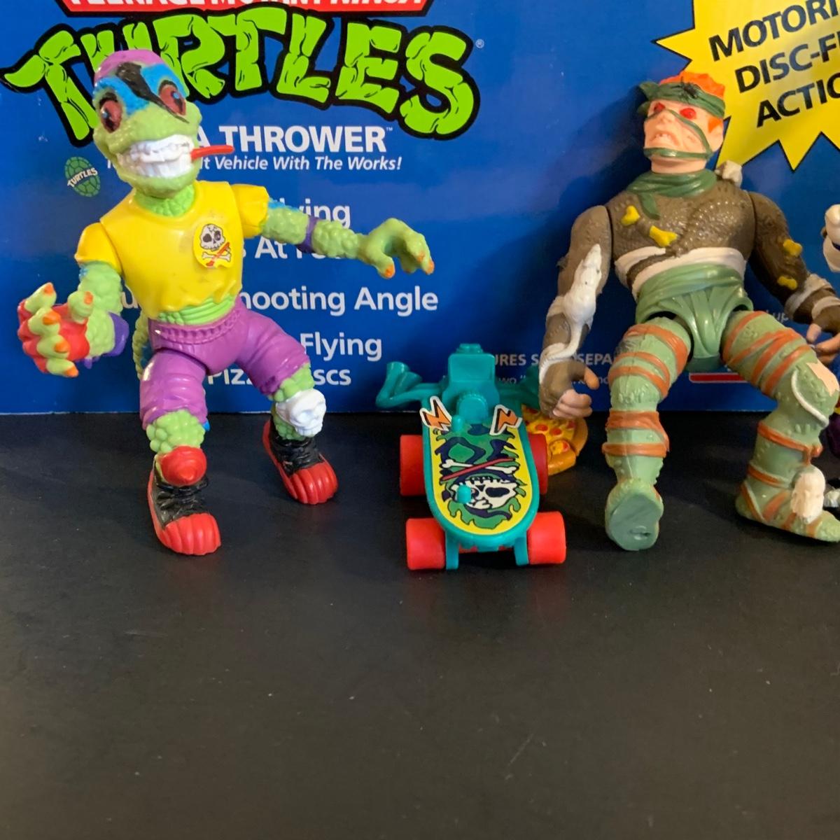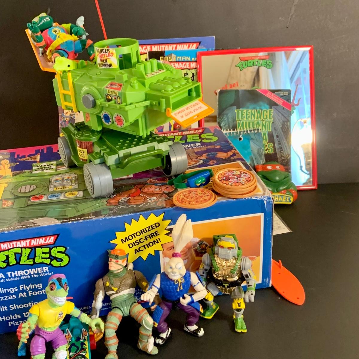 LOT:44G: Teenage Mutan Ninja Turtles - Villians and Other Action Figures, Pizza Thrower Vehicle with Original Box Card Backs, Books and More