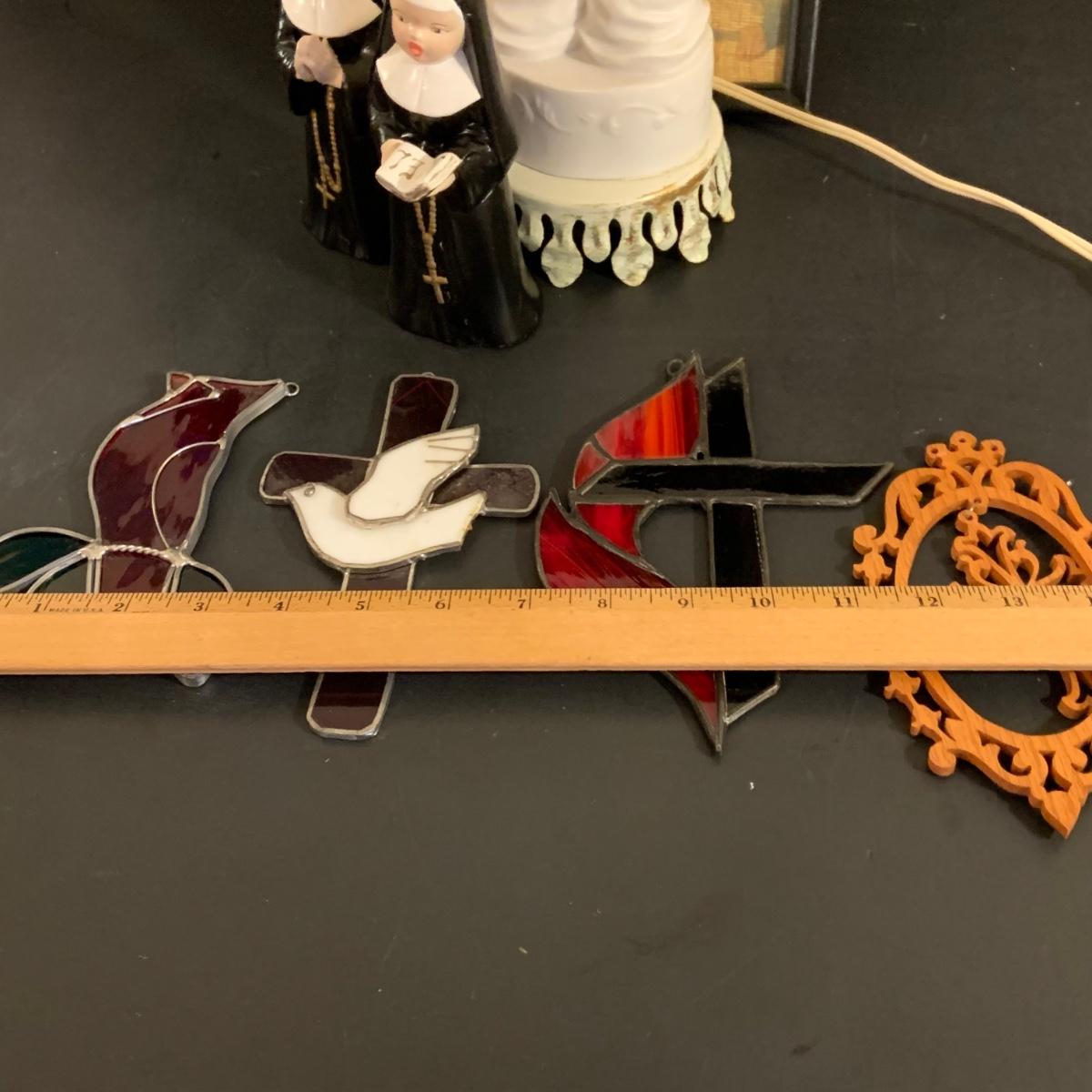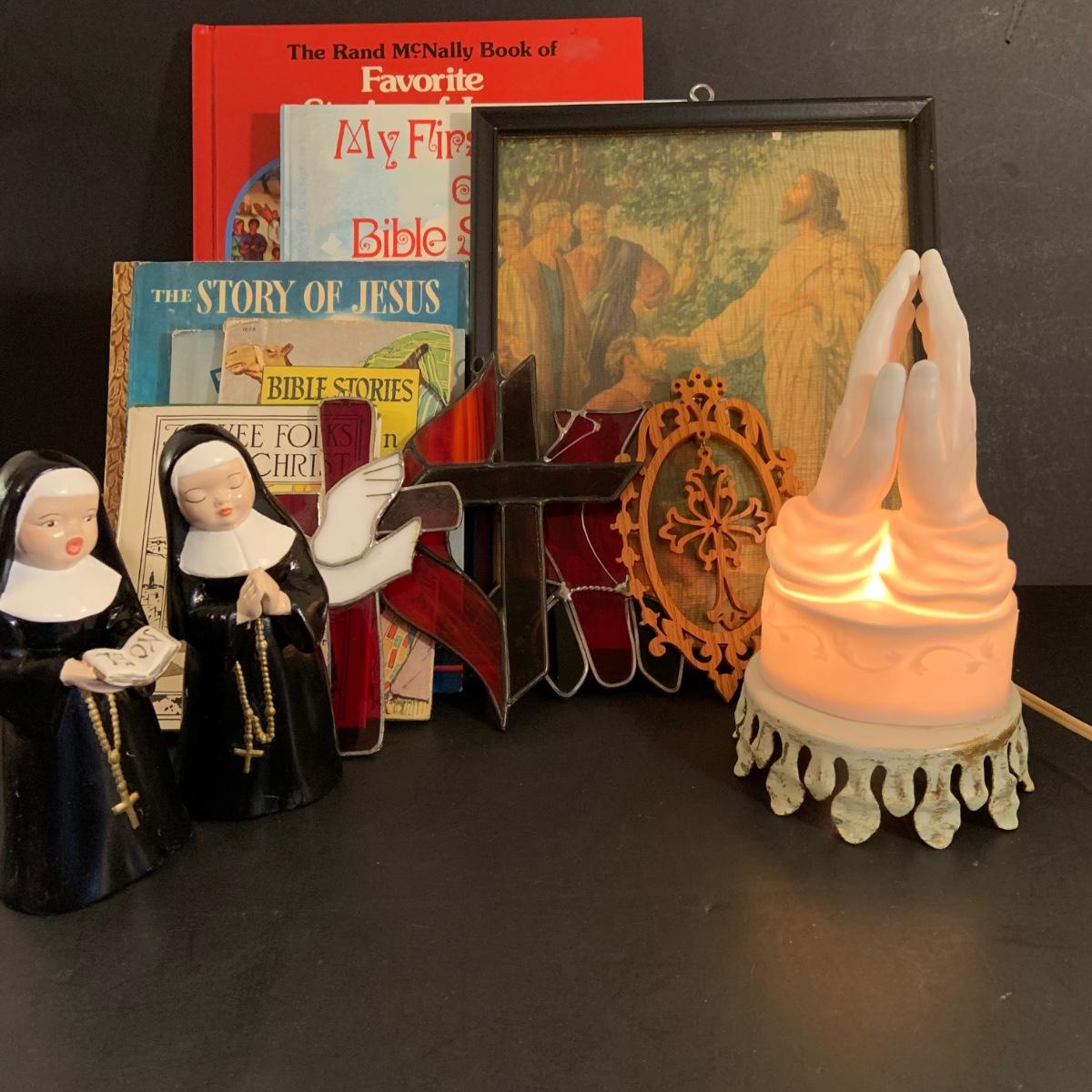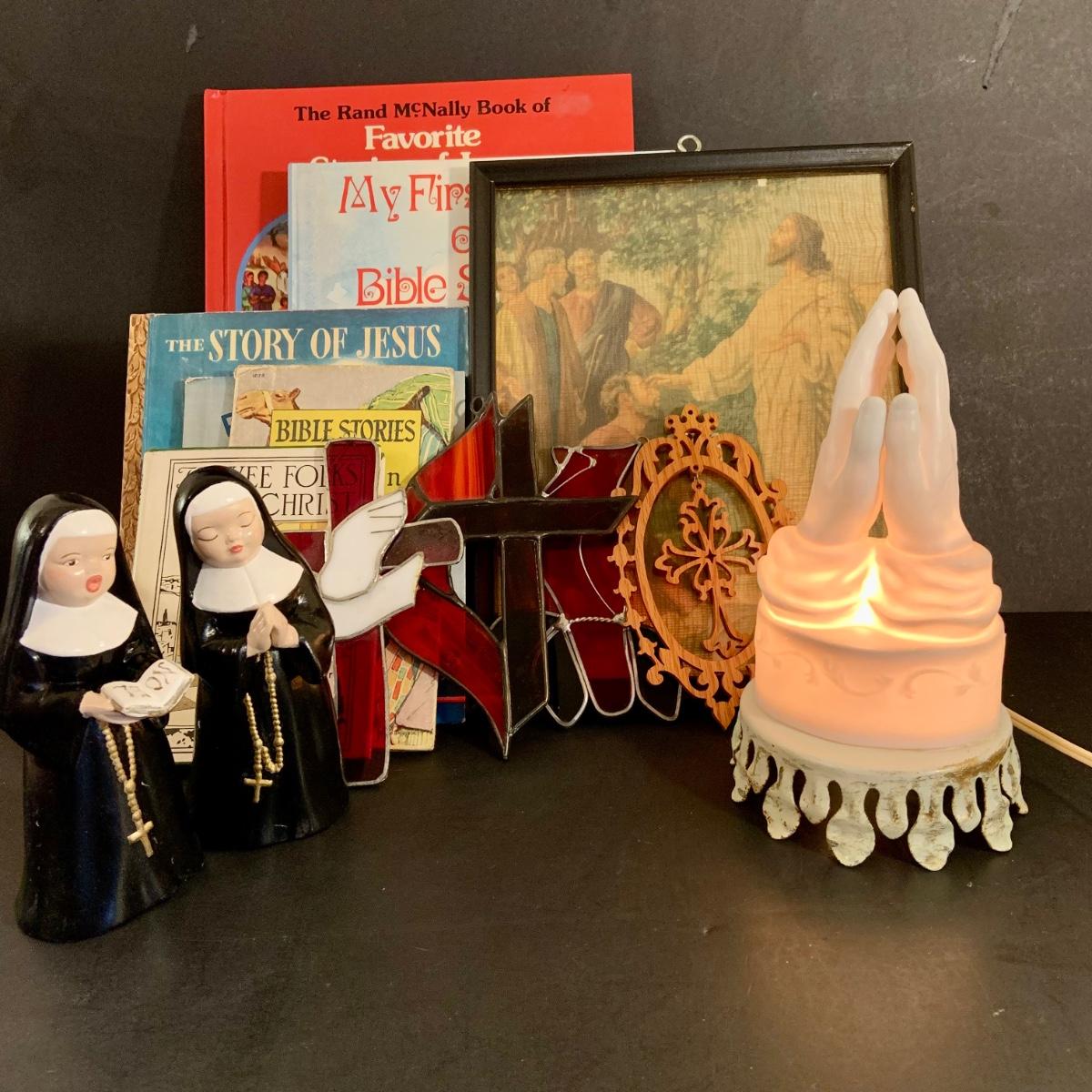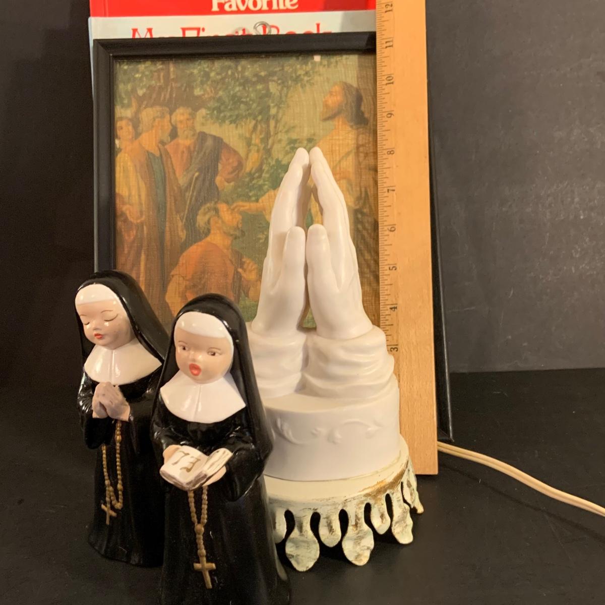 LOT47G:: Collection of Religious Children's Books, Stain Glass, Ceramic Nuns, Cloth Picture, and Praying Hand Electric Lamp and More