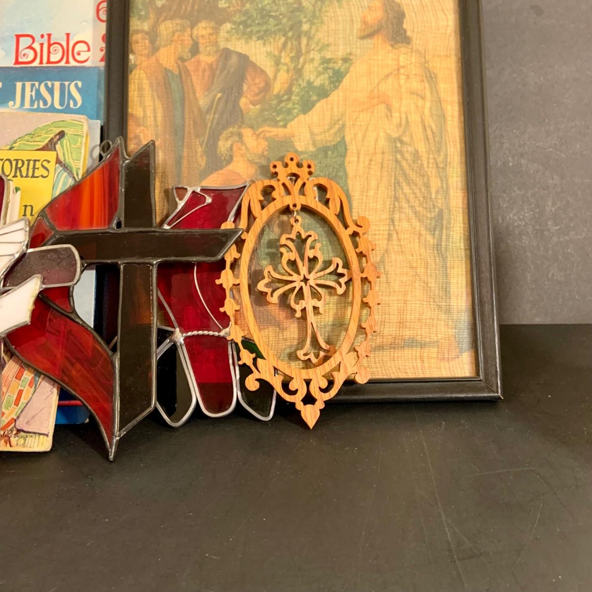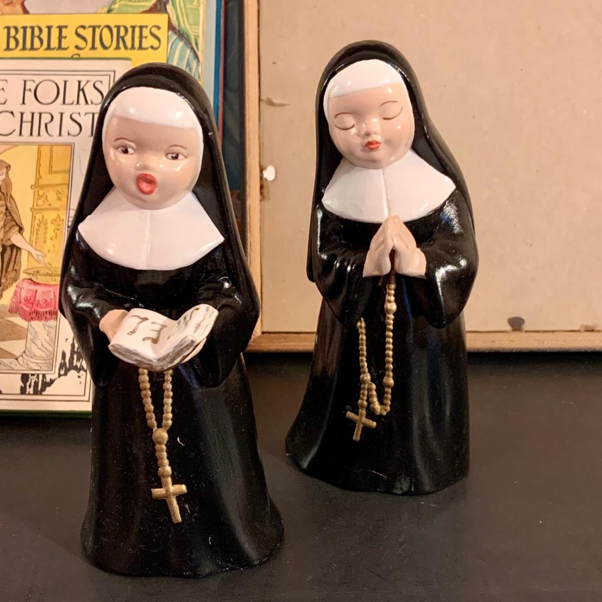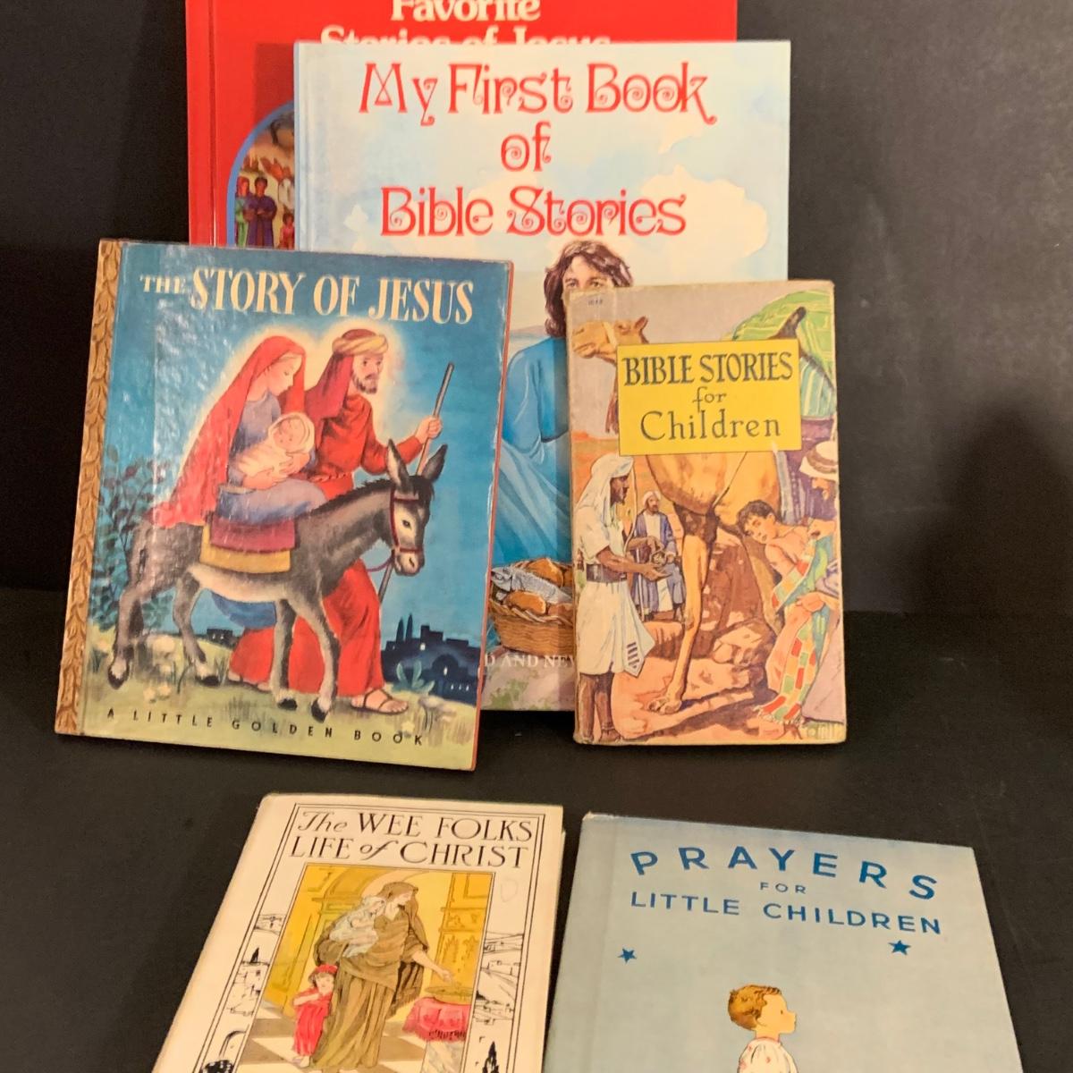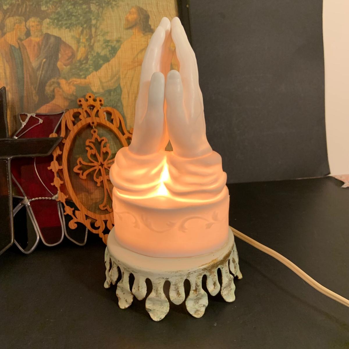 LOT47G:: Collection of Religious Children's Books, Stain Glass, Ceramic Nuns, Cloth Picture, and Praying Hand Electric Lamp and More