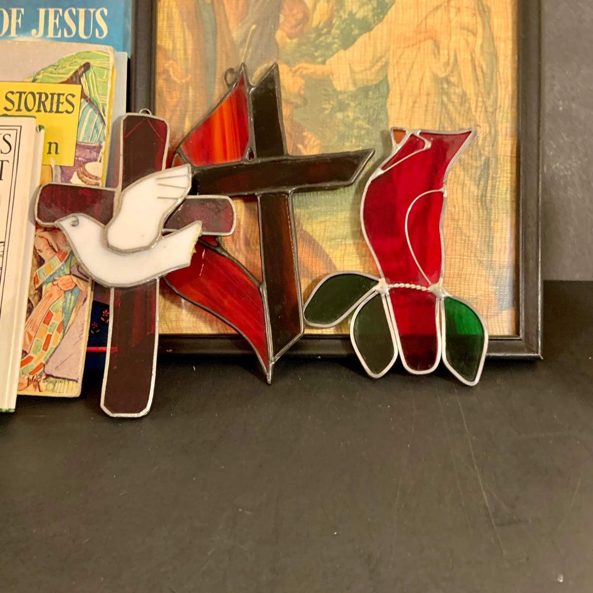LOT47G:: Collection of Religious Children's Books, Stain Glass, Ceramic Nuns, Cloth Picture, and  Praying Hand Electric Lamp and More
