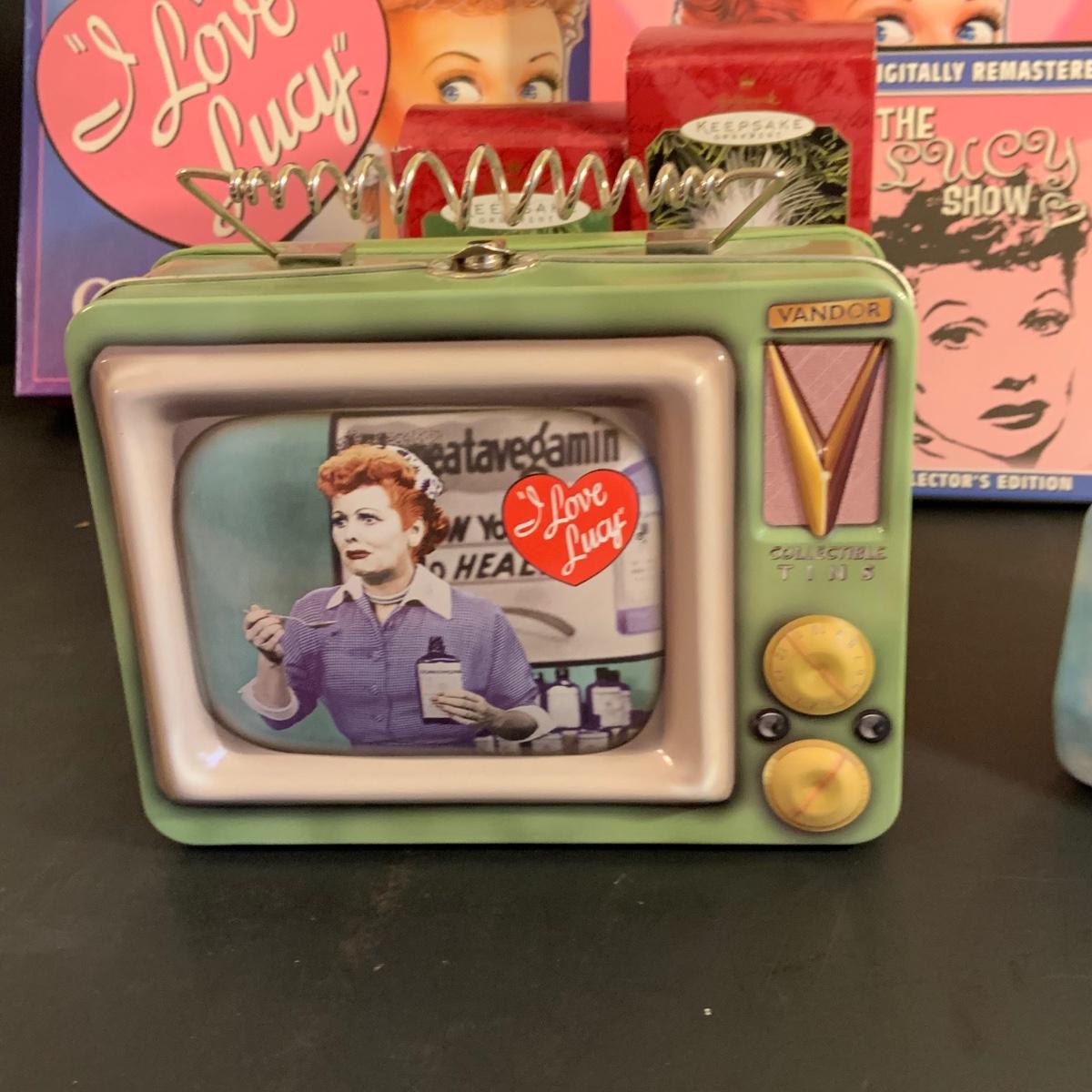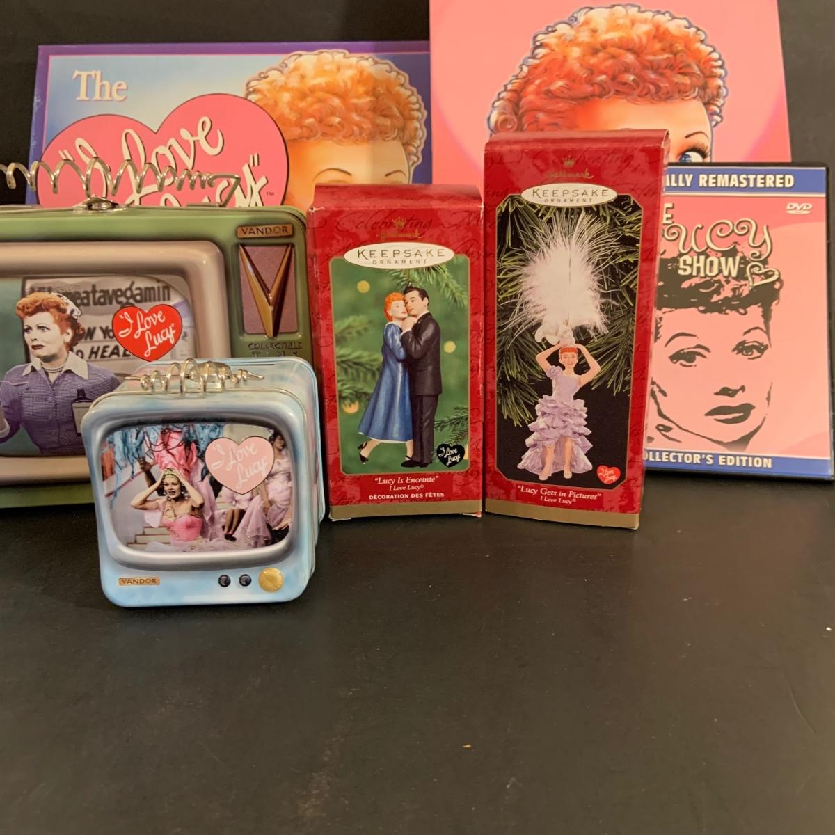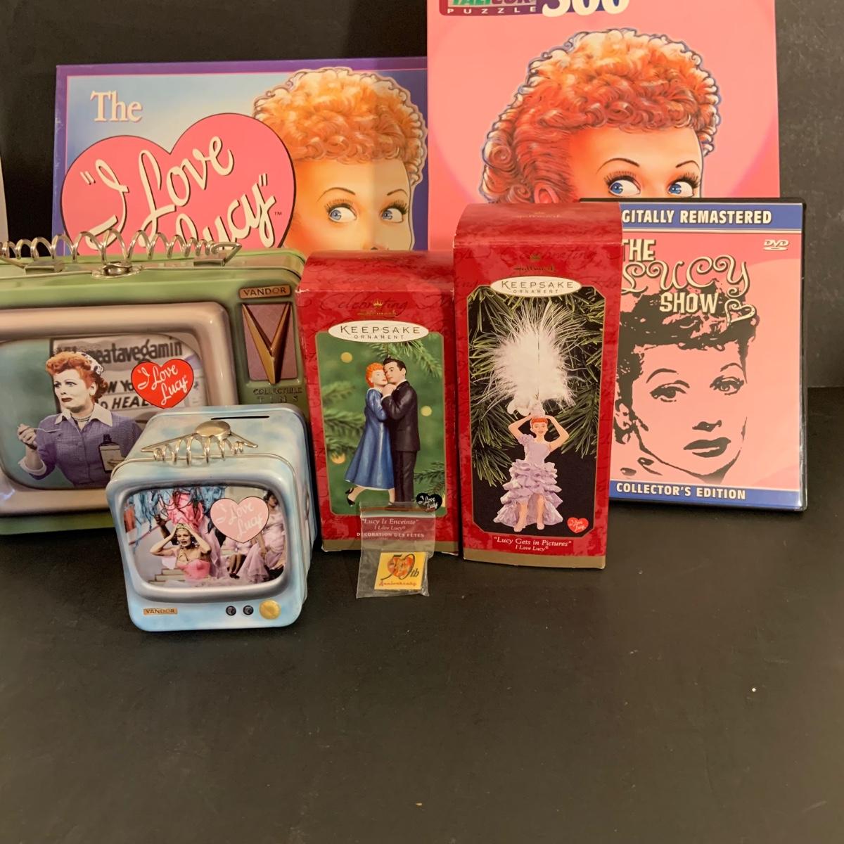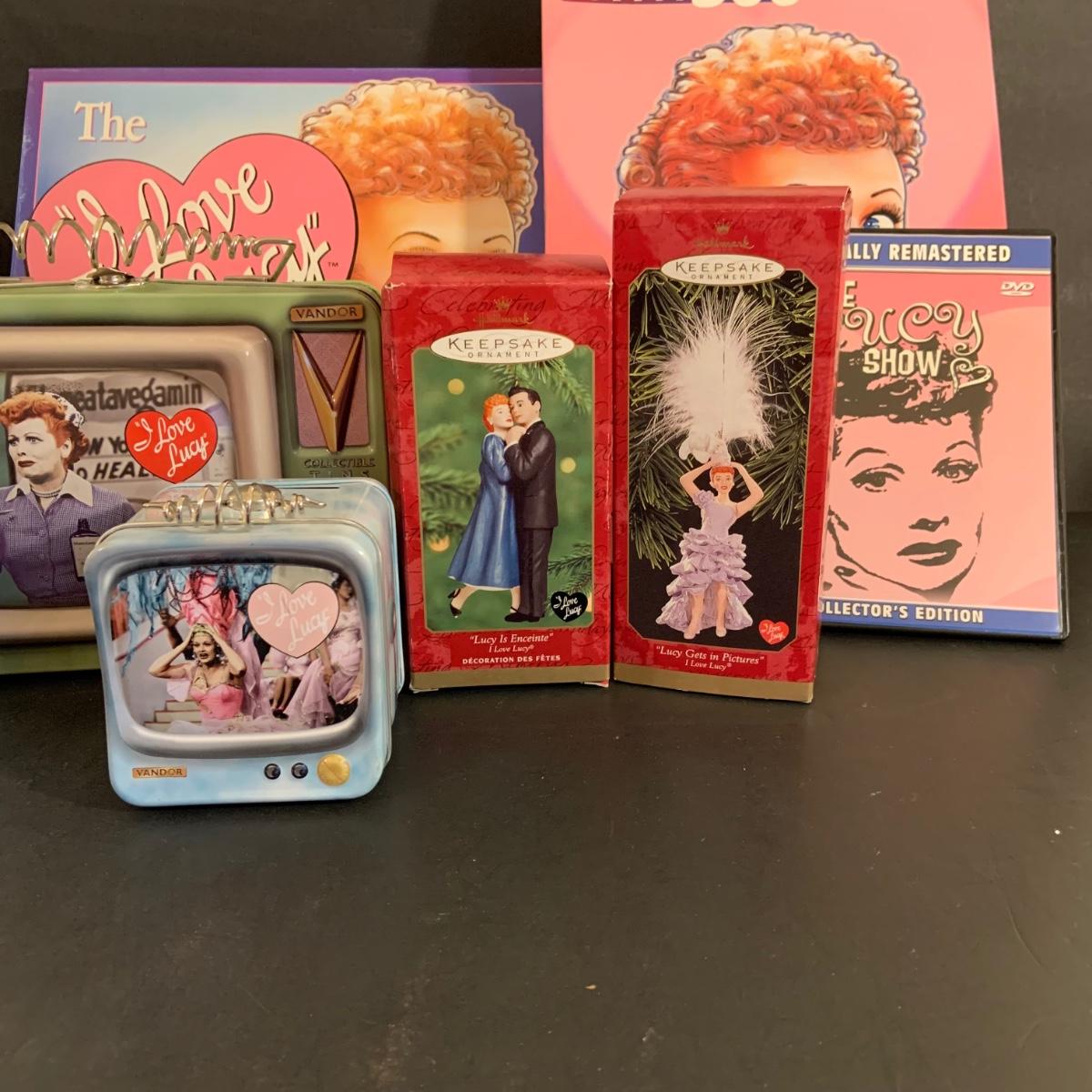 LOT:50G: Collection of "I Love Lucy" Memobellia Including Tins, Ornaments, Puzzle, Game and DVD.