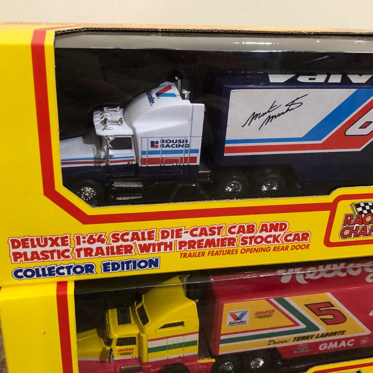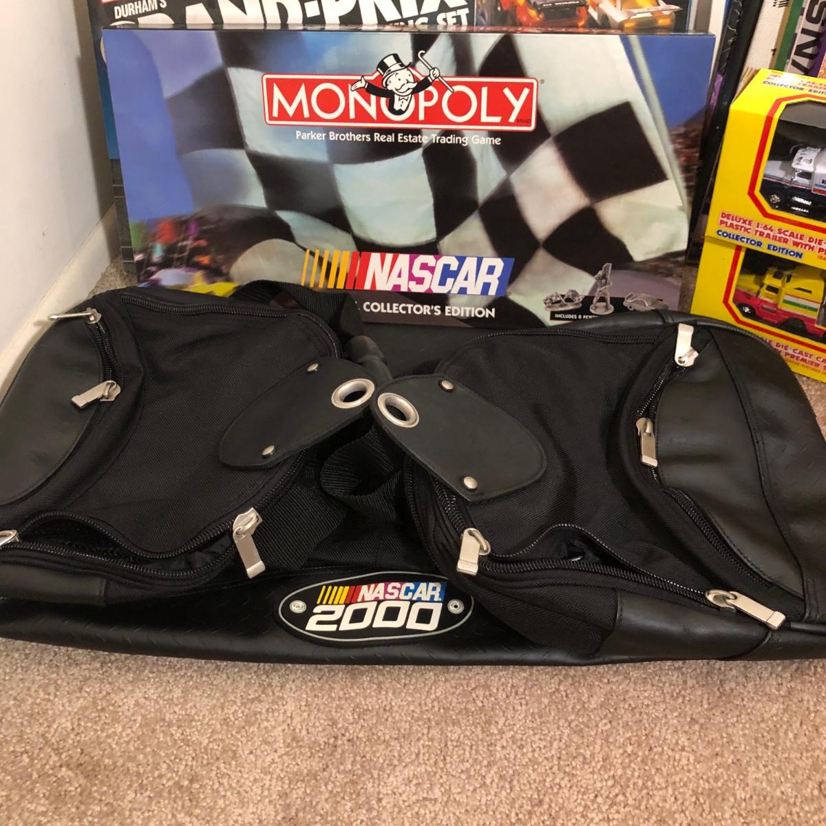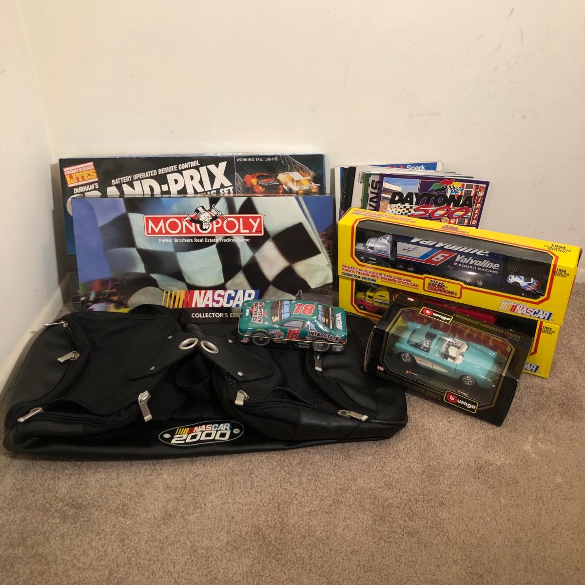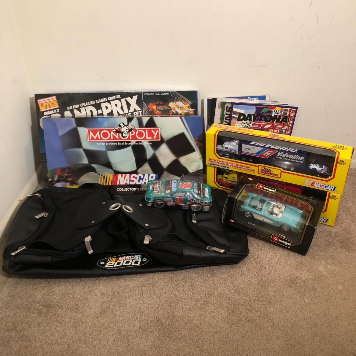 LOT 95M: NASCAR & Racing Collection - Duffel Bag, Monopoly, 1:64 Scale Die Cast Trailers in Boxes (Valvoline & Kellogg's) & More