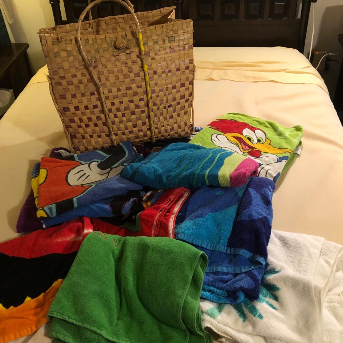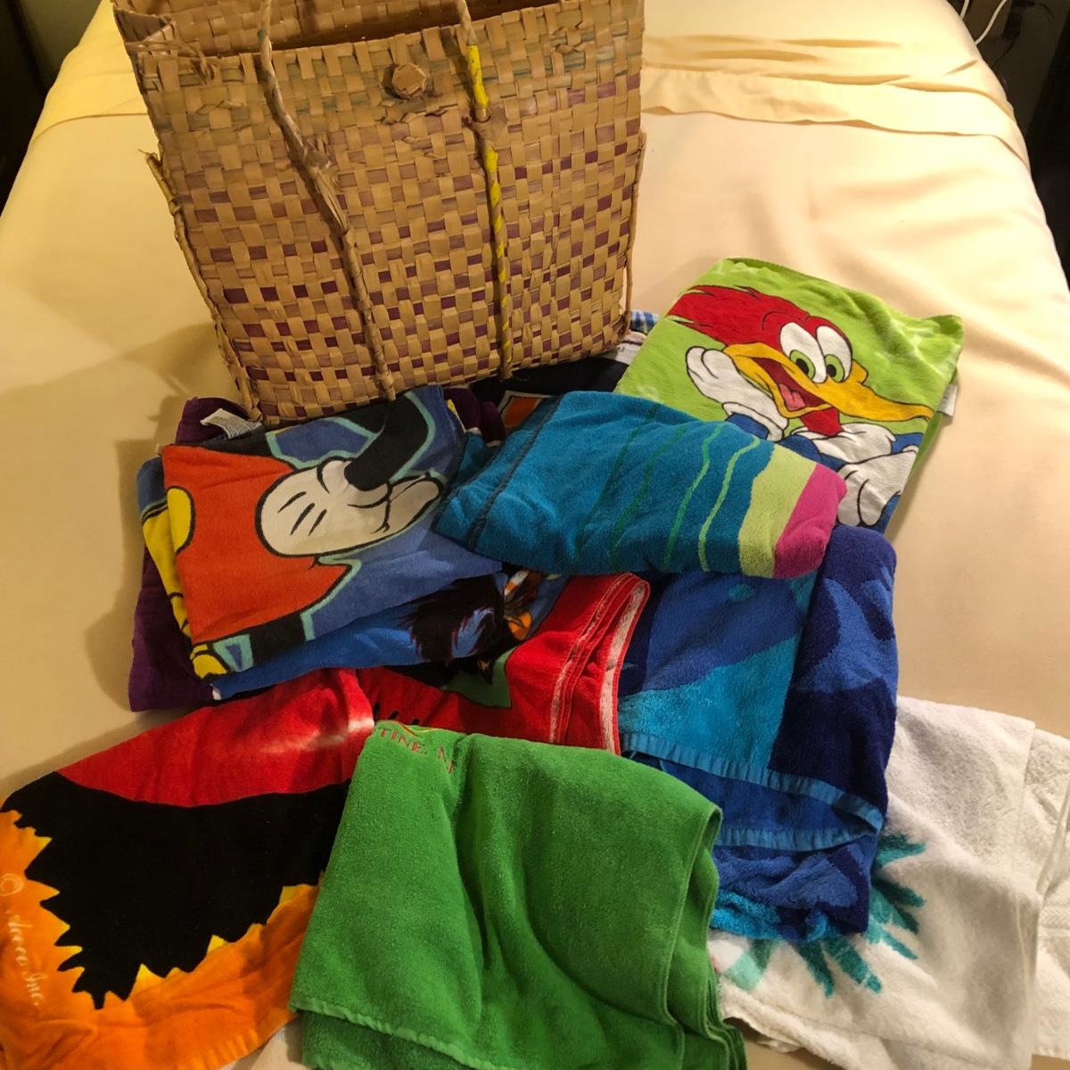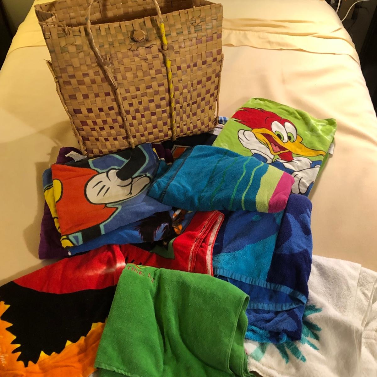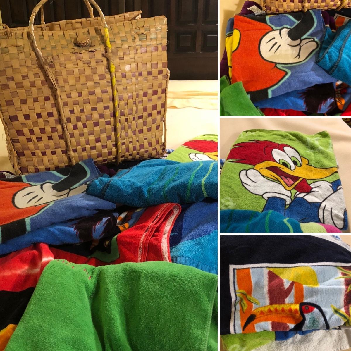 LOT 108M: Beach Towel Assortment w/ Straw Bag - Mickey Mouse, Woody Woodpecker, Toucan & More