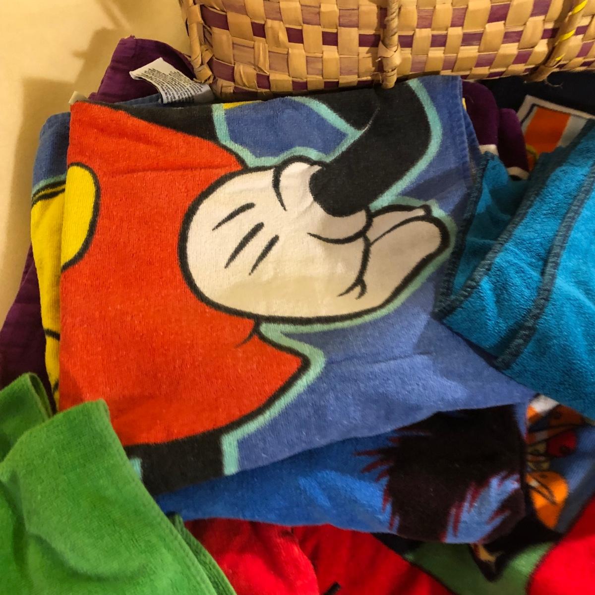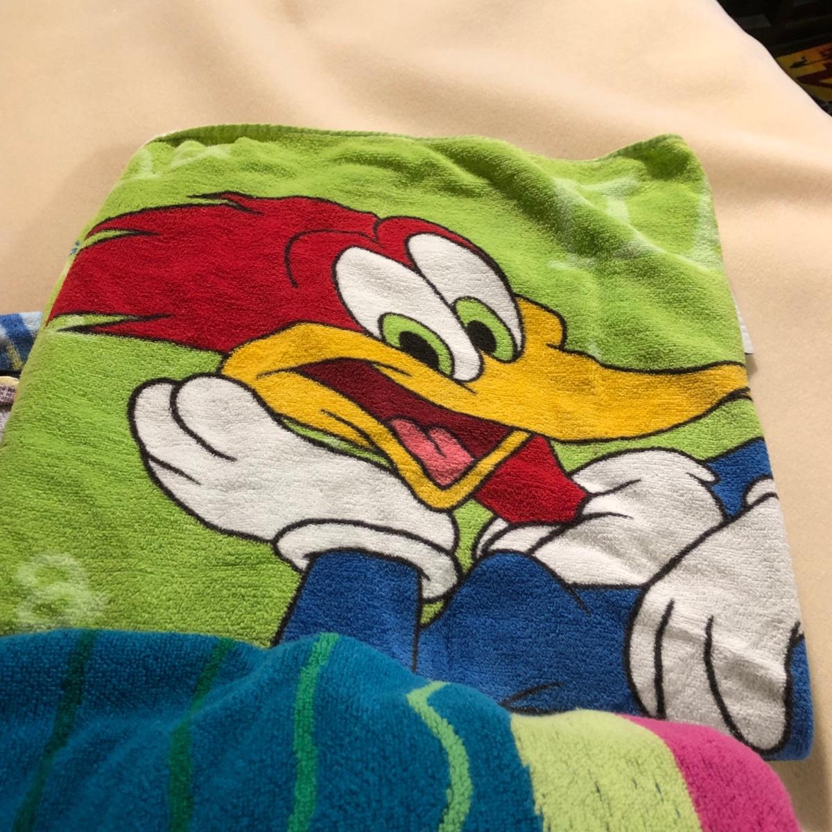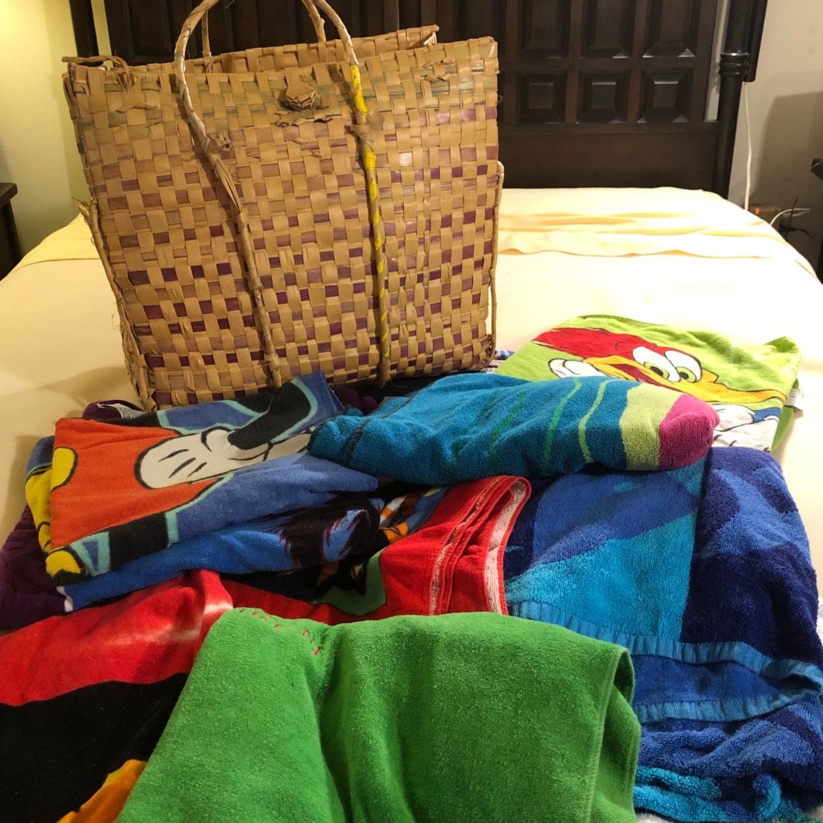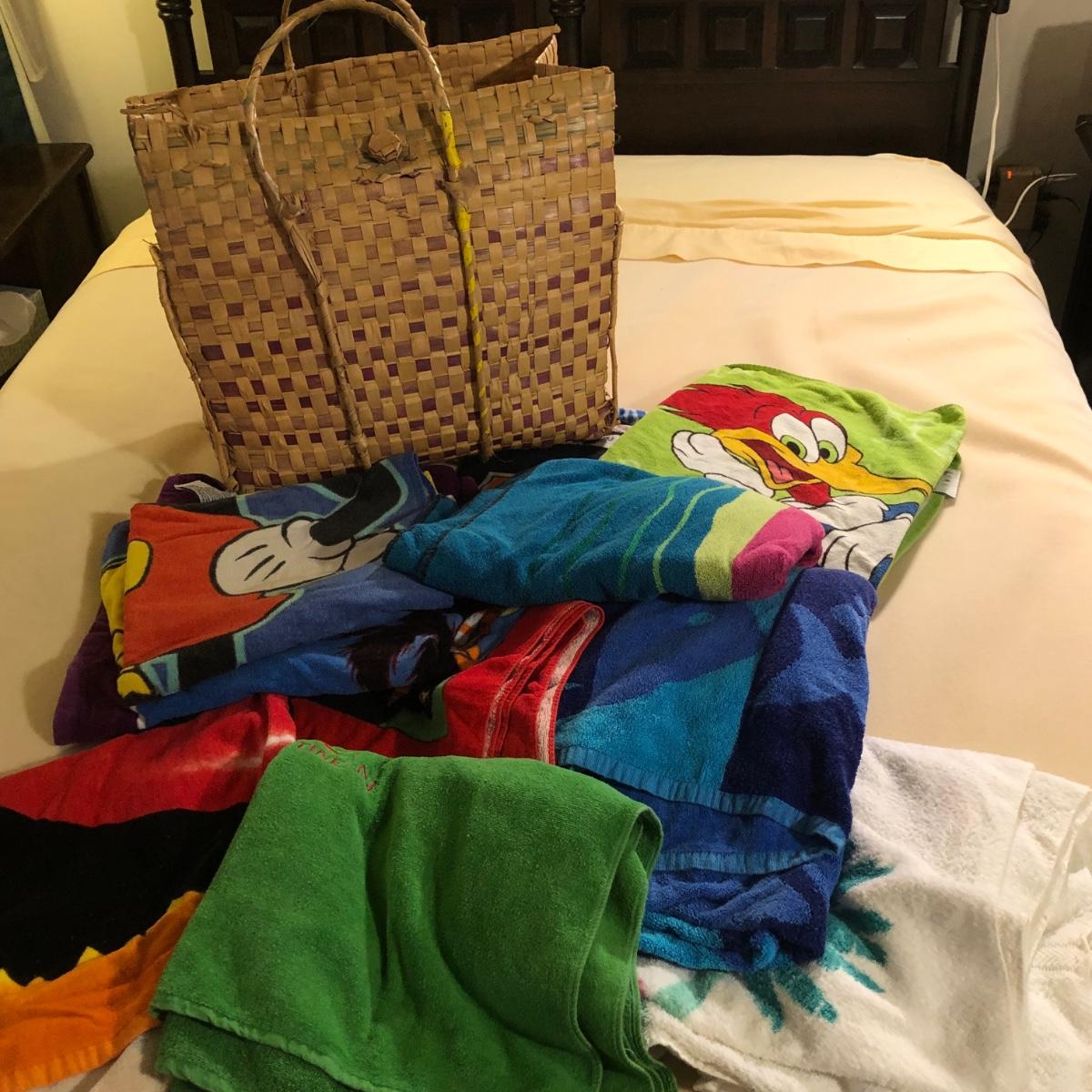 LOT 108M: Beach Towel Assortment w/ Straw Bag - Mickey Mouse, Woody Woodpecker, Toucan & More